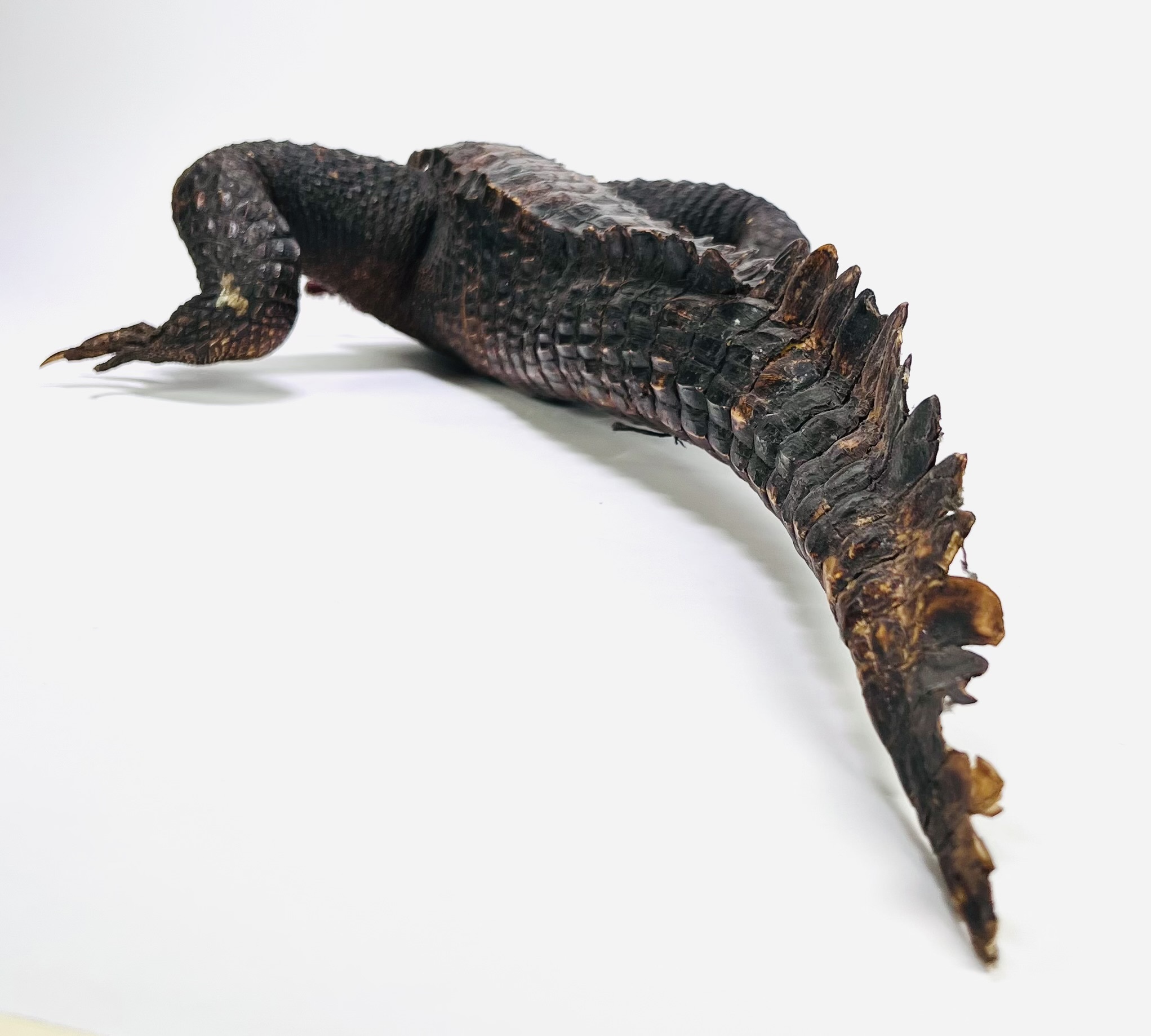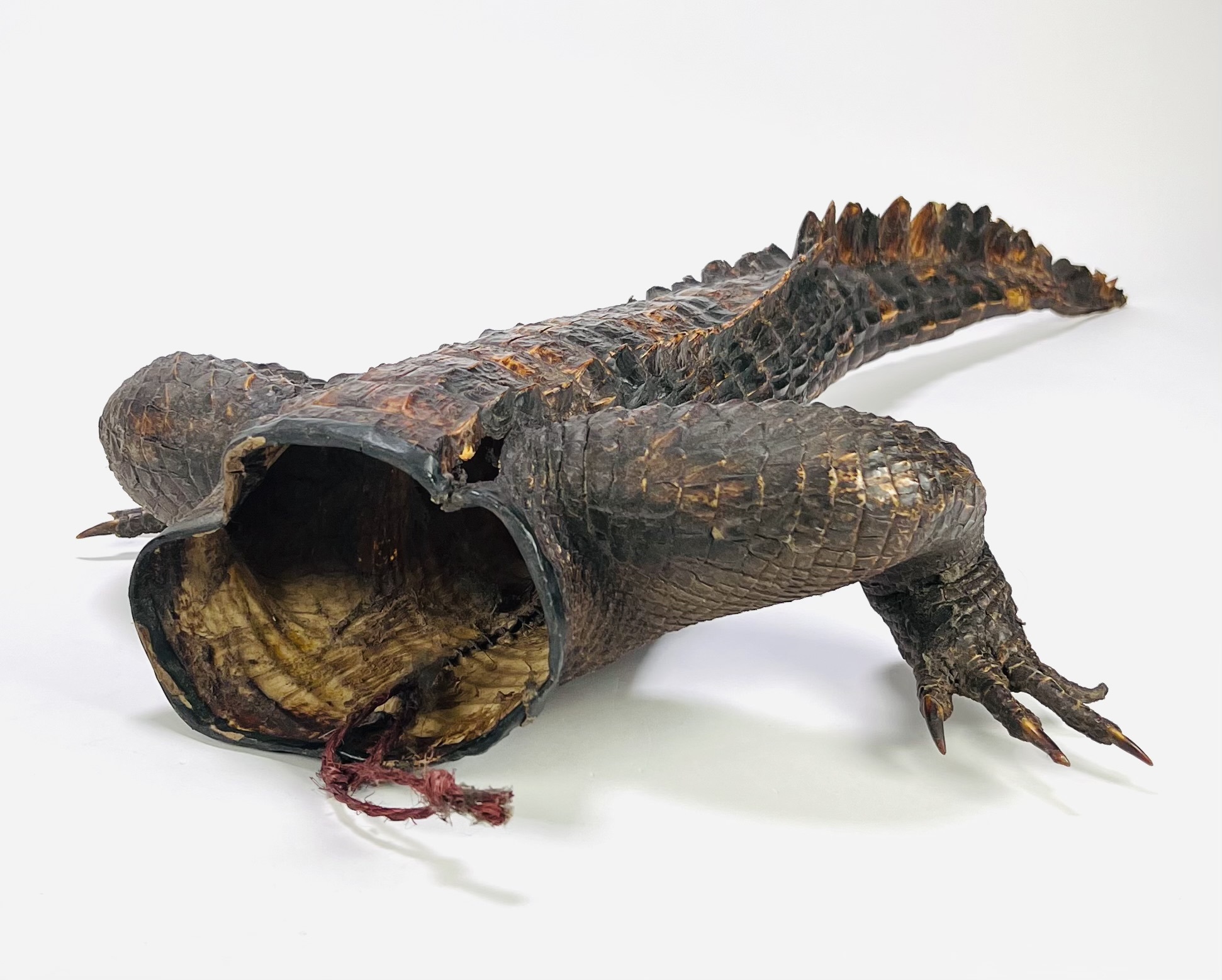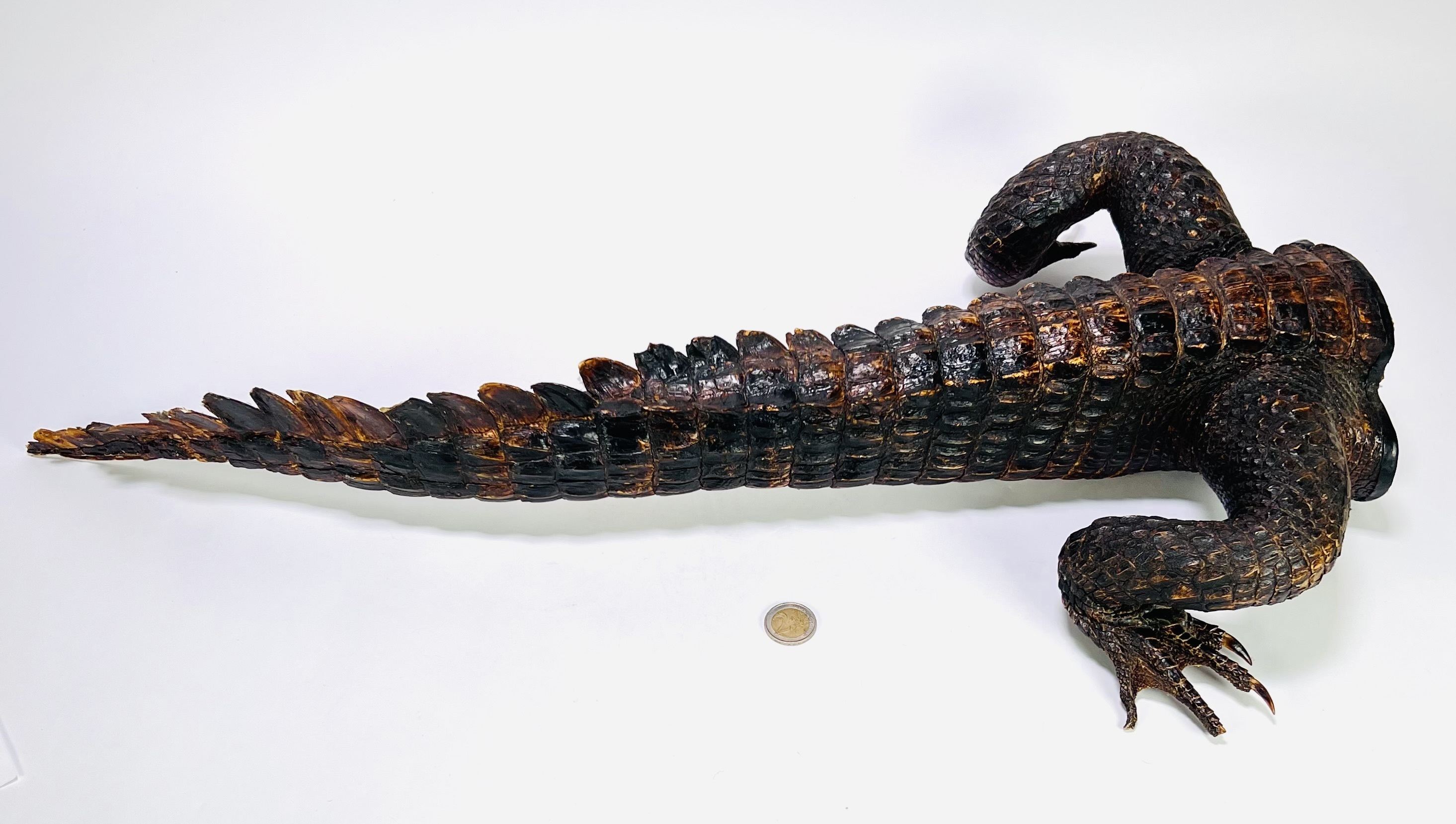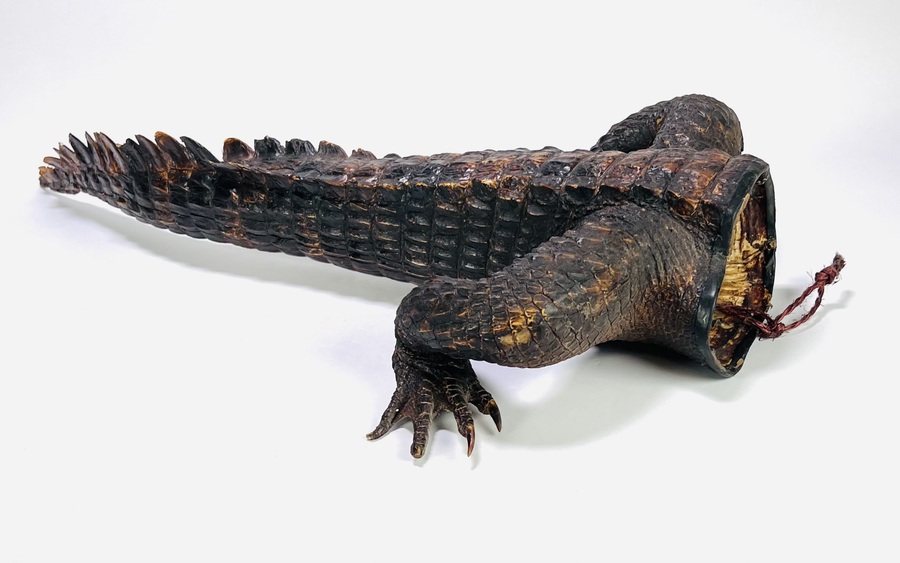 Onderlichaam en de staart van een krokodil, daterend uit de midden 20e eeuw. Geprepareerde reptielhuid met een ruwe, donkerbruine tot zwarte kleur en een uitgesproken schubbenpatroon. De herkomst is Afrika of Zuid-Amerika. Geïnteresseerd? Bezoek onze kijkdagen op 28, 29 of 30 november van 11:00 tot 17:00 uur! |