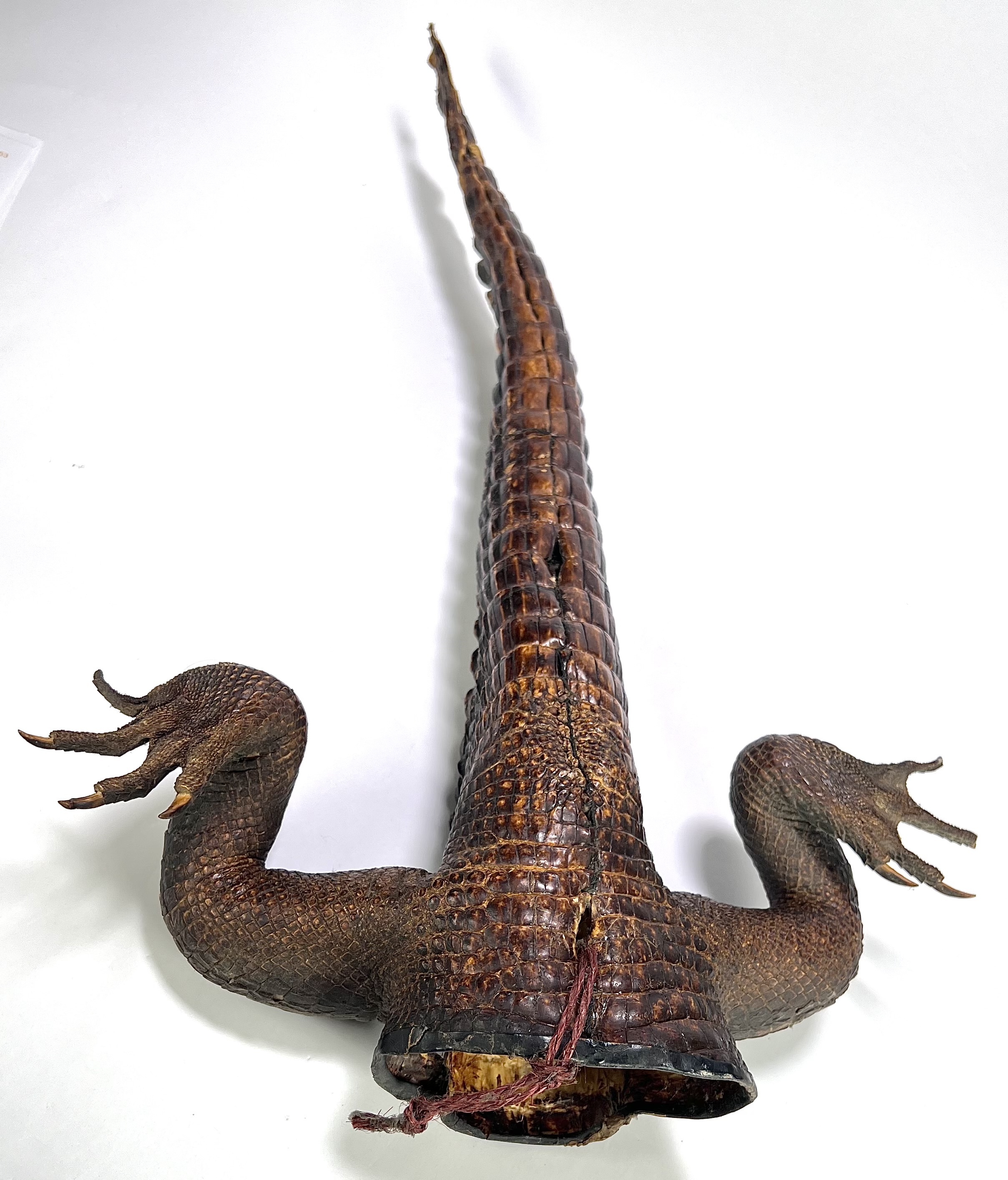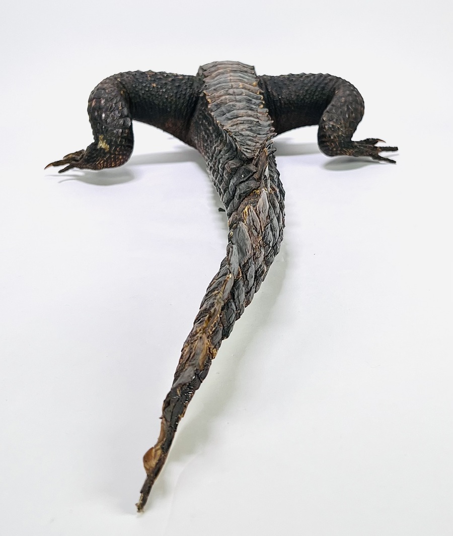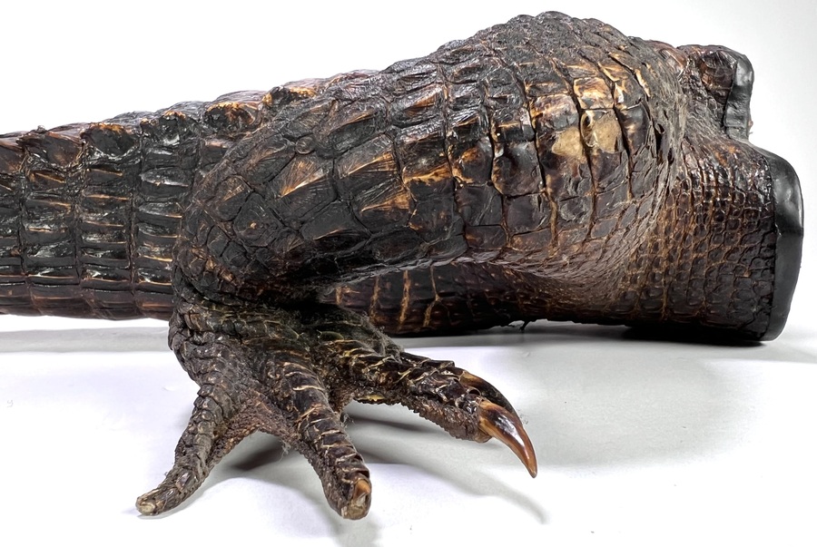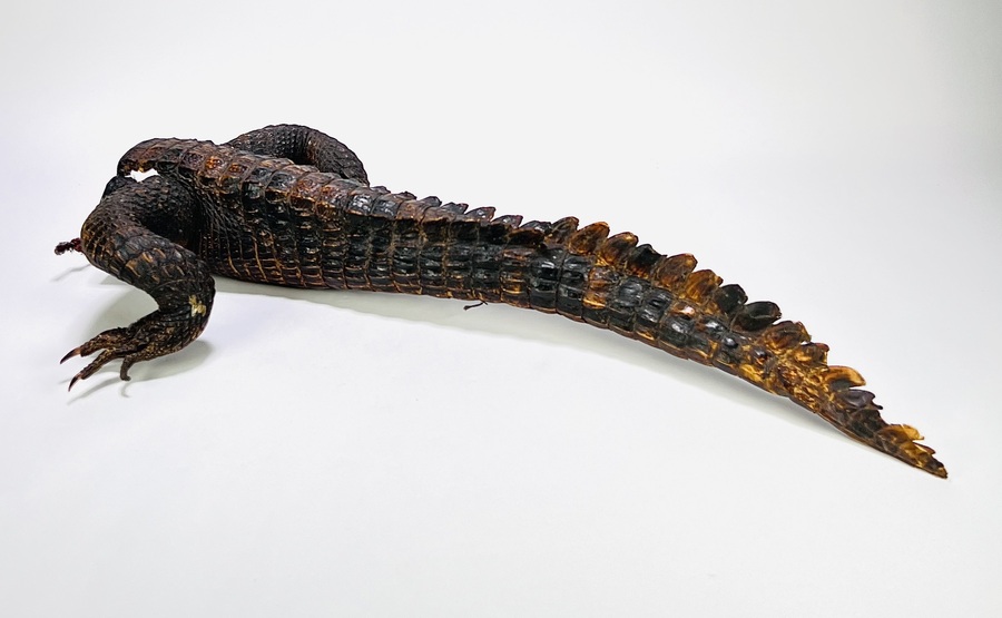 Onderlichaam en de staart van een krokodil, daterend uit de midden 20e eeuw. Geprepareerde reptielhuid met een ruwe, donkerbruine tot zwarte kleur en een uitgesproken schubbenpatroon. De herkomst is Afrika of Zuid-Amerika. Geïnteresseerd? Bezoek onze kijkdagen op 28, 29 of 30 november van 11:00 tot 17:00 uur! |