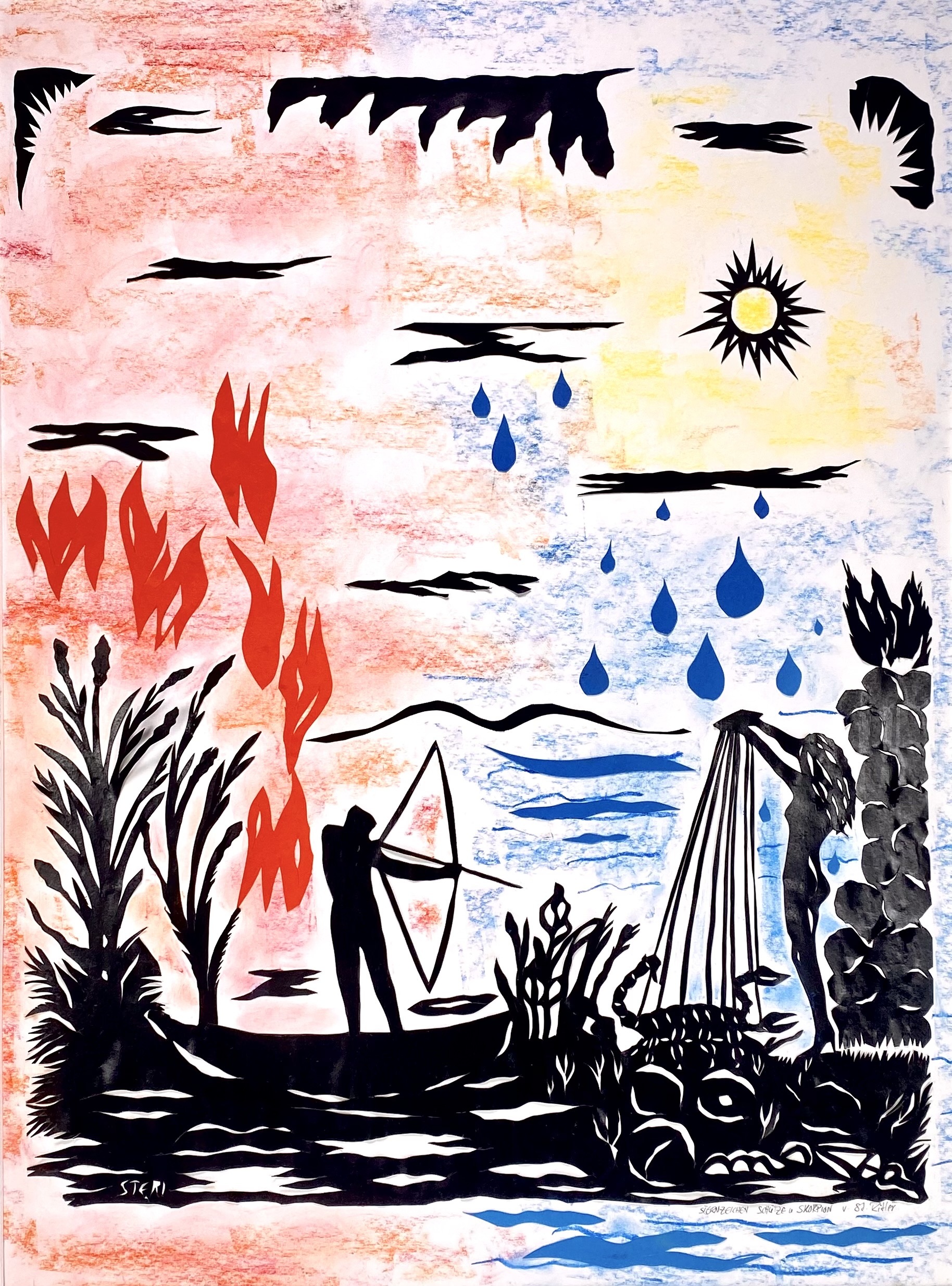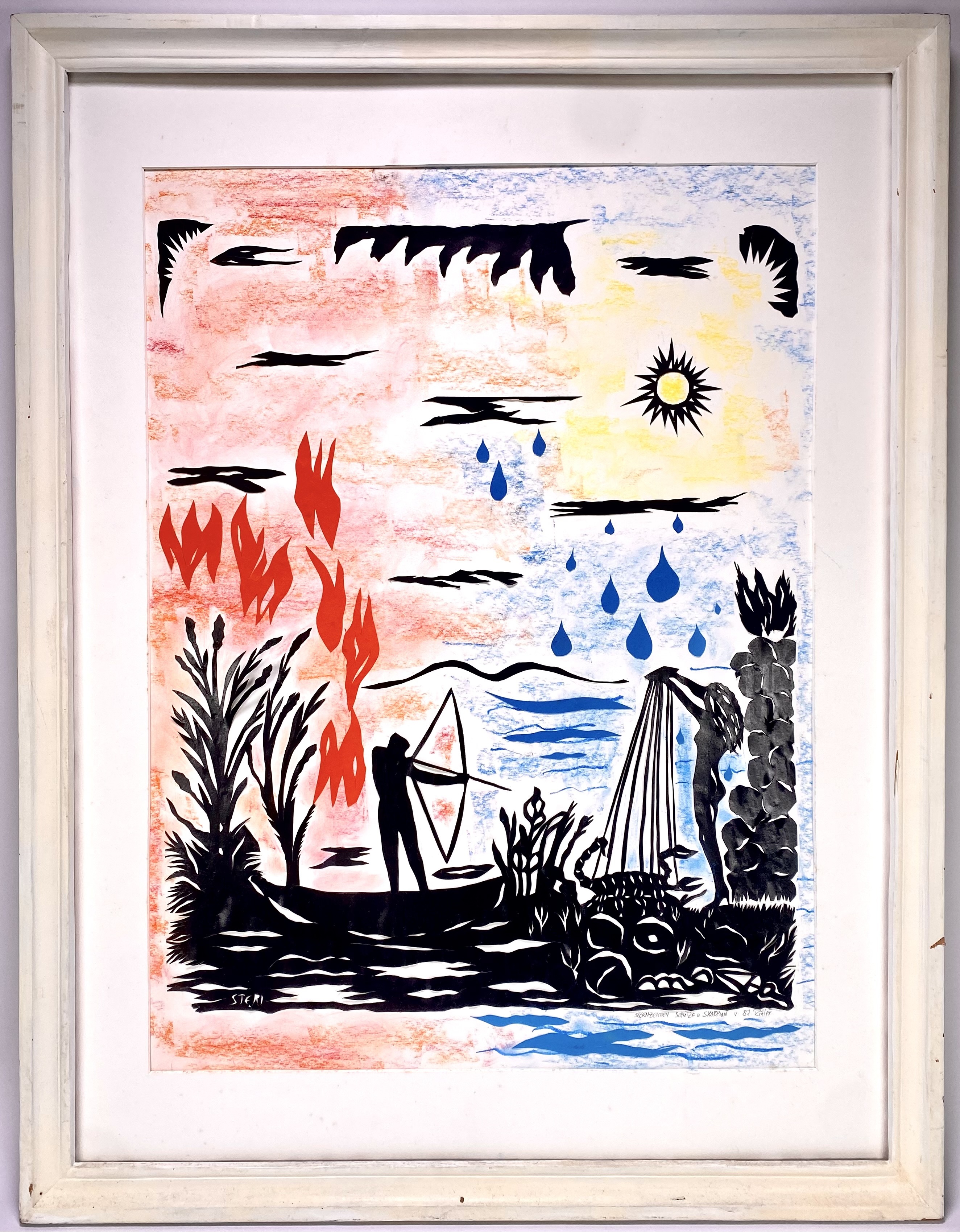 Mixed media waskrijt en knipselkunstwerk op papier, gedateerd 1981 door Stefan Ritler (1948). Het werk is in figuratief expressionistische stijl en draagt de titel "Sternzeichen Schütze u. Skorpion". De voorstelling balanceert de elementen vuur en water door zwarte silhouetten tegen een achtergrond van rood en blauw waskrijt. Kom langs tijdens de kijkdagen (28 t/m 30 november) en ontdek dit kavel zelf! |