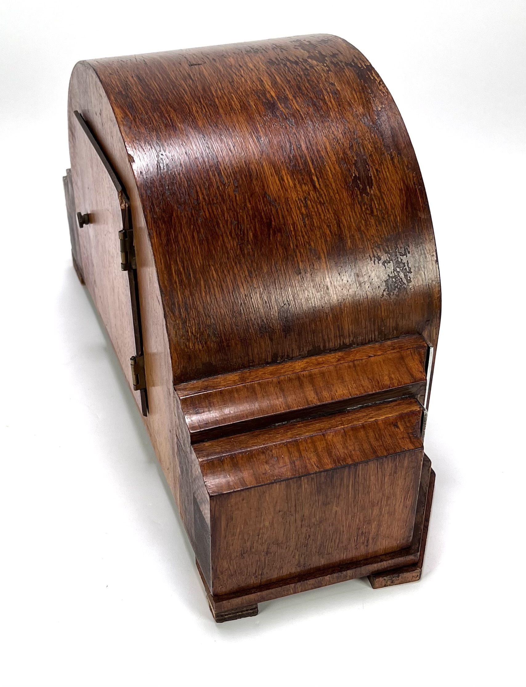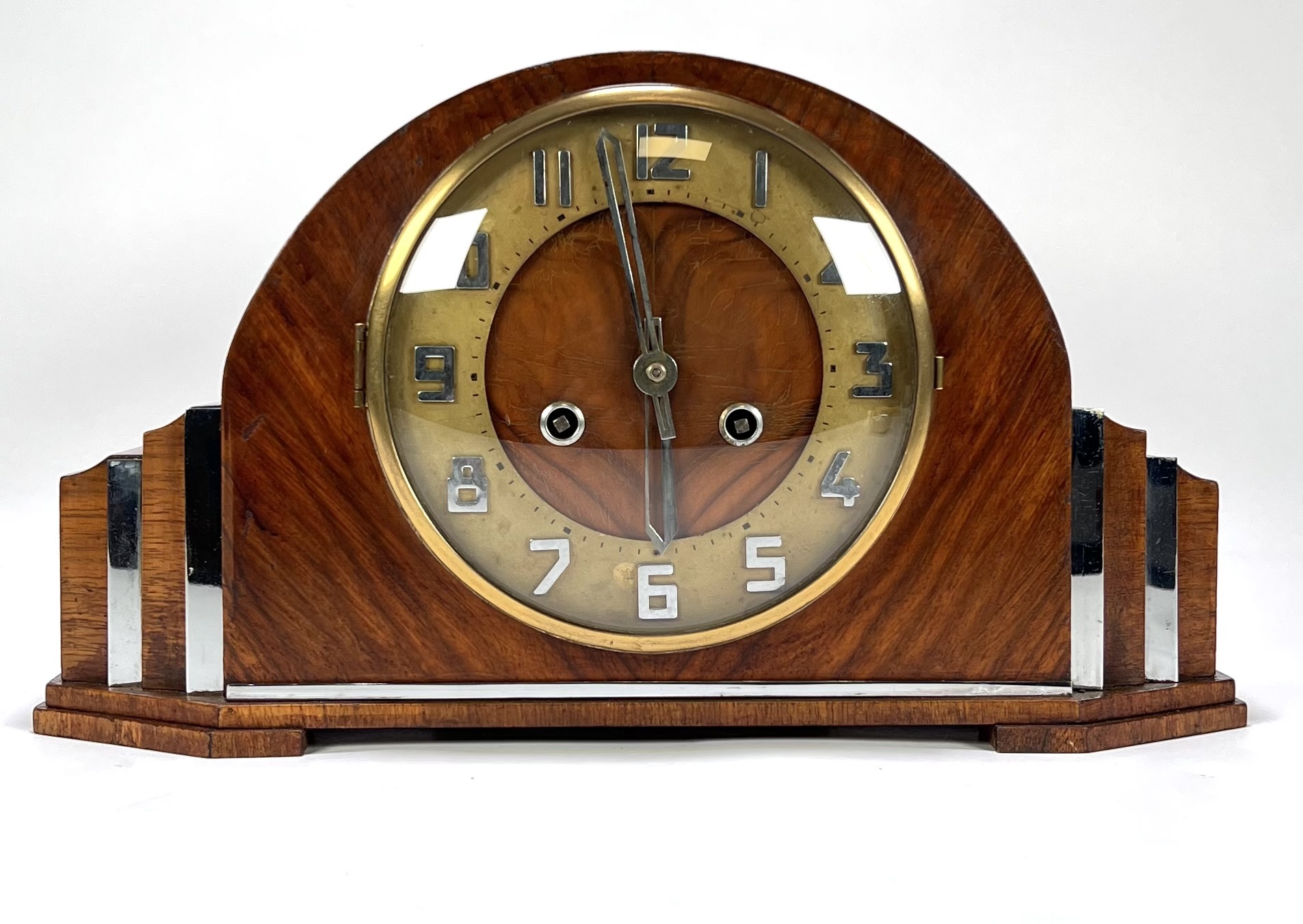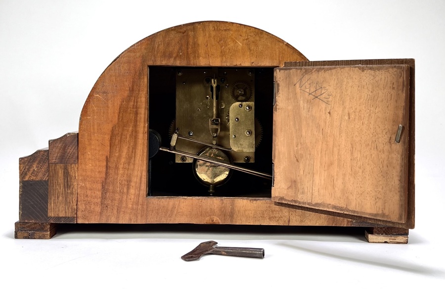 Houten Art Deco pendule daterend uit circa 1930–1940. De klok is vervaardigd met notenfineer en geaccentueerd met verticale elementen van verchroomd metaal. Het bevat een mechanisch messing uurwerk, inclusief slinger, sleutel en een bimbam slagwerk. De wijzerplaat toont een generfde houten achtergrond met Art Deco cijfers. Geïnteresseerd? Bezoek onze kijkdagen op 28, 29 of 30 november van 11:00 tot 17:00 uur! |