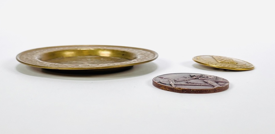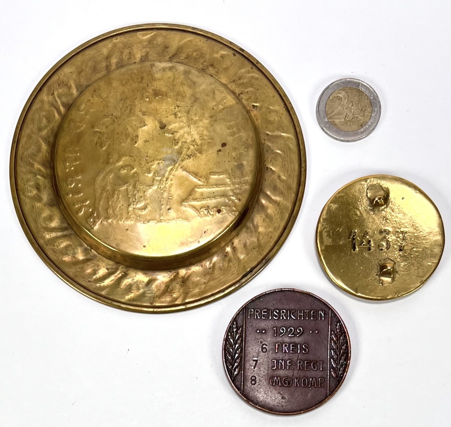 Medaille, schaaltje en een plaquette, daterend uit de eerste helft 20e eeuw. Het lot omvat een bronzen militaire plaquette, gedateerd 1929, met Duitstalige inscriptie over een schietwedstrijd en een machinegeweerschutter, een messing souvenirschaaltje ("WEIHNACHTEN IN NORD-AFRIK") en een heraldische medaille van de Odenweg Schuelerbund. Wil je direct deelnemen? Plaats vanaf 21 november alvast een schriftelijk bod via onze website! |