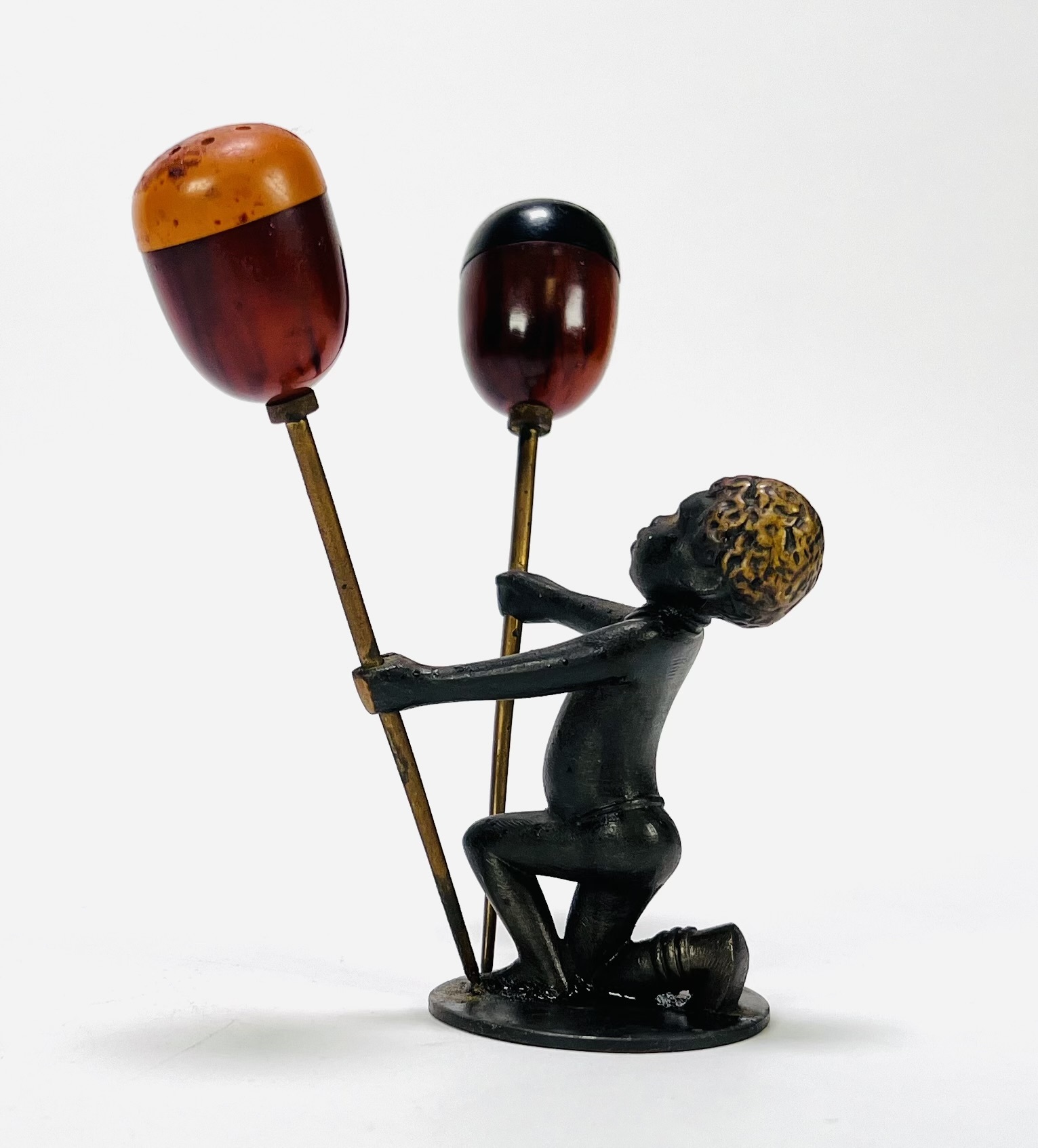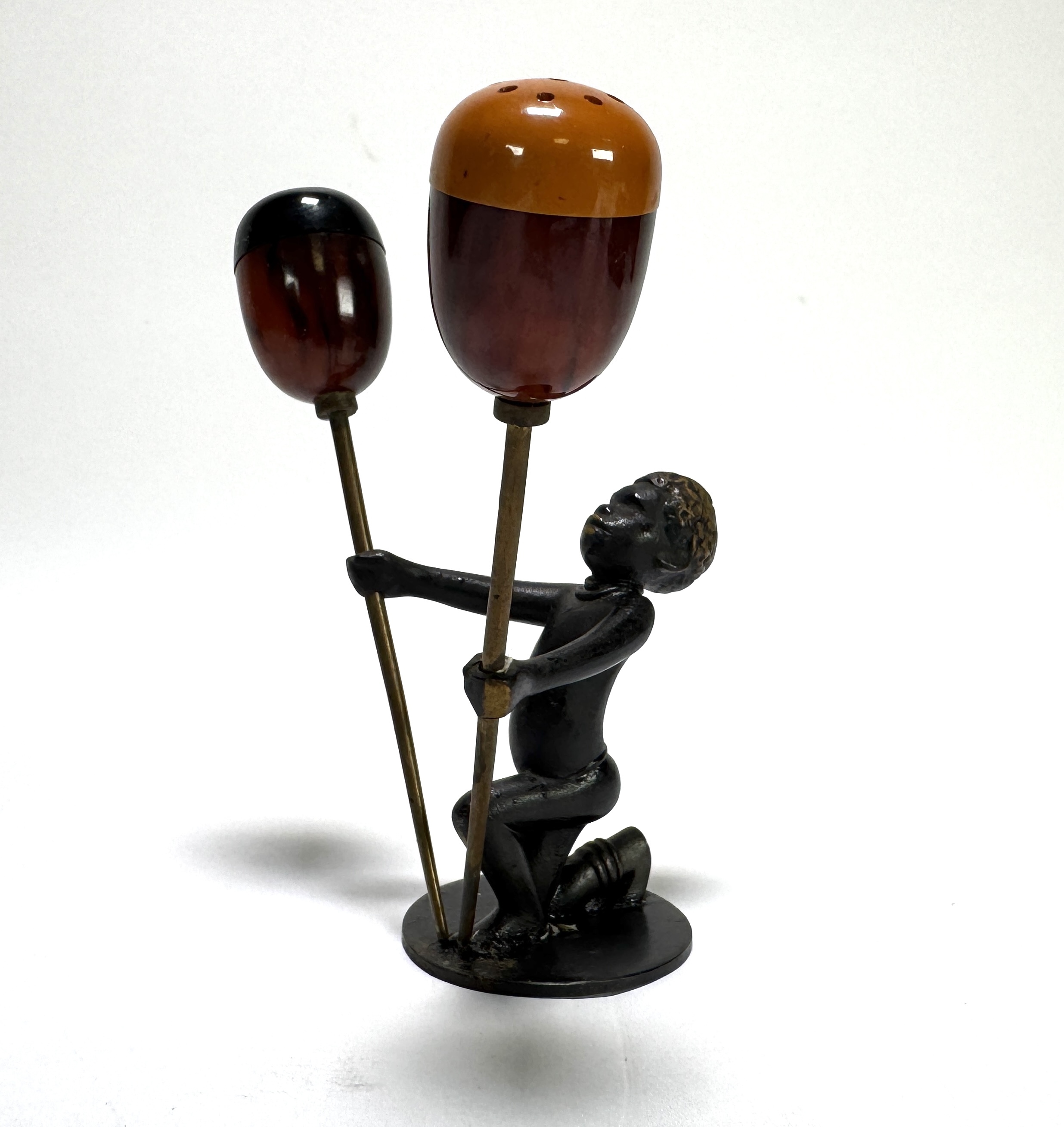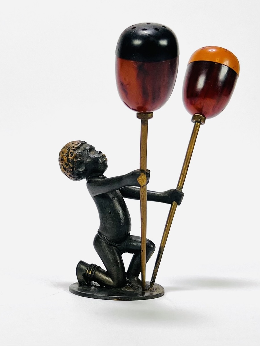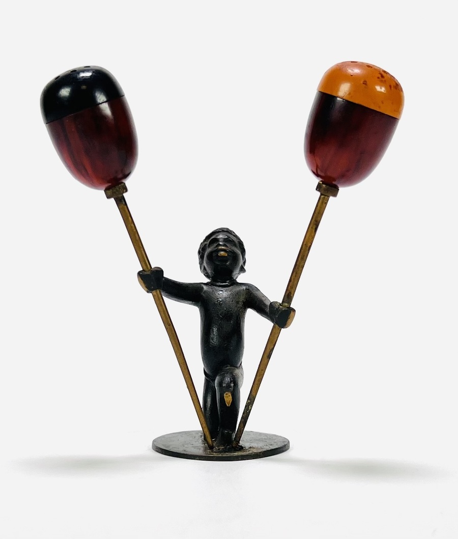 Art Deco peper-en-zoutstel in gepatineerd Weens brons met bakelieten strooiers, gedateerd in de jaren 1930. Het peper-en-zoutstel is gemerkt aan de onderkant RR (Richard Rohac 1906–1956) en gemaakt in Atelier Hagenauer. De figuur is een geknielde Afrikaanse jongen, uitgevoerd in de giettechniek en strooiers zijn van gemarmerd bakeliet in twee contrasterende kleuren. Ontdek dit per-en-zoutstel en voeg het toe aan jouw collectie! Registreer nu voor de veiling. |