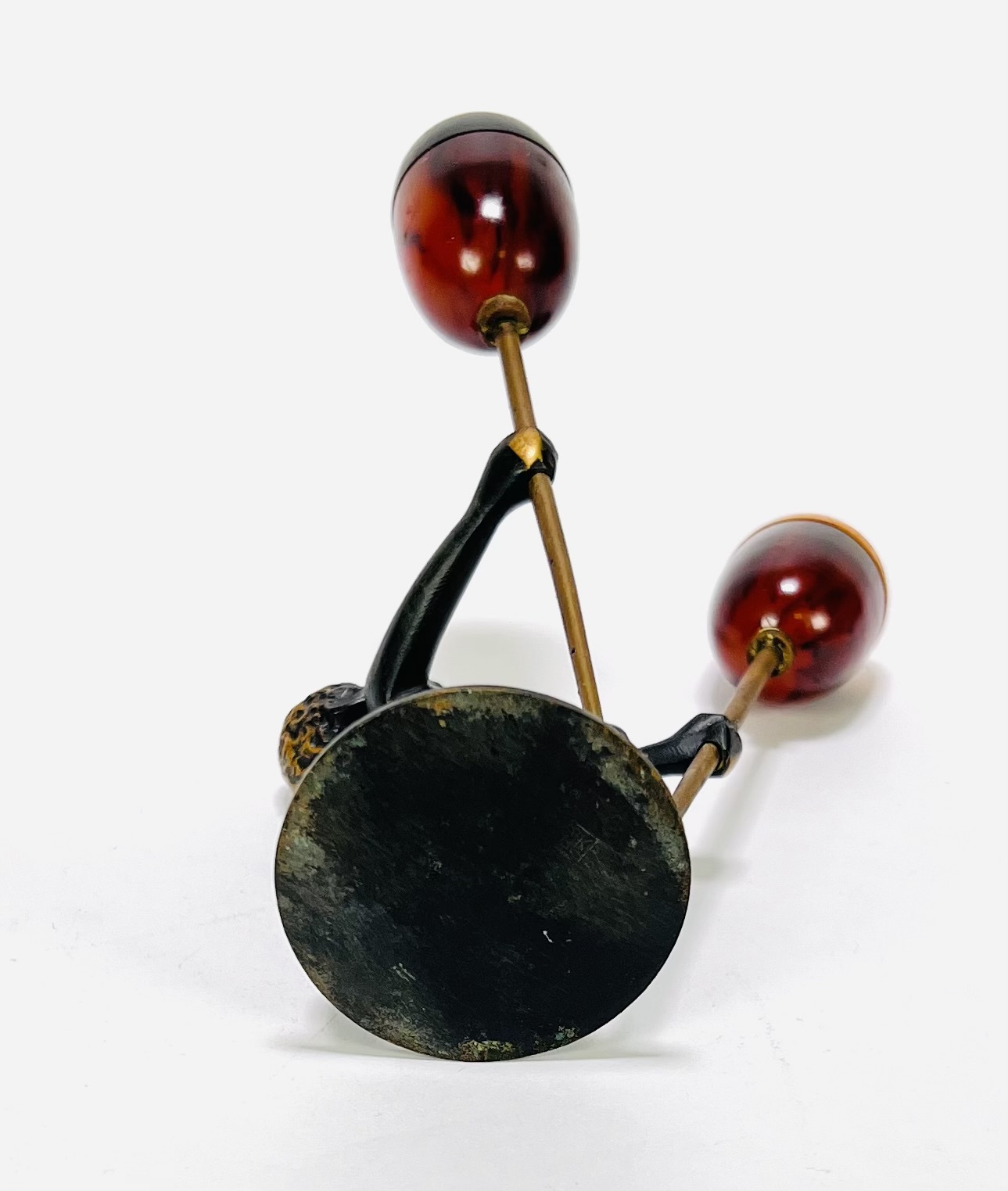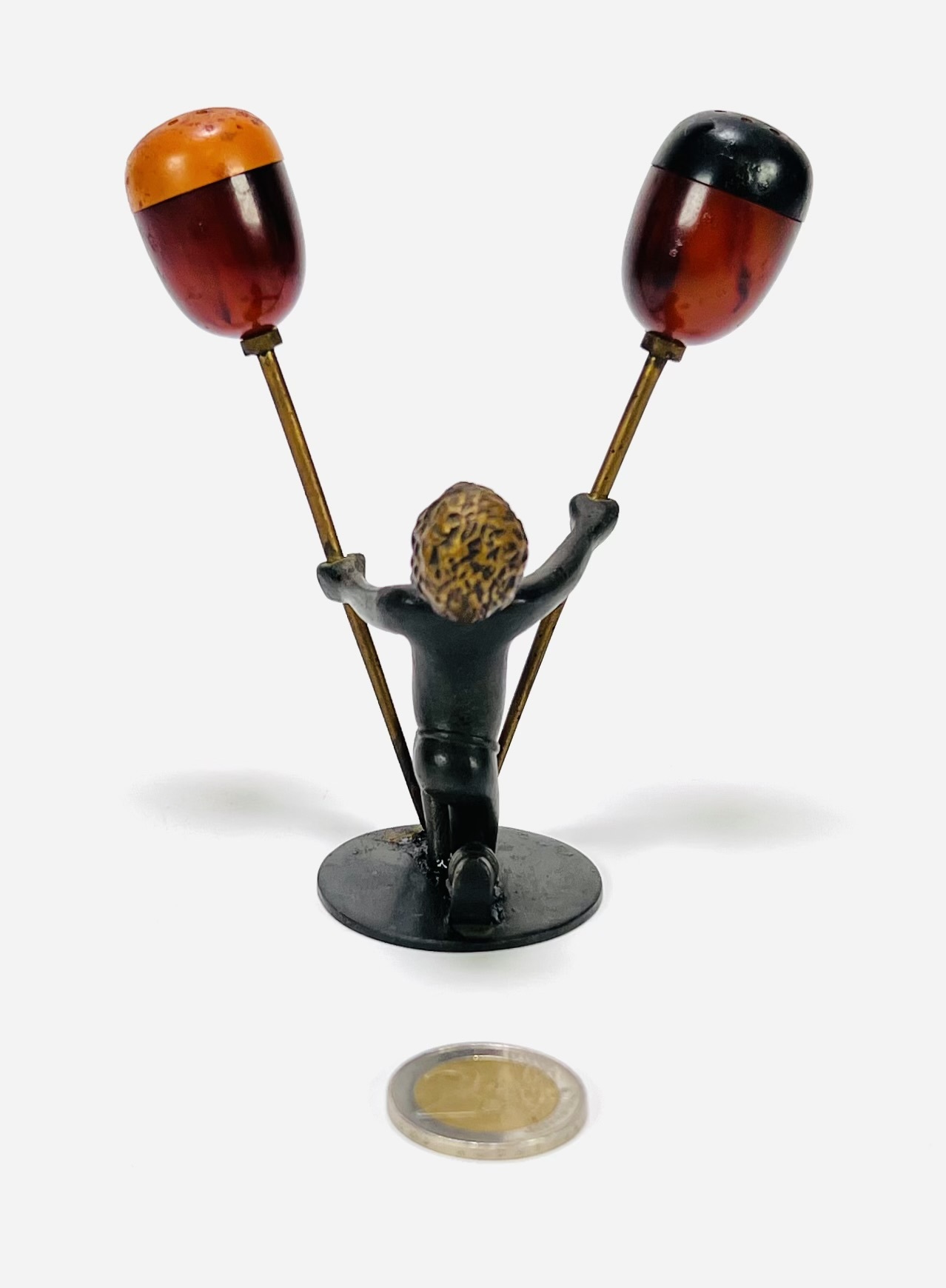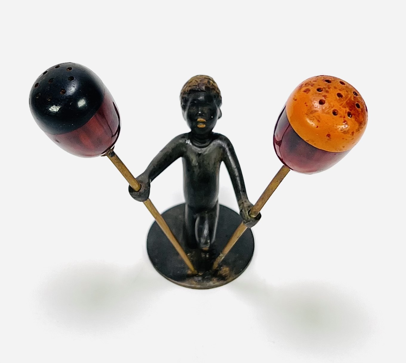 Art Deco peper-en-zoutstel in gepatineerd Weens brons met bakelieten strooiers, gedateerd in de jaren 1930. Het peper-en-zoutstel is gemerkt aan de onderkant RR (Richard Rohac 1906–1956) en gemaakt in Atelier Hagenauer. De figuur is een geknielde Afrikaanse jongen, uitgevoerd in de giettechniek en strooiers zijn van gemarmerd bakeliet in twee contrasterende kleuren. Ontdek dit per-en-zoutstel en voeg het toe aan jouw collectie! Registreer nu voor de veiling. |