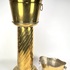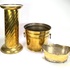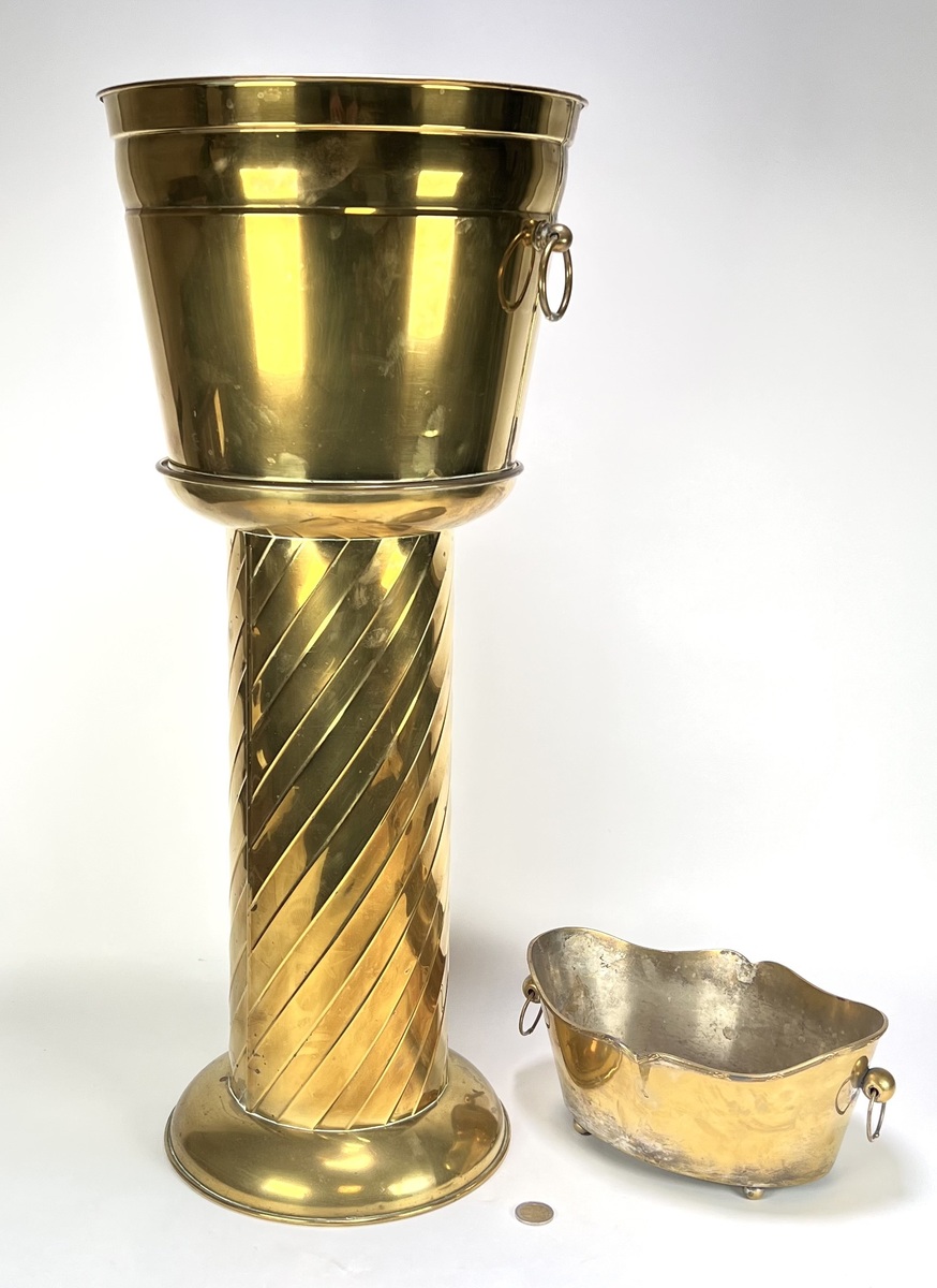 Twee voorwerpen vervaardigd uit messing middels plaatwalsen en solderen, circa 1890–1920; een hoge piëdestal met een grote bloembak en spiraalvormige ribbels en een kleine jardinière met een golvende rand. Jouw kans op dit object begint met registreren – bied live of online mee. |
