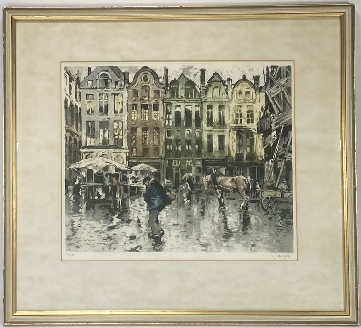 Kleuraquatint op papier, gesigneerd in potlood rechtsonder “F. Luigini” en linksonder oplagenummer 69/100. Uitgevoerd door de Franse kunstenaar Ferdinand-Jean Luigini (1870–1943) in impressionistische stijl. Afbeelding van een regenachtig stadsplein met marktkramen, figuren en paard-en-wagen, daterend eerste helft 20e eeuw. Klaar om te bieden? Registreer je nu en doe mee aan de veiling! |