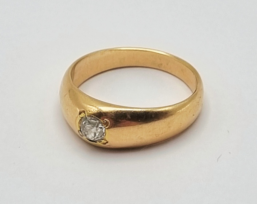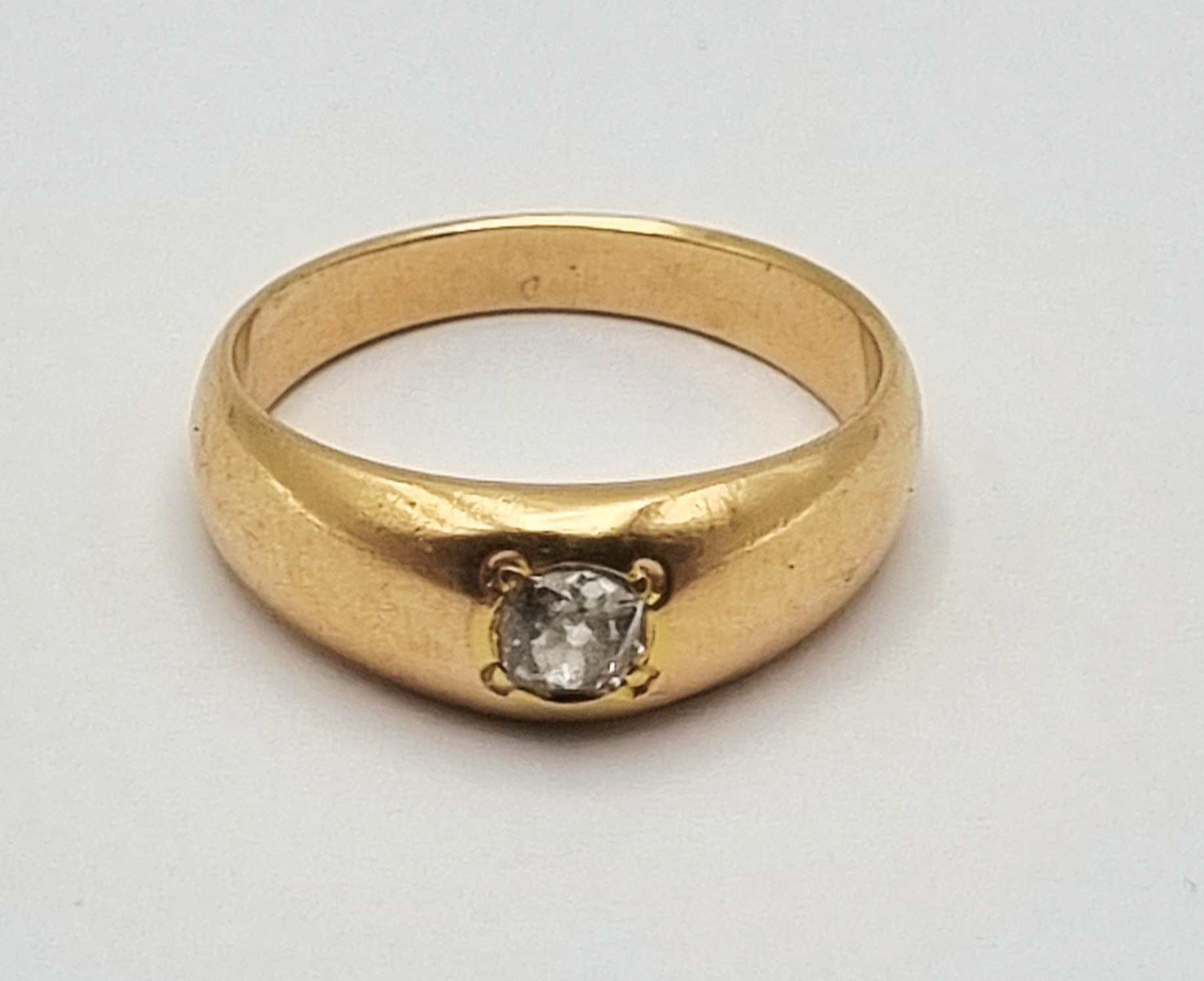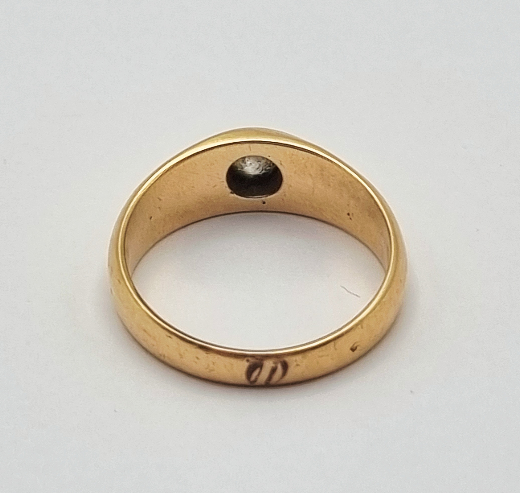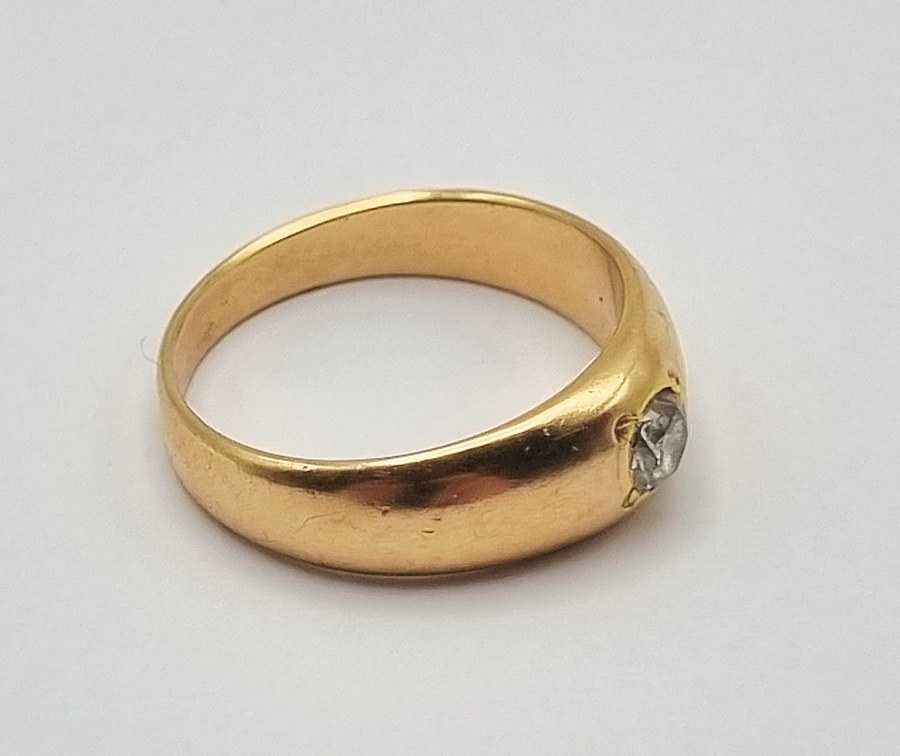 14 karaat gouden ring met diamant, uitgevoerd als een brede, bolle band in Mid-century modern stijl, dateert uit de midden 20e eeuw. De ring is gezet met een kleine diamant in een eenvoudige vierpuntige klauwzetting. De ring is getoetst op 14 karaat. Wil je direct deelnemen? Plaats vanaf 21 november alvast een schriftelijk bod via onze website! |
