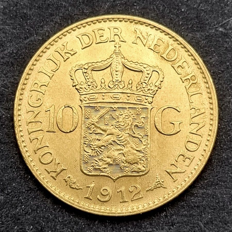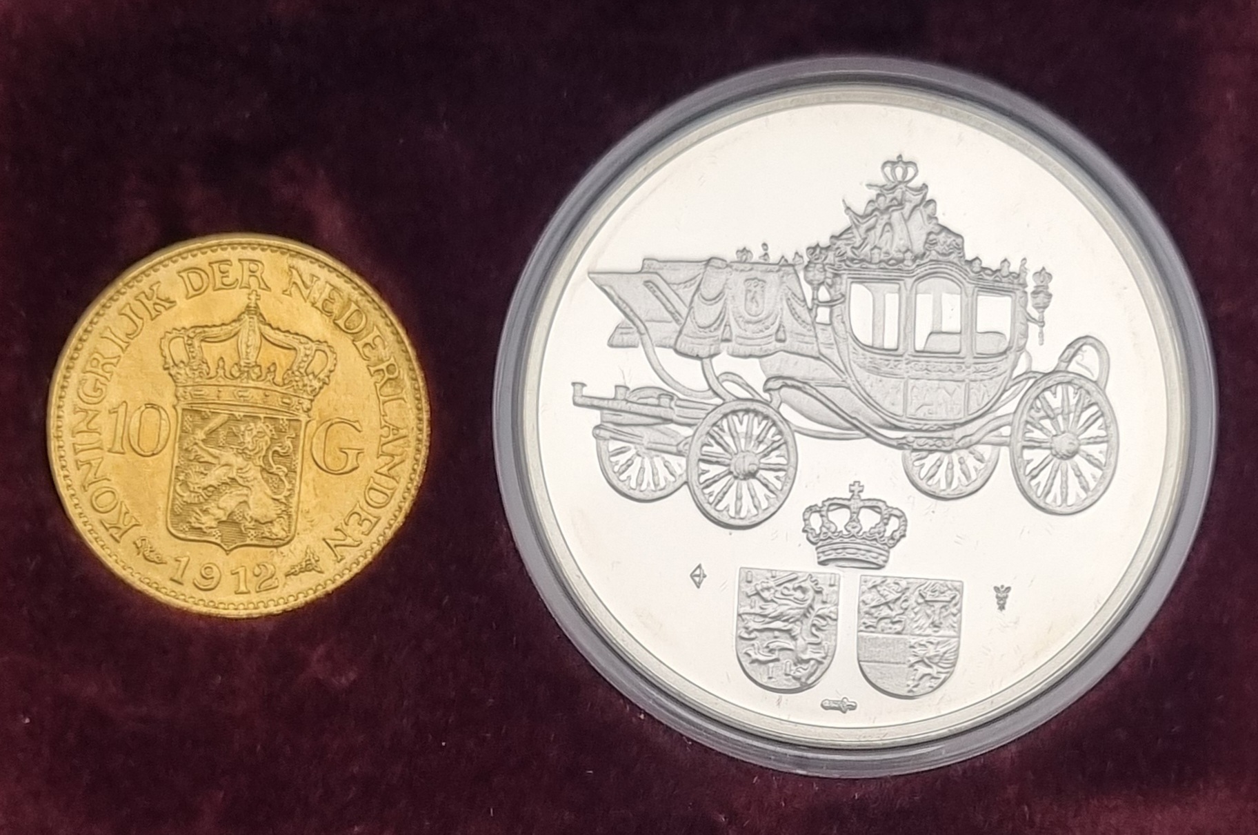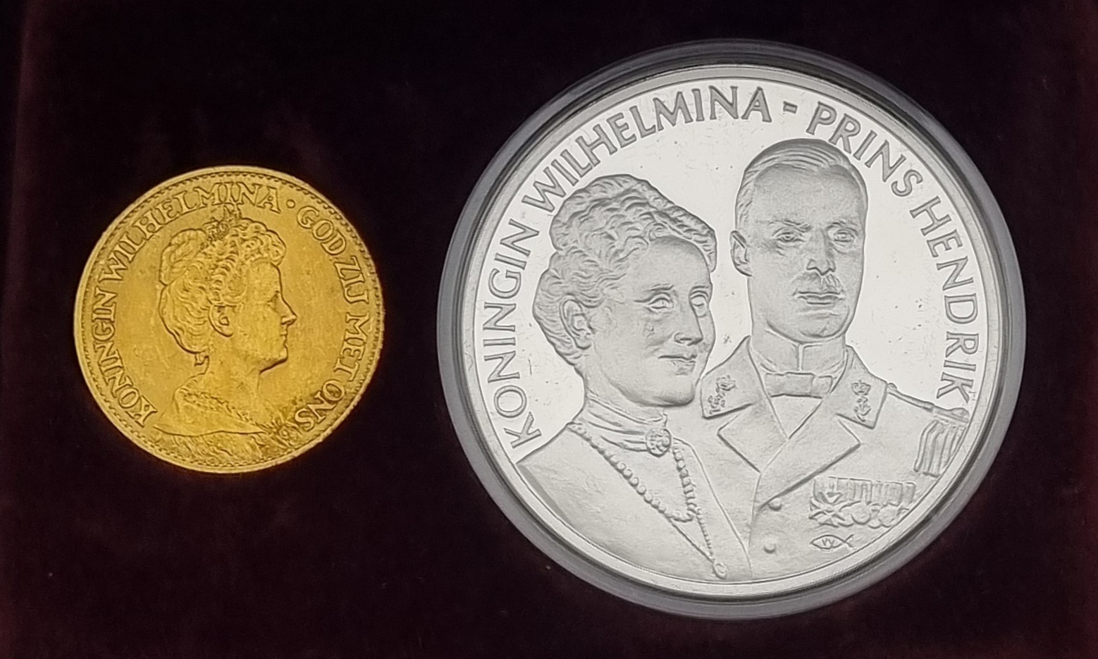 Gouden tientje Wilhelmina 1912 en zilveren penning Koningin Wilhelmina en Prins Hendrik