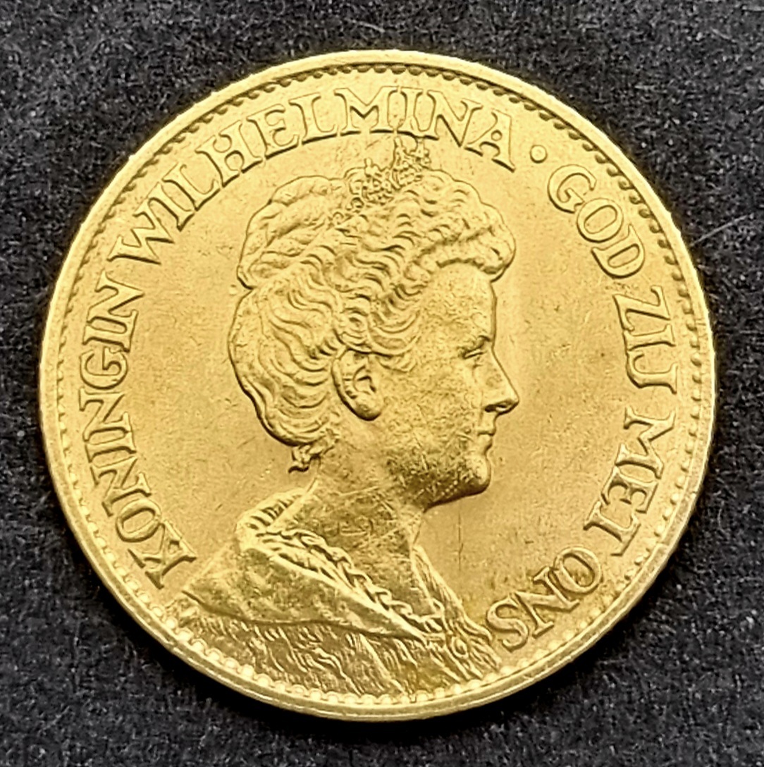 Nederlands gouden tientje uit 1912, geslagen in 900/1000 goud, gecombineerd met een moderne herdenkingspenning uit zilver (925/1000), in originele presentatiecassette met Certificaat van Echtheid. Het gouden tientje, ontworpen door J.C. Wienecke (1872–1951), toont Koningin Wilhelmina met hermelijnen mantel en het Rijkswapen. De zilveren penning, eind 20e eeuw, beeldt Wilhelmina en Prins Hendrik af, keerzijde de gouden koets. Geïnteresseerd? Bezoek onze kijkdagen op 28, 29 of 30 november van 11:00 tot 17:00 uur. |