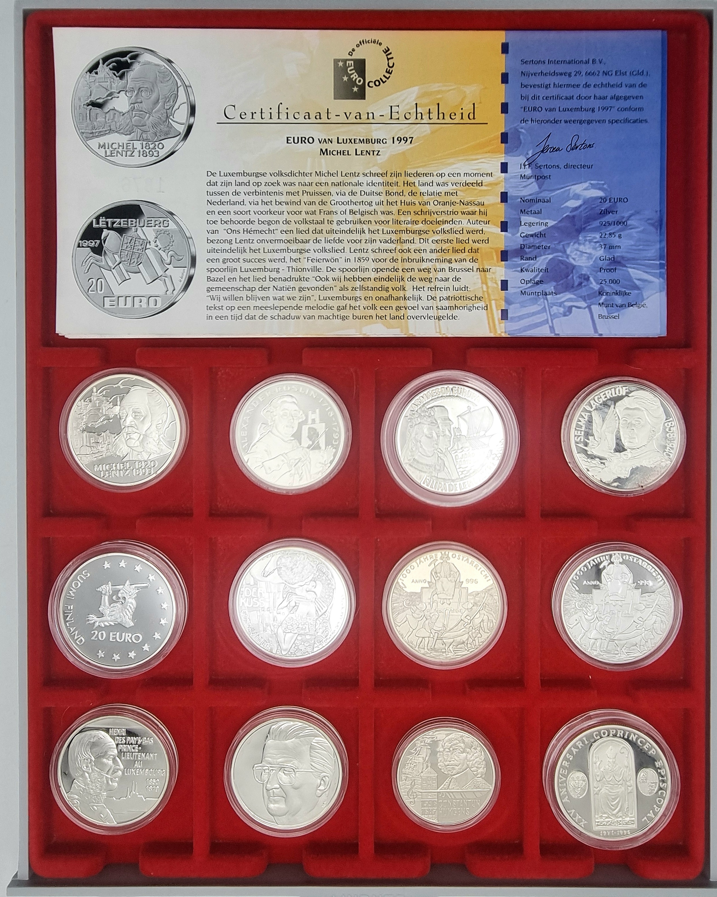 | Afmetingen | Tien munten 925/1000 zilver gewicht 257,08 gram, een munt 800/1000 zilver 15 gram, een munt Cupro-Nikkel 22,50 gram. Cassette lengte 30 cm en breedte 24 cm. | |