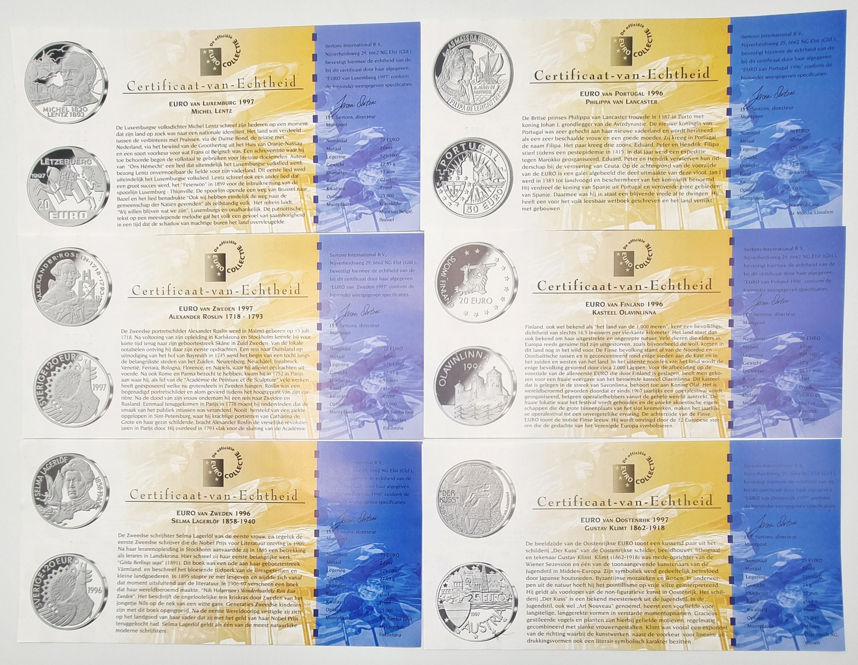 Set bestaande uit twaalf herdenkings- en proefmunten (penningen) in een fluwelen cassette, uitgegeven door Senzora International circa 1996–1998. De munten tonen portretten van Europese figuren en allegorische voorstellingen uit diverse landen ter ere van de Euro. De set bevat ook een CuNi munt. Ontdek deze collectie en voeg het toe aan jouw collectie! Registreer nu voor de veiling. |