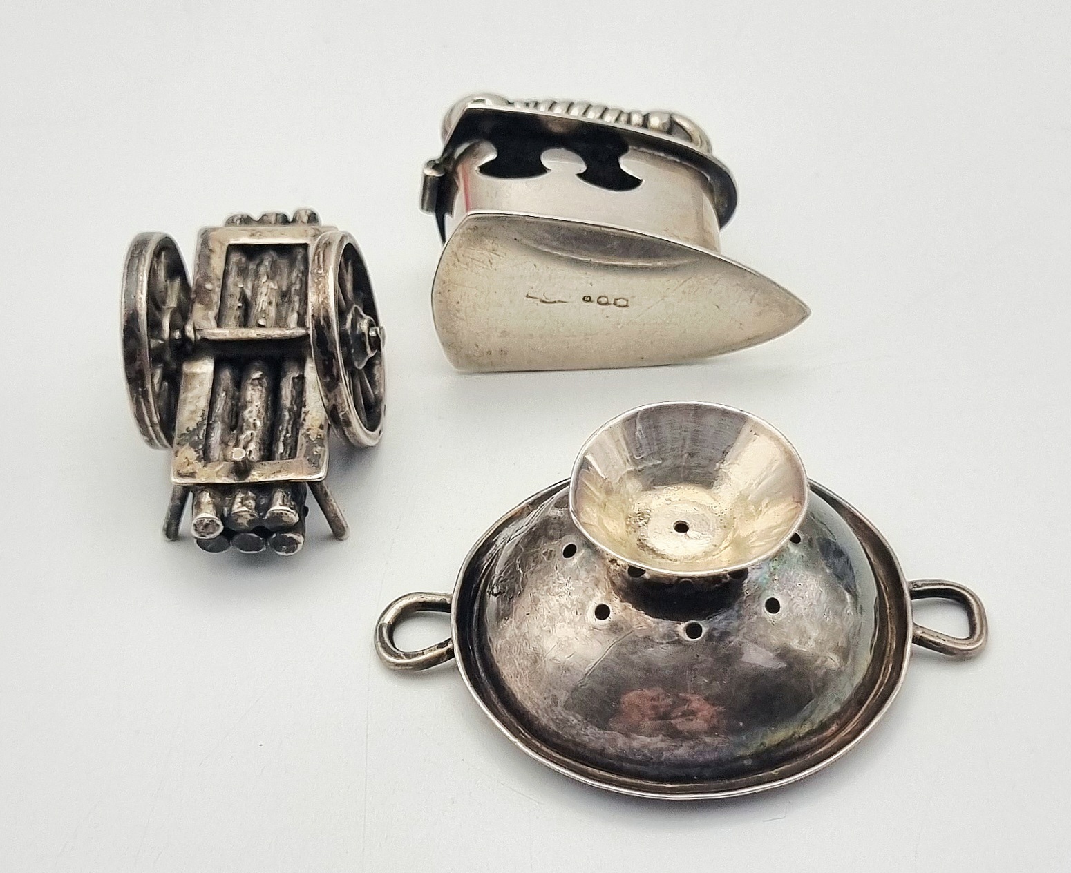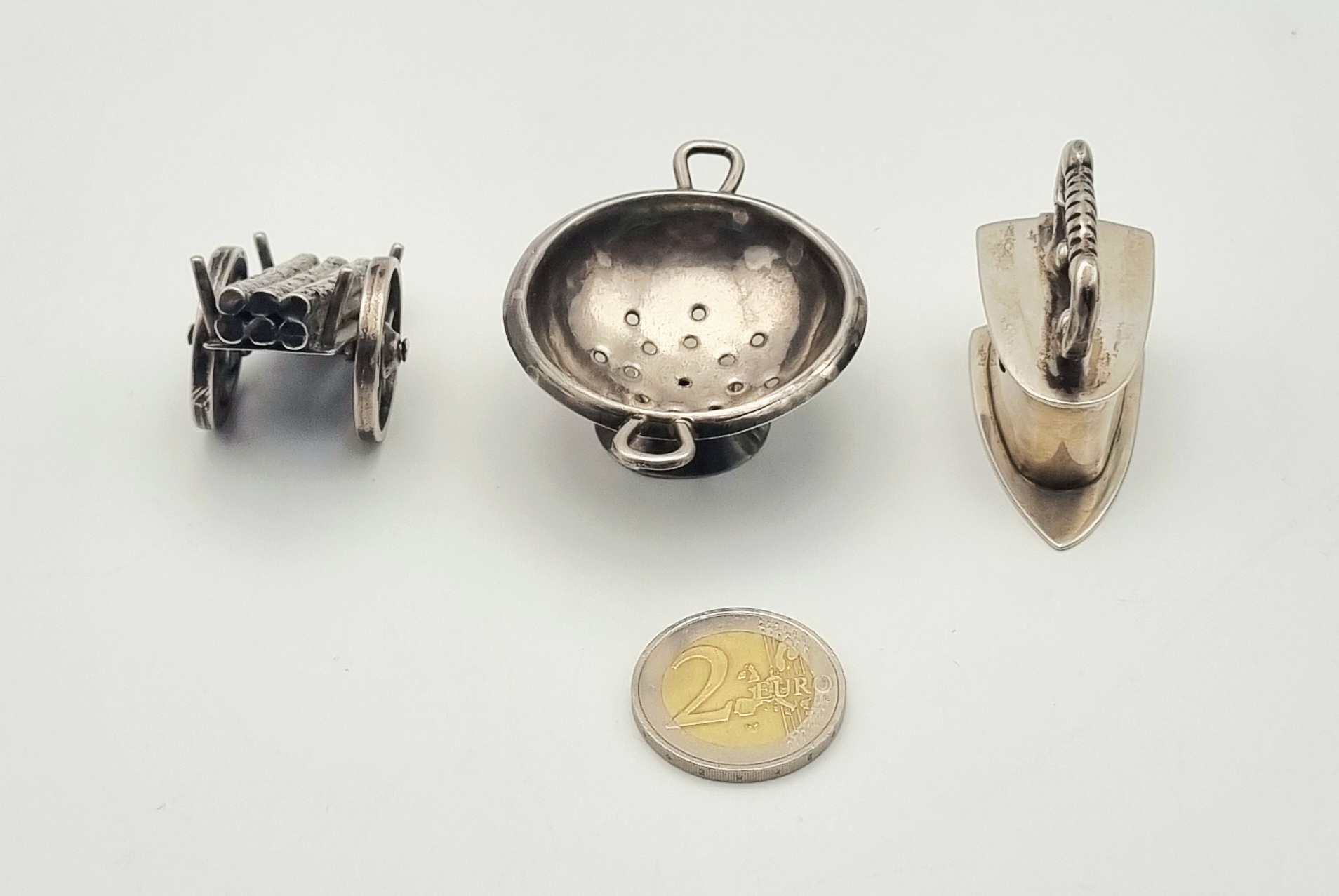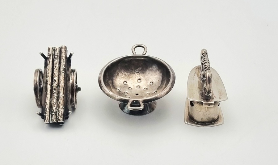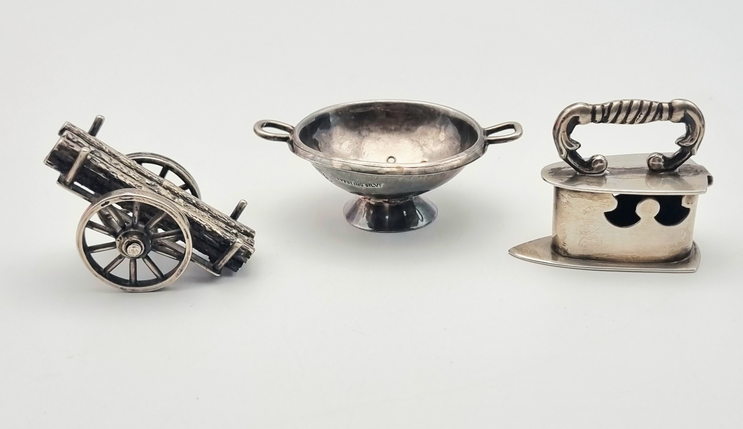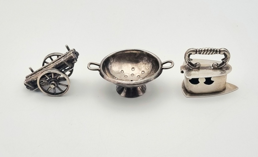 Sterling zilveren miniaturen – kar, strijkijzer en vergiet, 1920–1950
