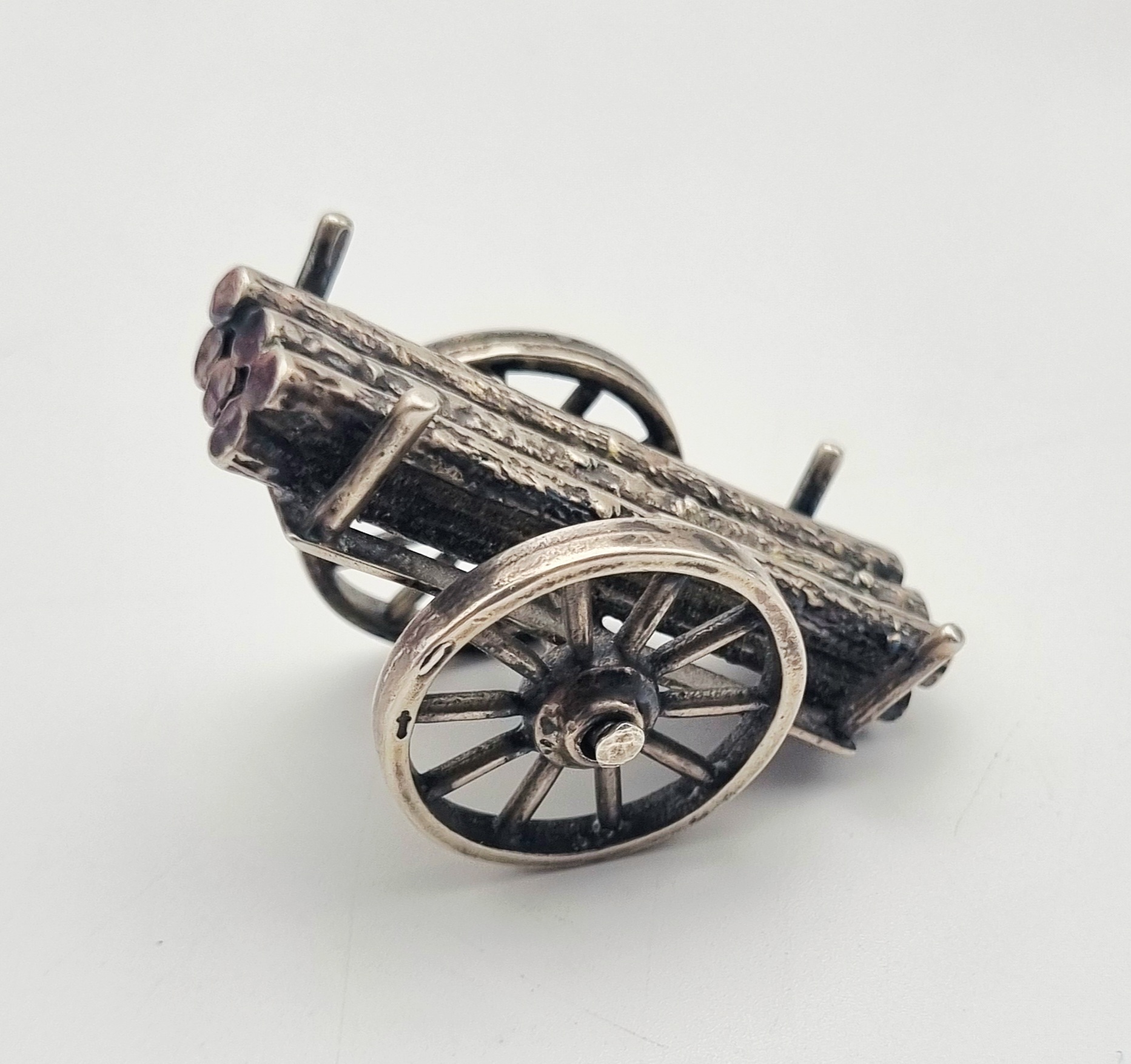 Drie zilveren miniaturen vervaardigd uit zilver middels giet- en soldeertechniek, eerste helft 20e eeuw en tonen gedetailleerde weergaven van een kar met hout, vergiet en strijkijzer. Wil je dit object in het echt bekijken? Kom naar de kijkdagen op 28, 29 en 30 november! |