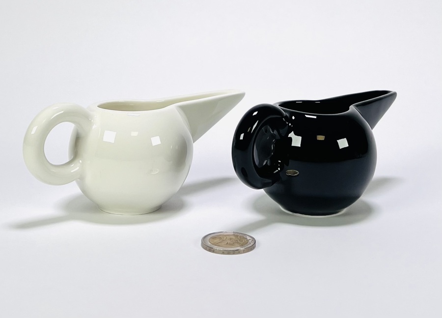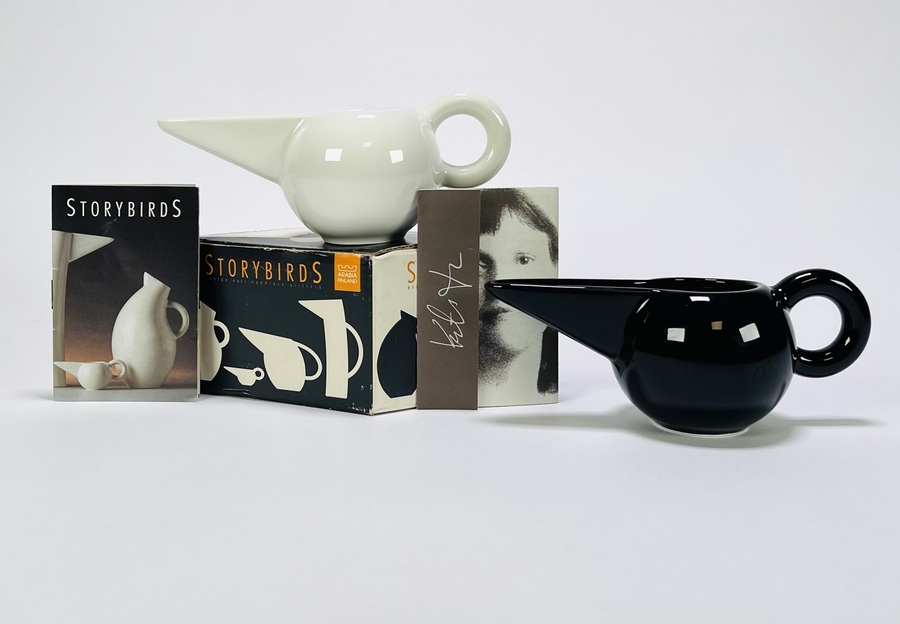Twee keramiek melkkannetjes, model 'Omar', uit de “Storybirds”-serie, ontworpen door Kati Tuominen-Niittylä (1947) in ca. 1993 voor Arabia Finland. De melkkannetjes met glansglazuur zijn uitgevoerd in crèmewit en zwart en hebben een strakke geabstraheerde vogelvorm met scherpe tuit. Een melkkannetje in originele doos. Wil je direct deelnemen? Plaats vanaf 21 november alvast een schriftelijk bod via onze website! |