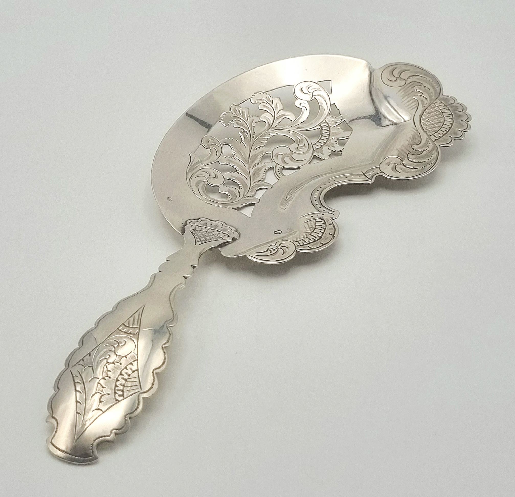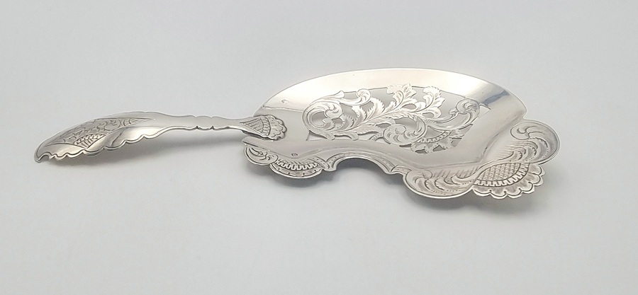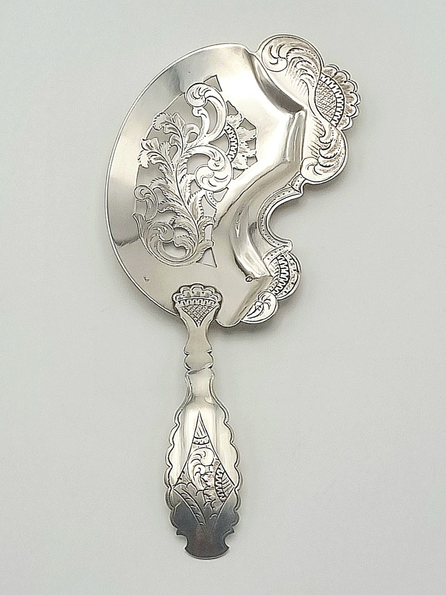 Drie Nederlands zilveren (835/1000) scheppen, gesmeed en gegraveerd in neorococo stijl, daterend uit het midden van de 19e eeuw. Een grote natfruitschep uit 1850 met een opengewerkte bak en uitbundige rocaille ornamenten op de steel, en twee suikerschepjes. Eén gegraveerd suikerschepje is uit 1864, het andere is uit 1868 door zilversmid W. Schuss (1846–1876) uit Amsterdam (merkteken anker met WS). Alle voorwerpen zijn gemerkt met de lopende leeuw 2 en minervakop. Klaar om te bieden? Registreer je nu en doe mee aan de veiling! |
