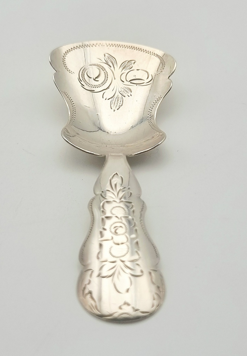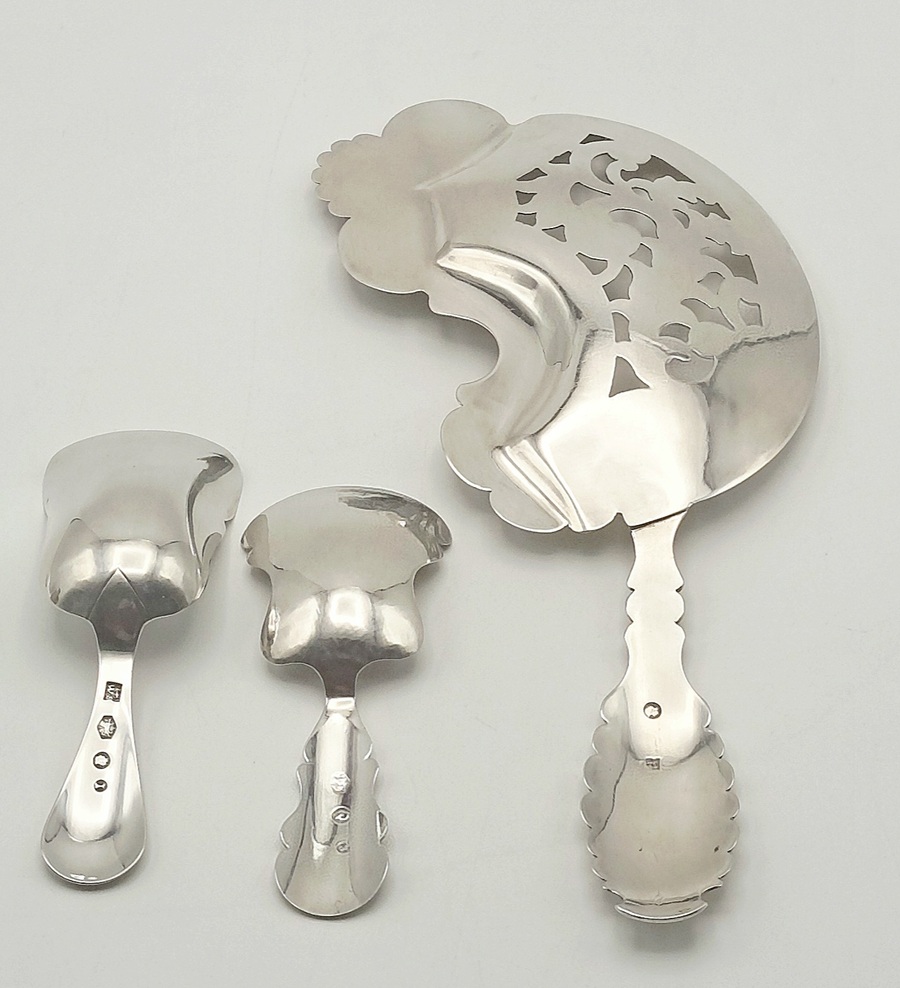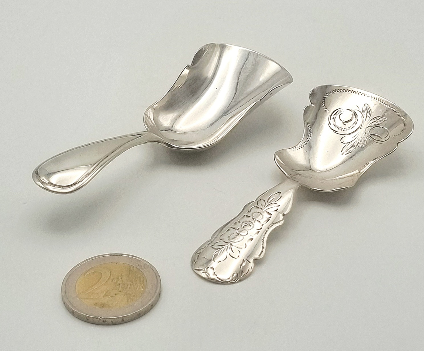 Zilveren natfruitschep en twee suikerschepjes, Nederland , midden 19e eeuw
