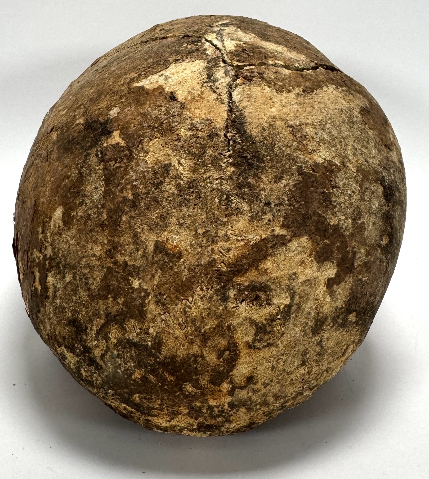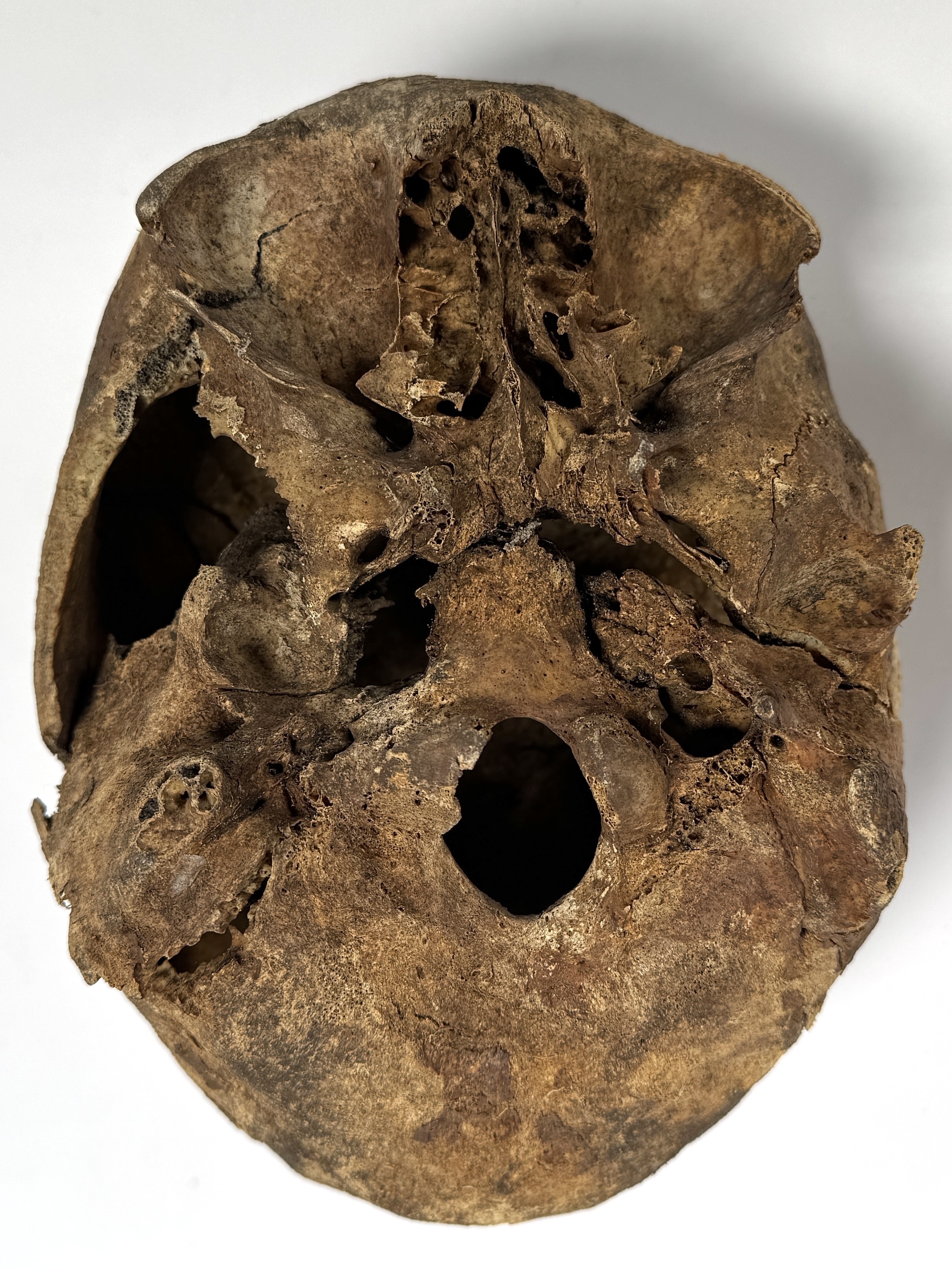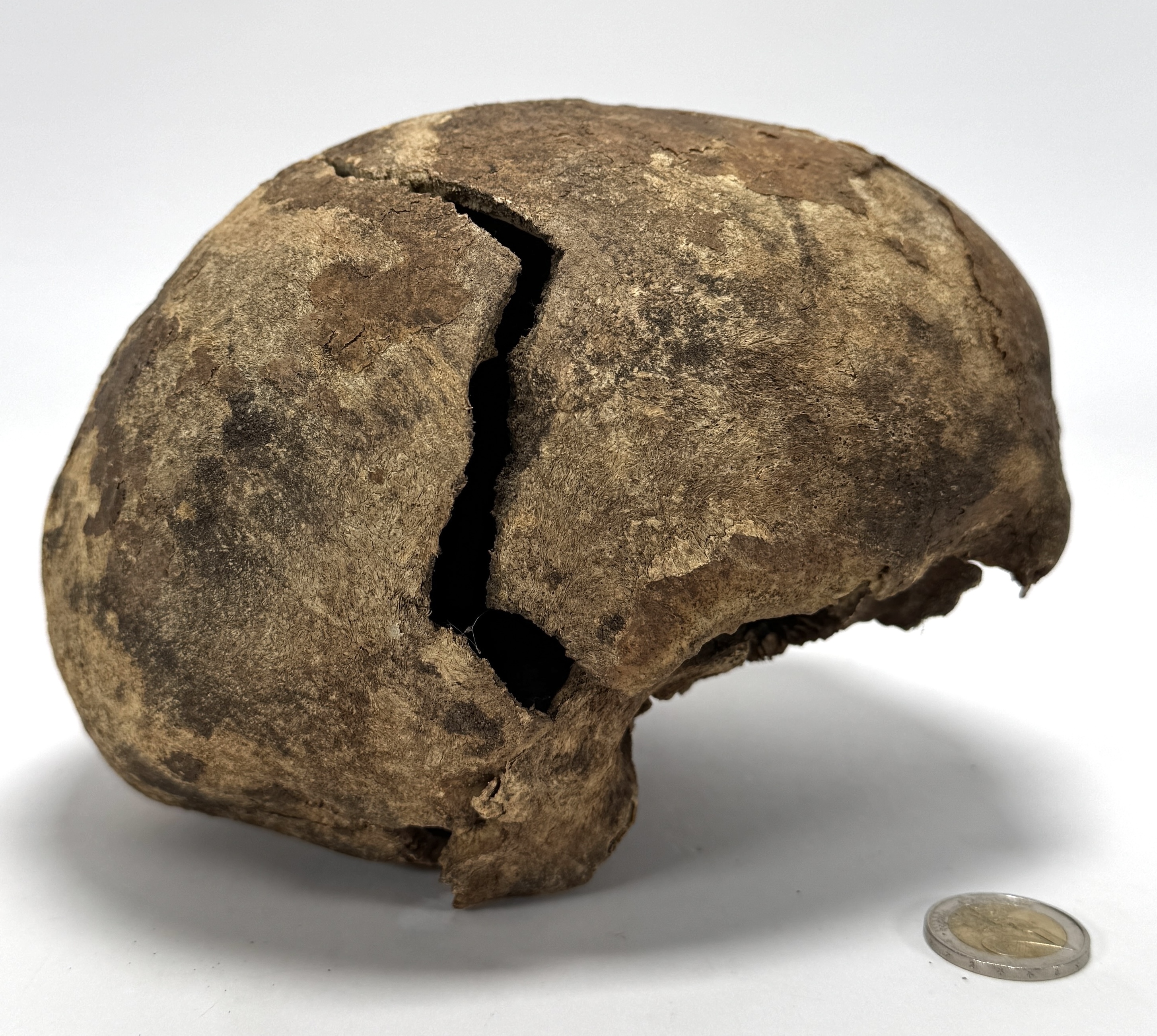 Fragment menselijke schedel van ossale restanten betreft de calvarium en delen van de gelaatsschedel. De gefragmenteerde botstructuur toont bruine verkleuring en erosie, wat duidt op langdurige natuurlijke conservering. Het schedelgedeelte heeft zichtbare schedelnaden, breuklijnen en gefragmenteerde oogkassen. De schedel zelf beoordelen? Je bent welkom op onze kijkdagen op 28, 29 en 30 november! |