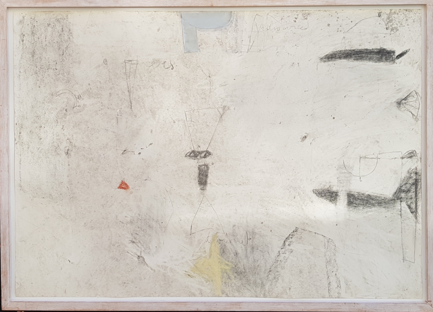 Tekening door Tjibbe Hooghiemstra (1957) uitgevoerd in gemengde techniek met houtskool, potlood en pigment, op papier, gedateerd 1992. Het abstract expressionistische werk heeft een gereduceerd witgrijs kleurenpalet met spaarzame rode en gele kleuraccenten. De compositie toont vage vormen en lijnen. Het werk is verso gedocumenteerd en bevindt zich in een lichte houten lijst.