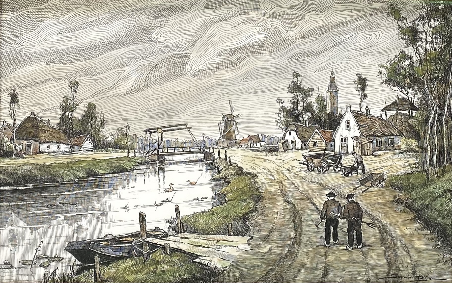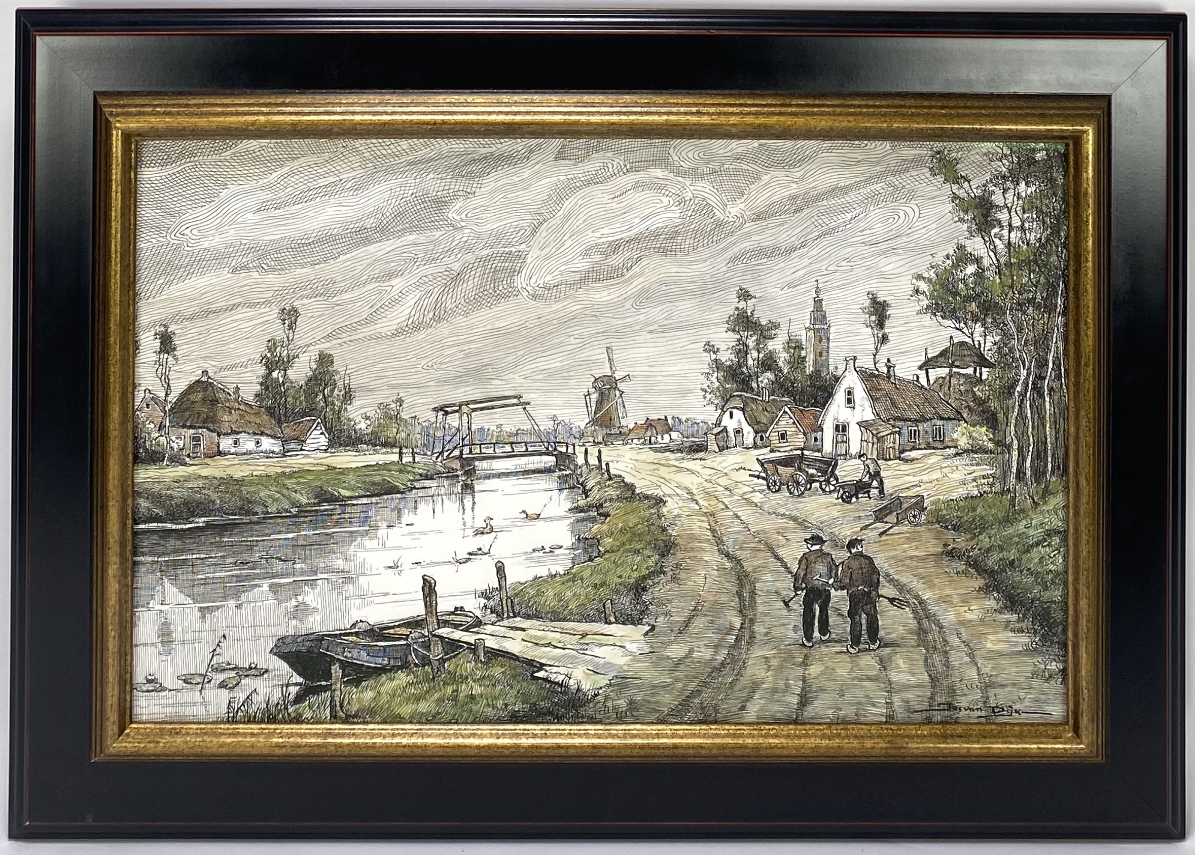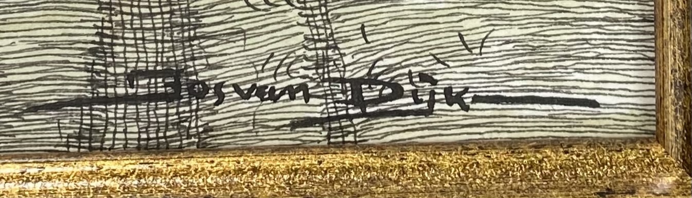Pentekening met aquarel op papier is rechtsonder gesigneerd door de Nederlandse schilder Jos van Dijk (1913–1998). Het werk uit de midden 20e eeuw toont een naturalistisch dorpsgezicht met een ophaalbrug, molen en kerk langs een vaart. De techniek combineert een gedetailleerde lijntekening in inkt met lichte aquarelwassingen. Wil je direct deelnemen? Plaats vanaf 21 november alvast een schriftelijk bod via onze website! |