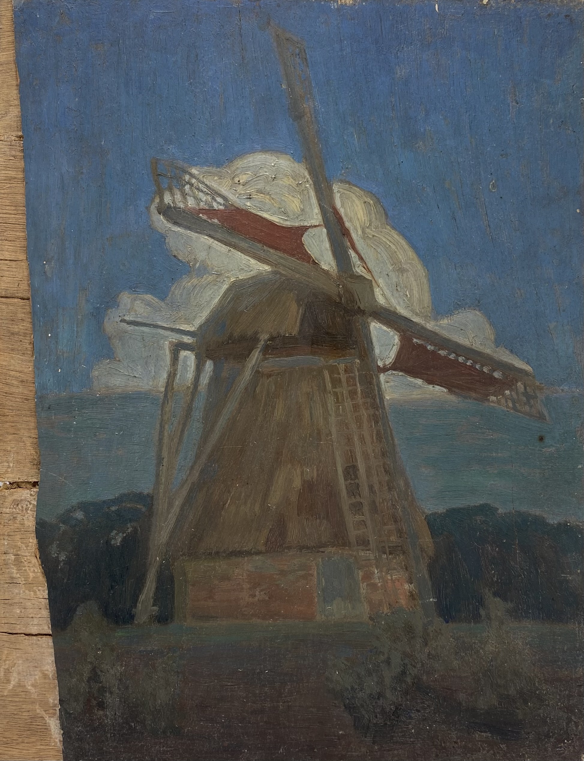 Olieverf op triplex met voorstelling van een Hollandse windmolen tegen een blauwe lucht met wolken, uitgevoerd in realistische stijl met impressionistische penseelvoering, daterend uit het begin van de 20e eeuw. Het kleurgebruik is levendig, met contrast tussen lucht en landschap. Klaar om te bieden? Registreer je nu en doe mee aan de veiling! |