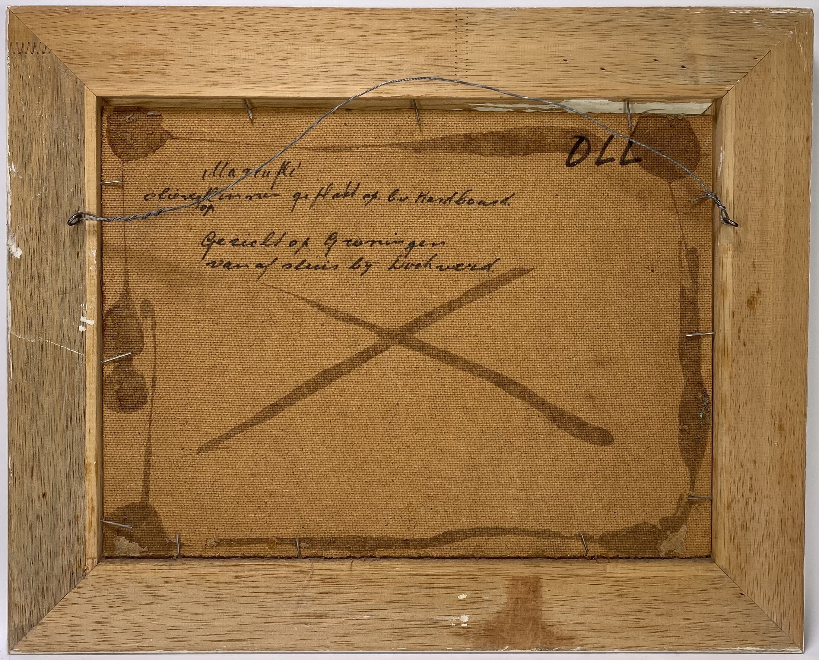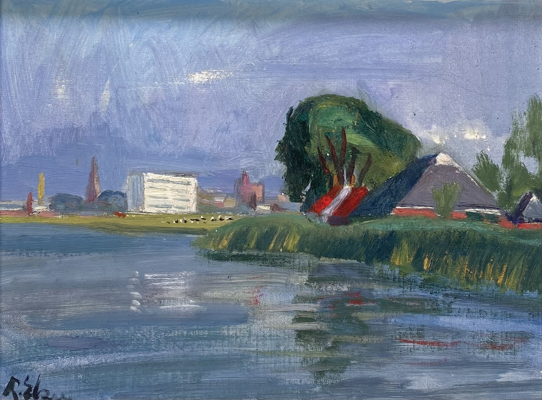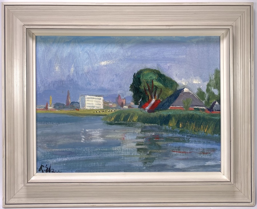 Olieverf op linnen door Ruurd Elzer (1915 - 1995) gezicht op Groningen vanaf de sluis bij Dorkwerd, tweede helft 20e eeuw, marouflé. Post impressionistisch landschap met boerderij, rivier en stadssilhouet in blauw- en groentinten, uitgevoerd met levendige penseelstreek. Achterzijde met opschrift betreffende techniek en locatie. Linksonder onduidelijk gesigneerd. Geïnteresseerd? Bezoek onze kijkdagen op 28, 29 of 30 november van 11:00 tot 17:00 uur! |