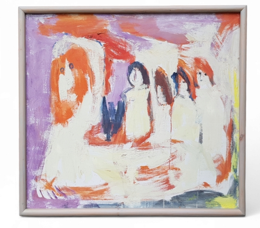 Olieverfschilderij door de Nederlandse kunstenaar Karel Frank Carvalho (1916–1972), gesigneerd 'Carvalho', uitgevoerd in olieverf op doek. Het werk is een figuratief expressionistische voorstelling uit midden 20e eeuw, met een ruwe pasteuze schildertechniek. De voorstelling toont een abstracte groep figuren in een levendig kleurenpalet van wit, oranje, violet en donkerblauw. Geïnteresseerd? Bezoek onze kijkdagen op 28, 29 of 30 november van 11:00 tot 17:00 uur! |