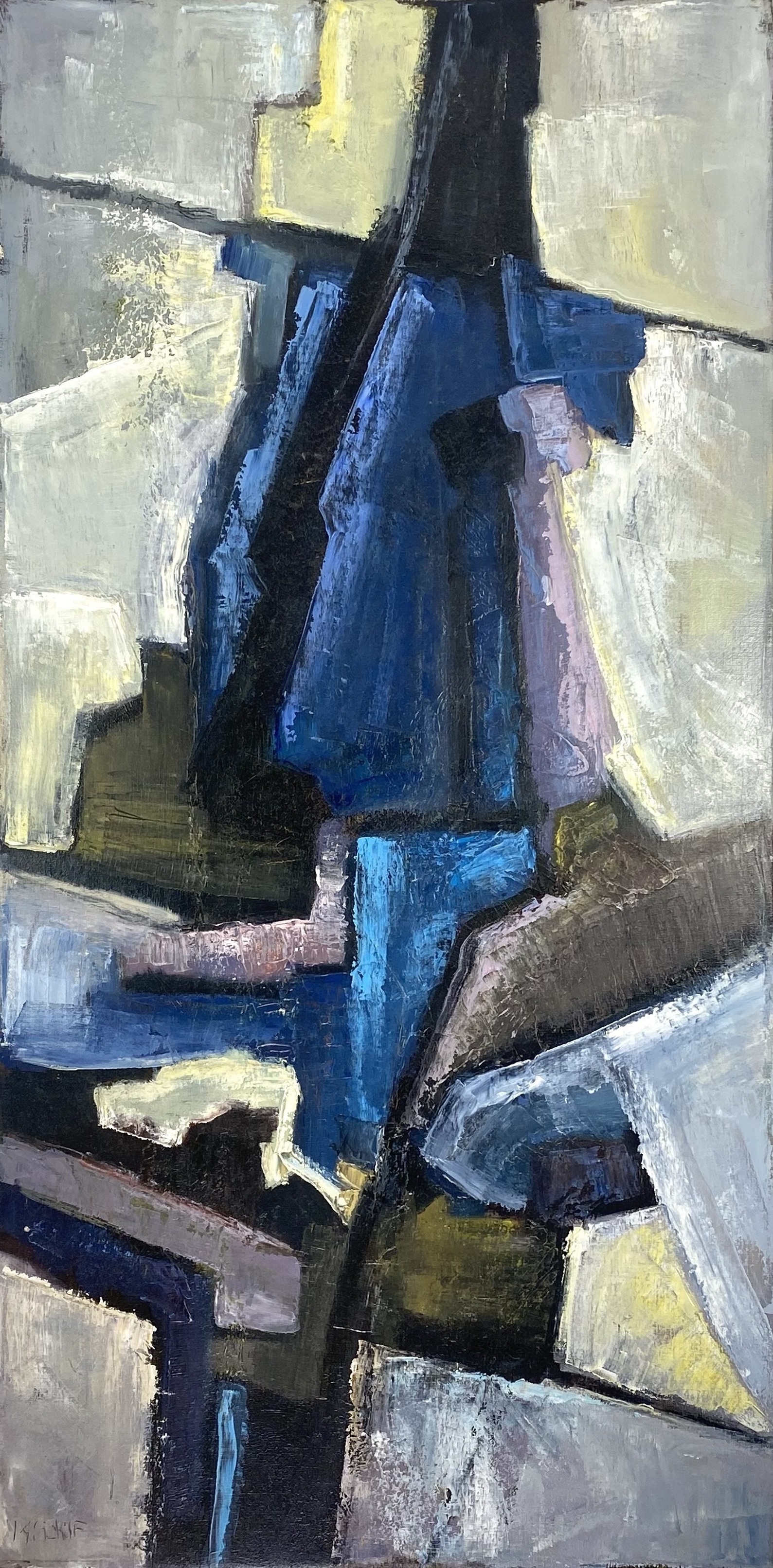 Olieverfschilderij op doek, uitgevoerd in lyrisch abstracte stijl, circa 1950–1970. De compositie bestaat uit een verticaal georiënteerd samenspel van abstracte vormen, gedomineerd door een centraal diepblauw vlak en omringd door wit, grijs en geel. Linksonder onduidelijk gesigneerd. Geïnteresseerd? Bezoek onze kijkdagen op 28, 29 of 30 november van 11:00 tot 17:00 uur! |