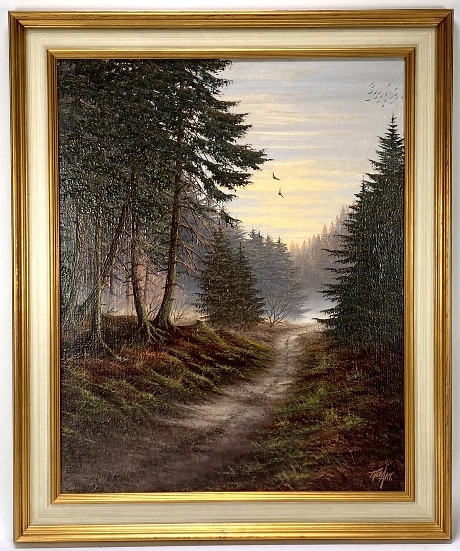 Olieverfschilderij op doek van een boslandschap in naturalistisch romantische stijl, gesigneerd 'THEO ART.' en gedateerd circa 1970–1990. Het werk toont een pad door dichte naaldbossen met sterke atmosferische dieptewerking en een geel licht in de mistige horizon. Het schilderij bevindt zich in een traditionele goudkleurige lijst. Wil je direct deelnemen? Plaats vanaf 21 november alvast een schriftelijk bod via onze website! |