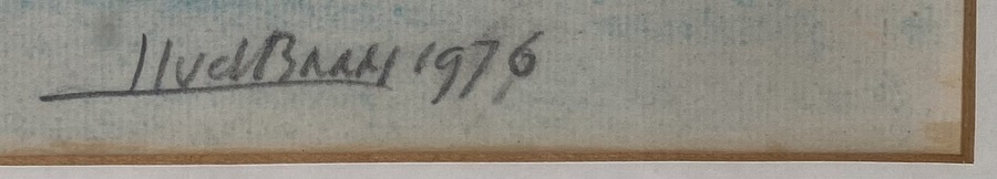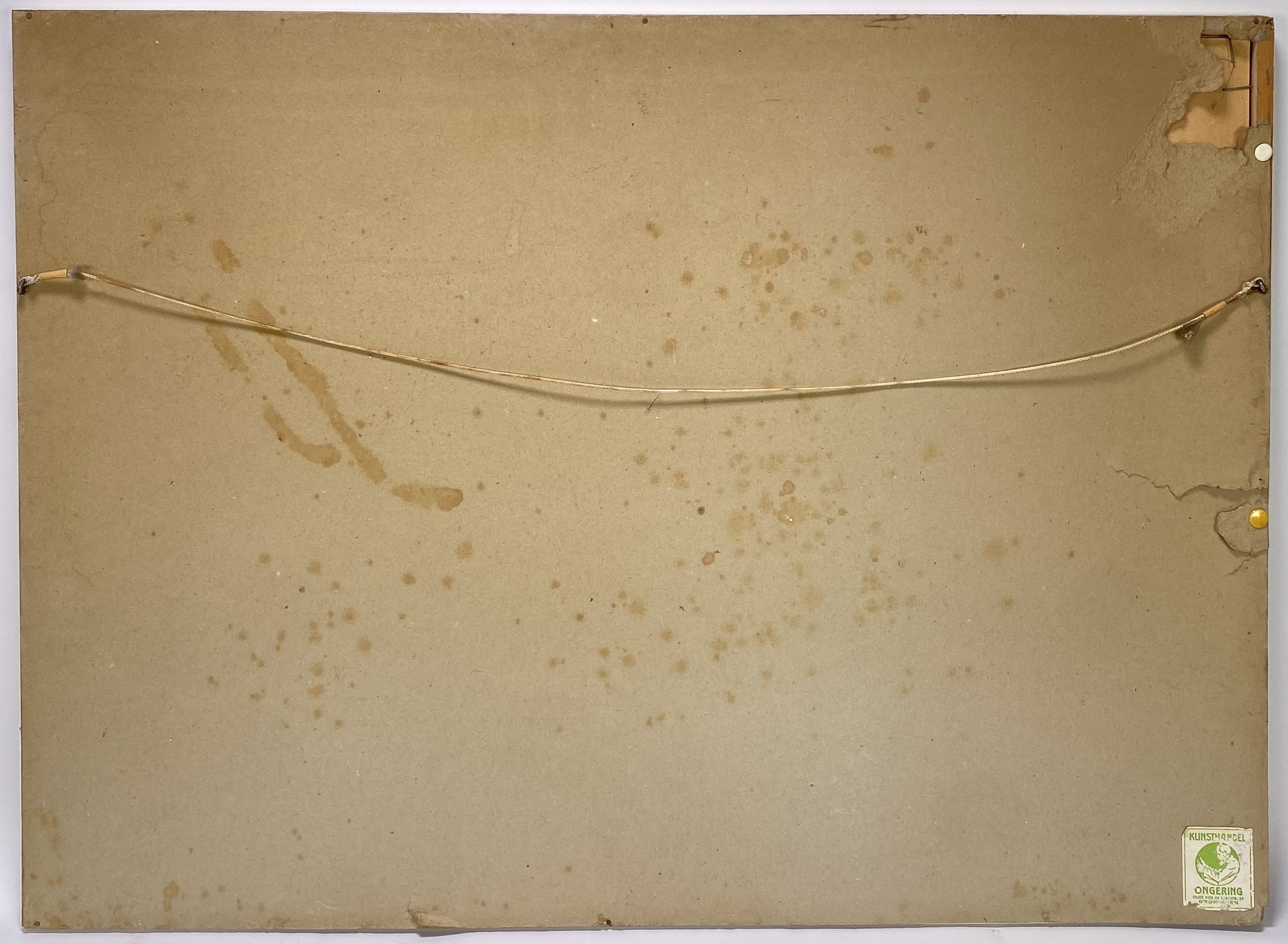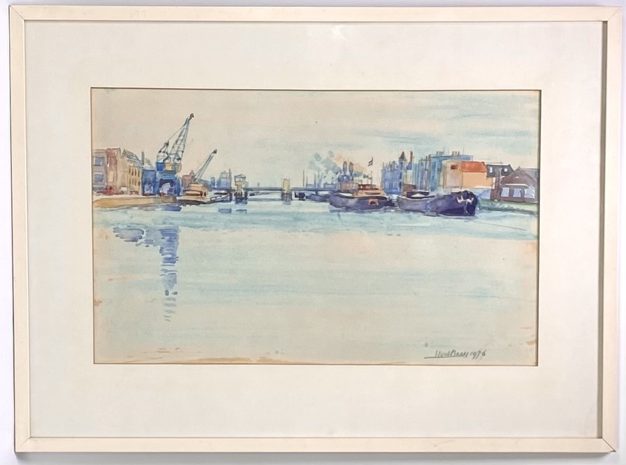 Maritieme aquarel op papier door Jan Lucas van der Baan (1912–1990), lid van Groninger Kunstkring De Ploeg. De aquarel uit 1976 is uitgevoerd in een post-impressionistische stijl met losse penseelvoering. De voorstelling toont een Nederlands havengezicht met schepen en hijskranen langs een kade, weergegeven in transparante, aquatische kleuren. Het werk is rechtsonder gesigneerd en gedateerd 'JL v.d. Baan 1976'. Wil je dit aquarel in het echt bekijken? Kom naar de kijkdagen op 28, 29 en 30 november! |