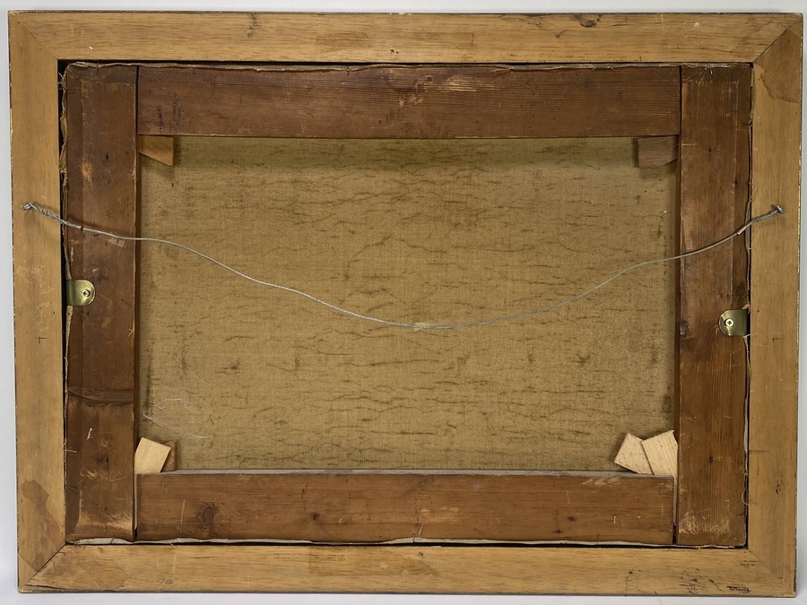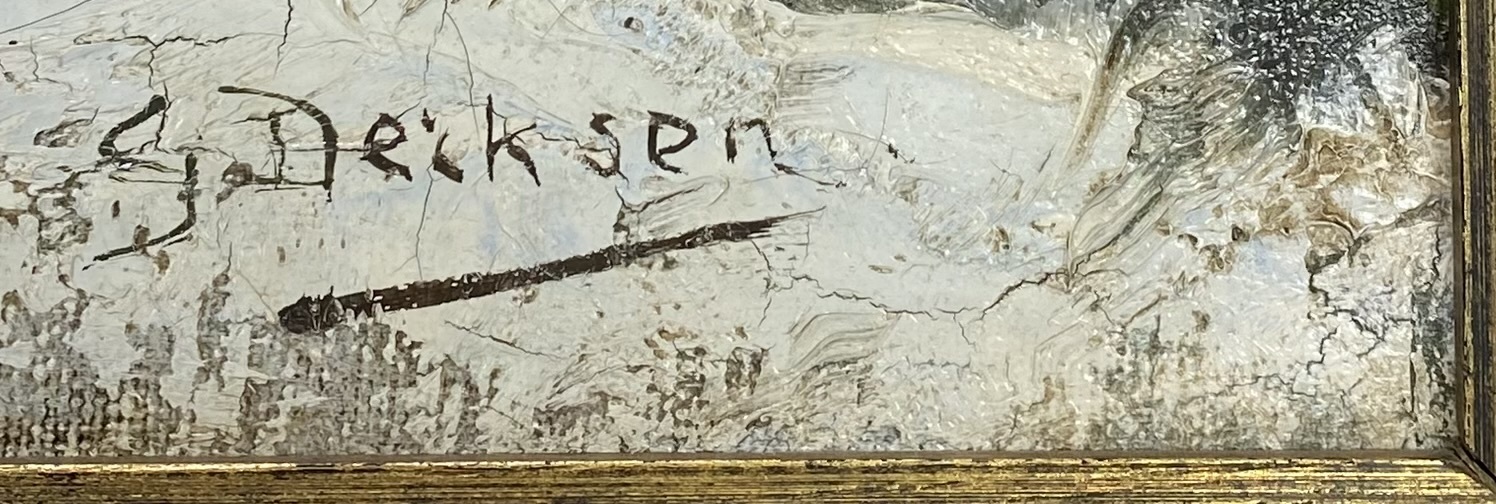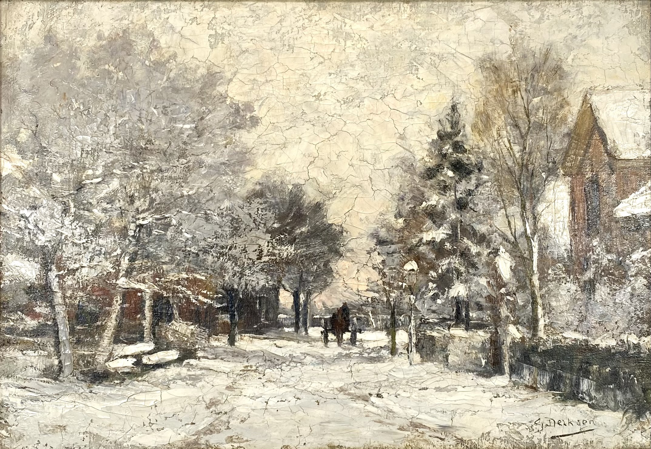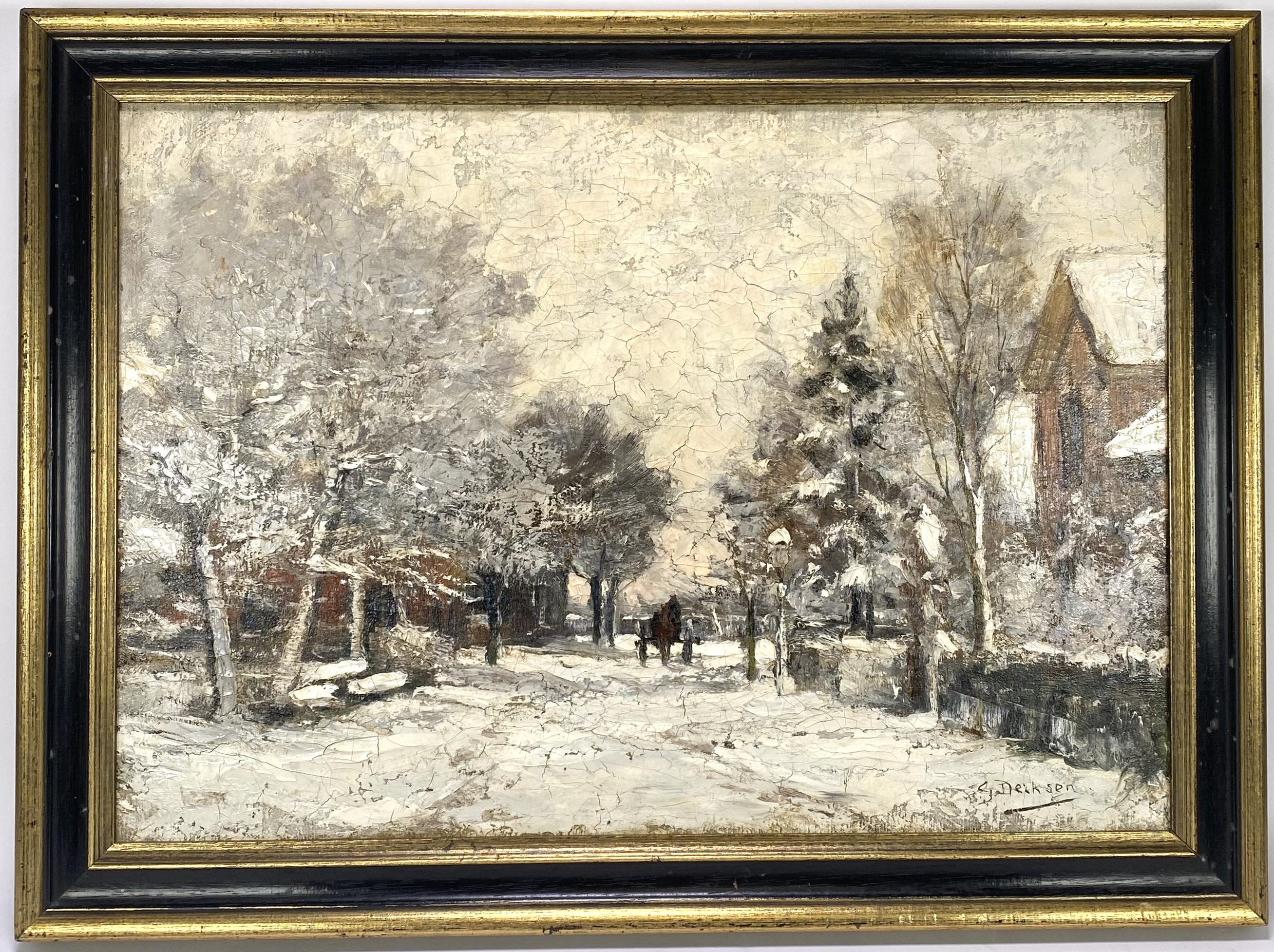 Olieverfschilderij op doek door Gijsbertus Derksen (1870–1920) in realistische stijl met impressionistische toets, voorstellend een winterlandschap met bomen, huizen en een paard met wagen op een besneeuwde weg. De verf is pasteus en levendig opgezet met nadruk op licht en sfeer. Het schilderij bevindt zich in een zwartgelakte lijst met goudkleurige binnenrand. Wil je dit schilderij in het echt bekijken? Kom naar de kijkdagen op 28, 29 en 30 november! |