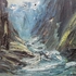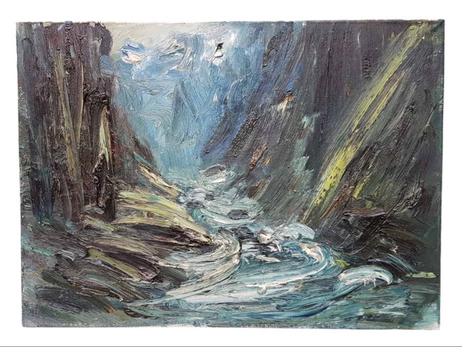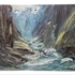 Olieverfschilderij, toegeschreven aan H. Kley – kloof met woest water, midden 20e eeuw