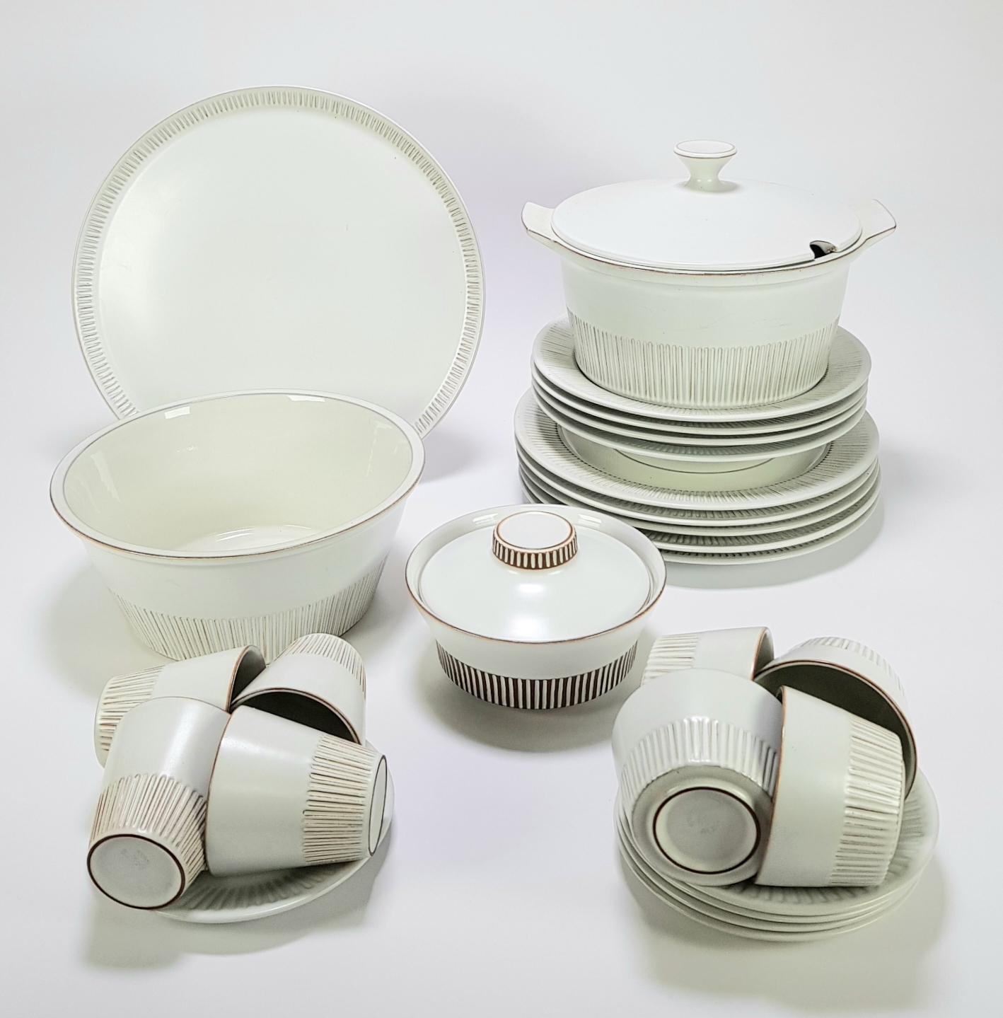 Lot aardewerk servies model Cleopatra, ontworpen door Willem de Vries voor Fris Keramiek Edam, Nederland. Het design is Mid-century modern uit de midden 20e eeuw, uitgevoerd in wit glazuur met verticale bruine lijndecoratie. Het lot bevat onder meer een soepterrine, grote serveerschalen en conische kopjes en schotels. Klaar om te bieden? Registreer je nu en doe mee aan de veiling! |
