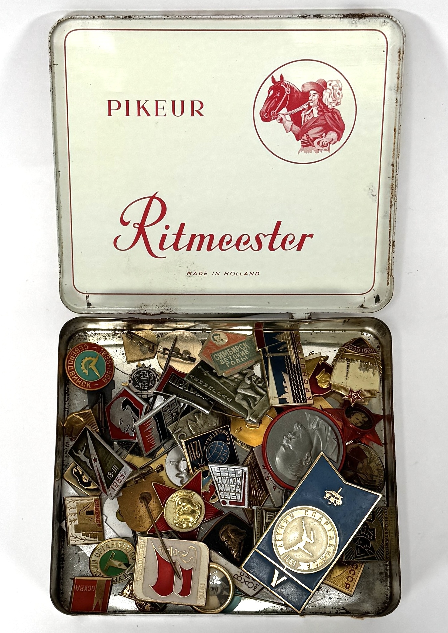 Een vintage Ritmeester Pikeur sigarenblik uit Nederland, gevuld met een verzameling Sovjet-Russische speldjes (znachki). Het blik dateert uit de jaren 1960–1970 en is vervaardigd van bedrukt metaal, de inhoud bestaat uit tientallen geëmailleerde metalen speldjes uit de USSR, periode ca. 1960–1980, met afbeeldingen van Lenin, Karl Marx, communistische symboliek, steden en evenementen. Wil je direct deelnemen? Plaats vanaf 21 november alvast een schriftelijk bod via onze website! |