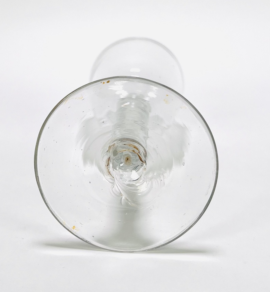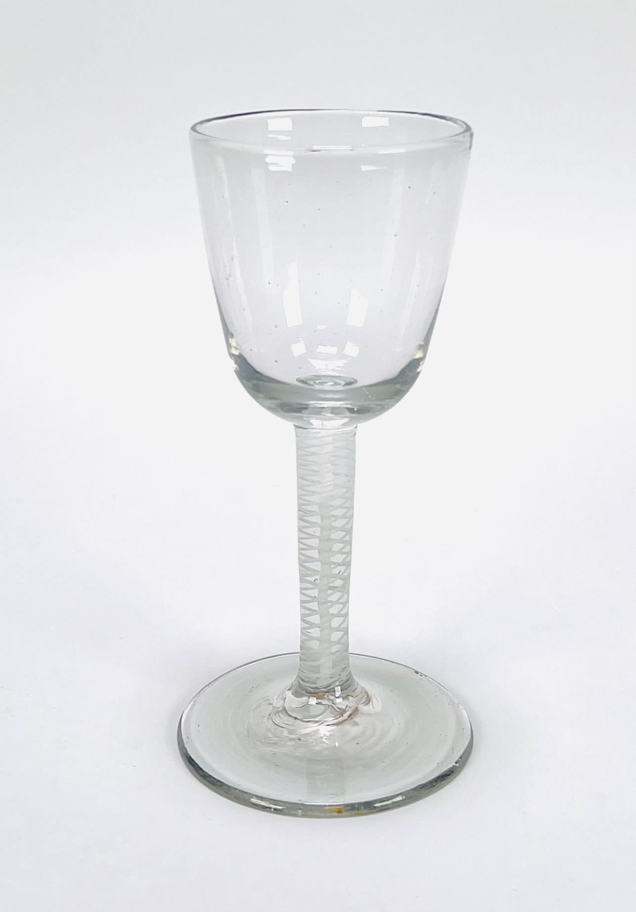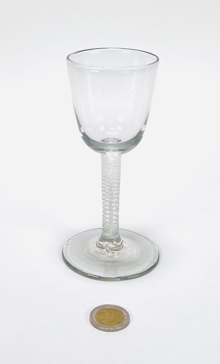Slingerglas, 18e eeuw, met spiraalvormige luchtinsluiting en witte latticino-decoratie in de holle stam, vervaardigd uit helder mondgeblazen glas met tulpvormige kelk en ronde schijfvoet. Datering circa 1750–1780, Engeland. Het glas toont de kenmerkende air-twist-techniek van rococo-glasblazerijen en werd ambachtelijk gevormd met zichtbaar pontil aan de onderzijde, typerend voor vroeg handgemaakt tafelglas uit deze periode. Eerst dit glas zien voordat je biedt? Bezoek onze kijkdagen op 28, 29 en 30 november van 11:00 tot 17:00 uur! |