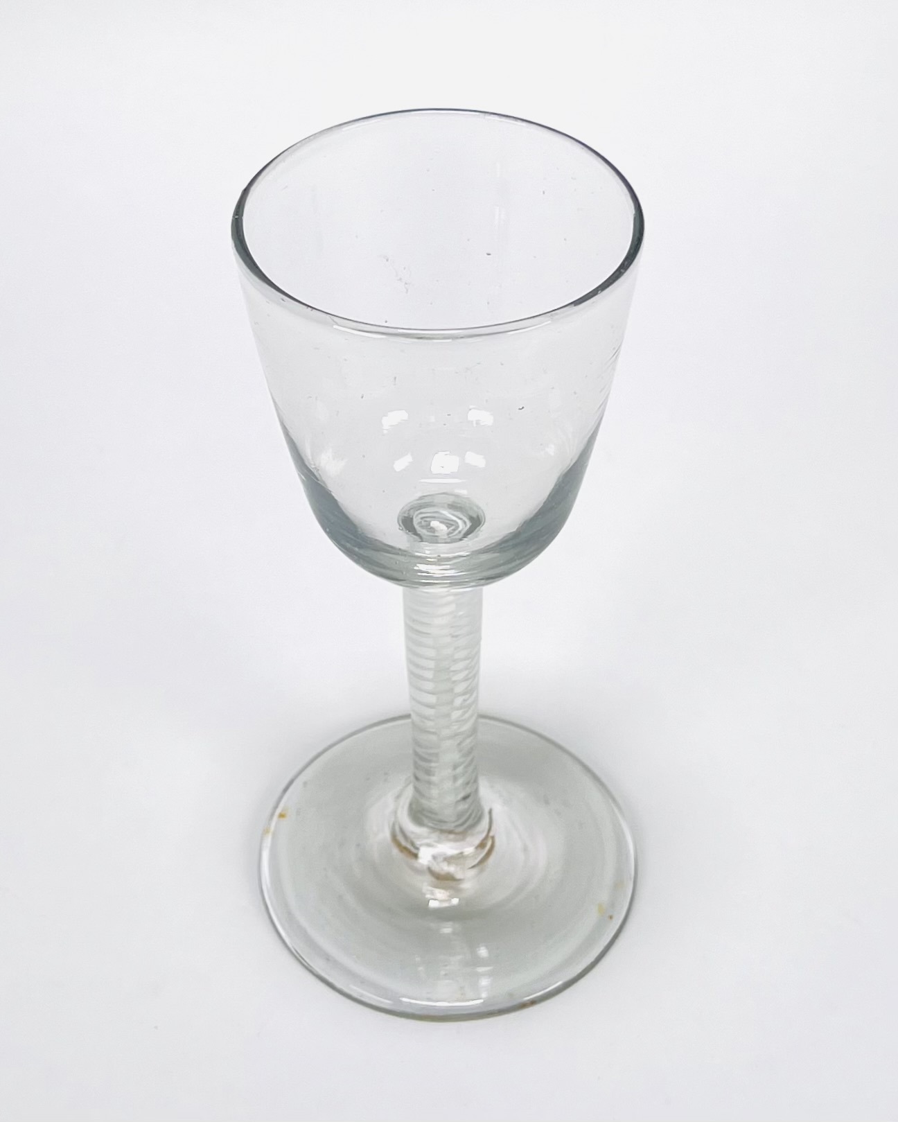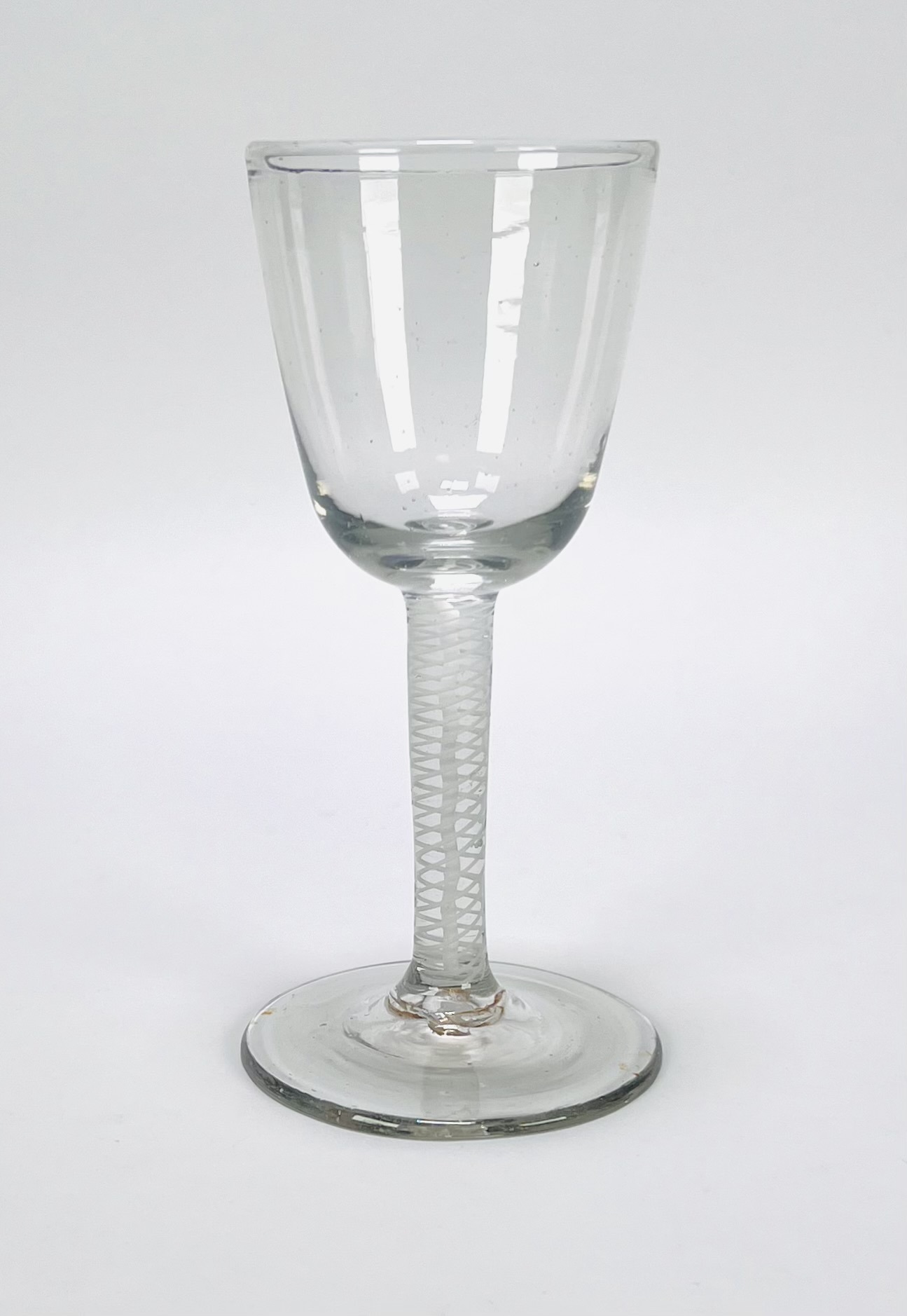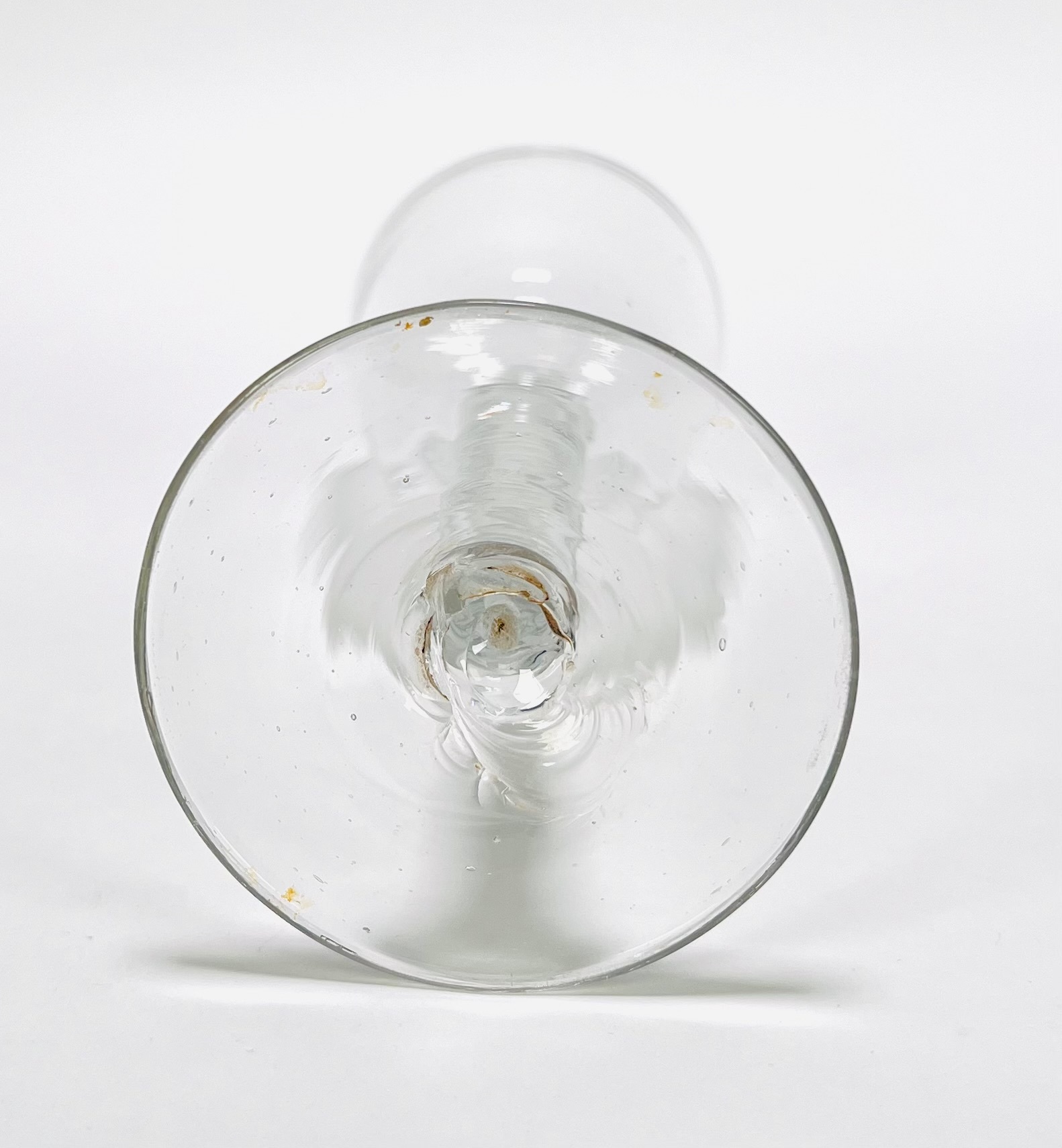 Slingerglas, 18e eeuw, met spiraalvormige luchtinsluiting en witte latticino-decoratie in de holle stam, vervaardigd uit helder mondgeblazen glas met tulpvormige kelk en ronde schijfvoet. Datering circa 1750–1780, Engeland. Het glas toont de kenmerkende air-twist-techniek van rococo-glasblazerijen en werd ambachtelijk gevormd met zichtbaar pontil aan de onderzijde, typerend voor vroeg handgemaakt tafelglas uit deze periode. Eerst dit glas zien voordat je biedt? Bezoek onze kijkdagen op 28, 29 en 30 november van 11:00 tot 17:00 uur! |