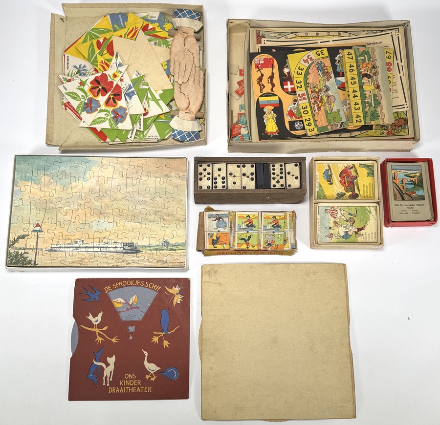 Tien historische kinderspelletjes en bezigheden, voornamelijk vervaardigd uit bedrukt karton en hout. De set bestaat uit bordspellen, een kwartetspel (o.a. Steden Kwarten 1953), domino, en draaitheater. De grafische stijl is kenmerkend voor Nederlandse kinderboekenillustratie van het midden 20e eeuw (circa 1930–1960), met heldere kleuren en nostalgische voorstellingen. De merken Victorie en ’t Koggescheepje zijn zichtbaar. Zeker zijn van deelname? Plaats vanaf 21 november een schriftelijk bod online! |
