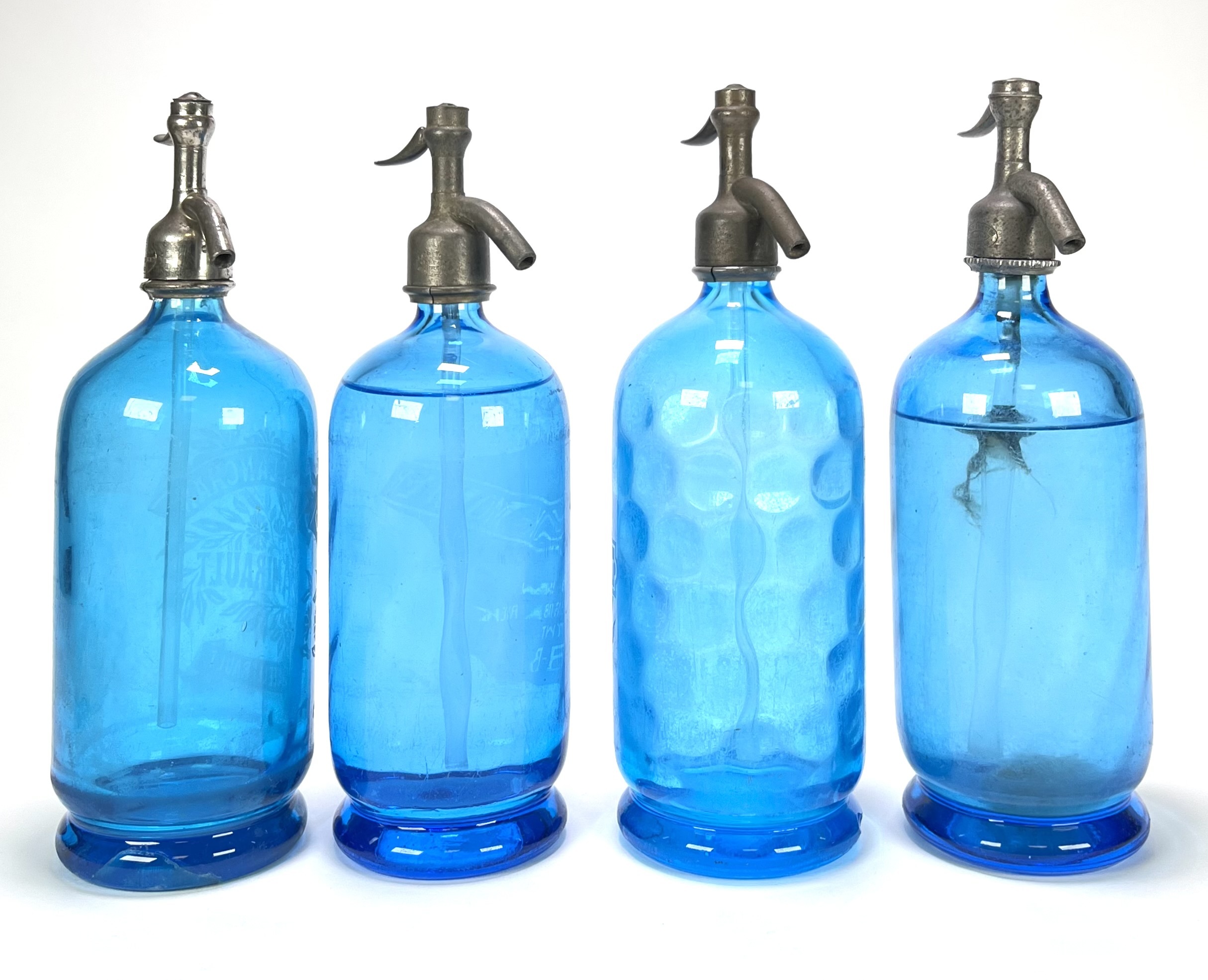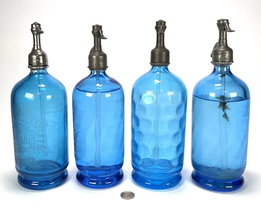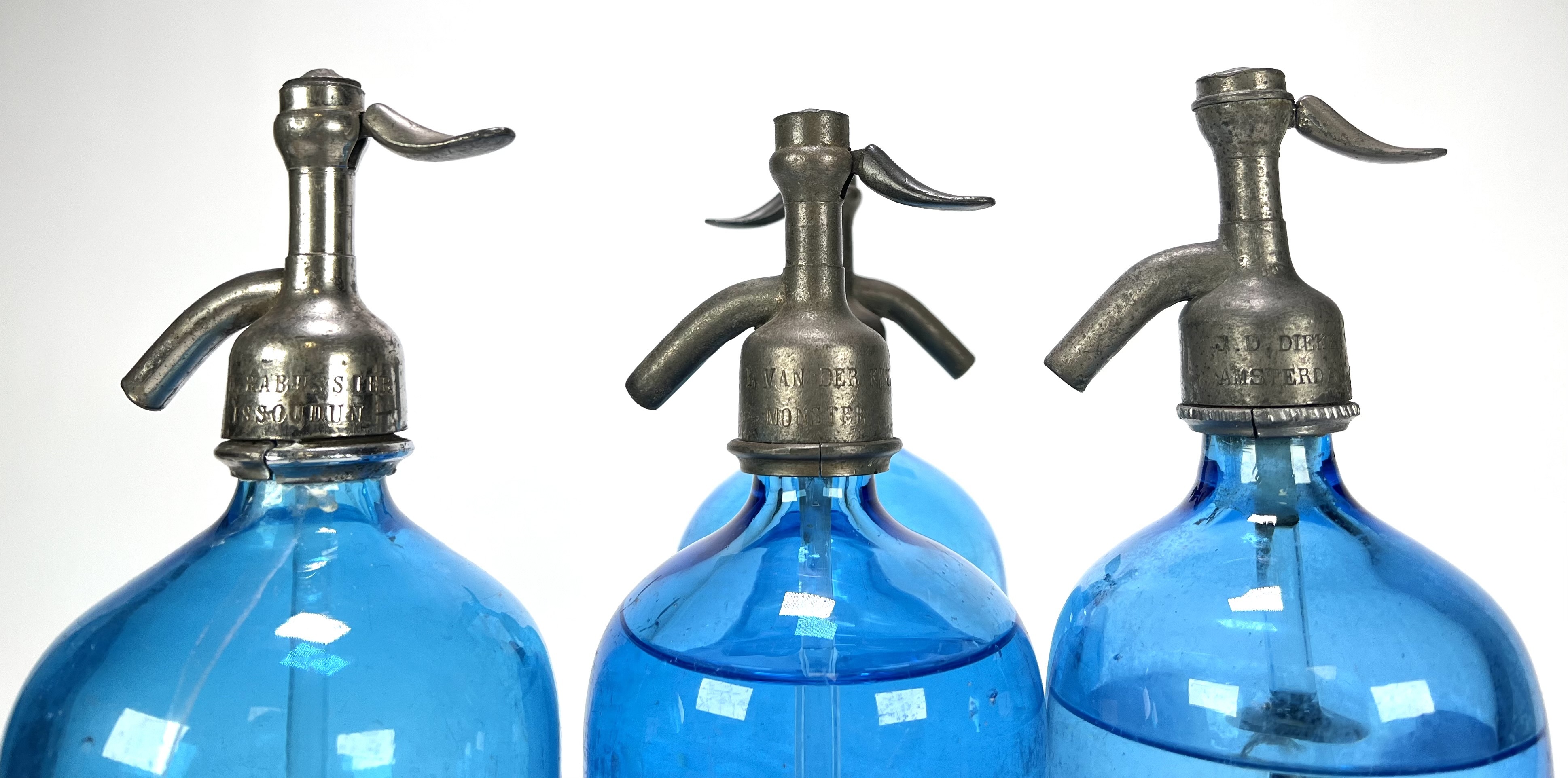 Lot met vier kobaltblauwe spuitflessen uit de Art Deco periode, vervaardigd middels persglastechniek met vernikkelde messing sifons en glazen stijgbuizen. De flessen dateren ca. 1910–1930 en twee flessen bevatten teksten van de oorspronkelijke drankenfabrikanten. Eén fles heeft een florale Art Nouveau ets uit Frankrijk (“Chatellerault”), terwijl het andere exemplaar functionele tekst voor een Nederlandse limonadefabriek (“Z-H-B”) draagt. Eén fles heeft een decoratief honingraatmotief. Klaar om te bieden? Registreer je nu en doe mee aan de veiling! |