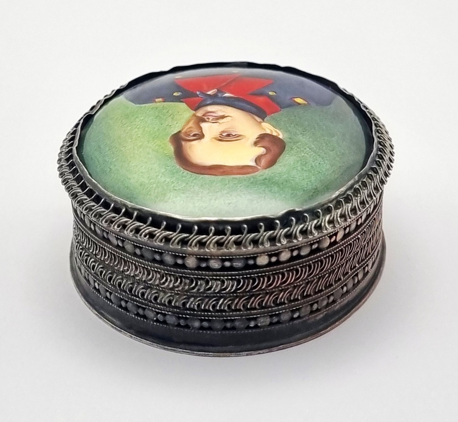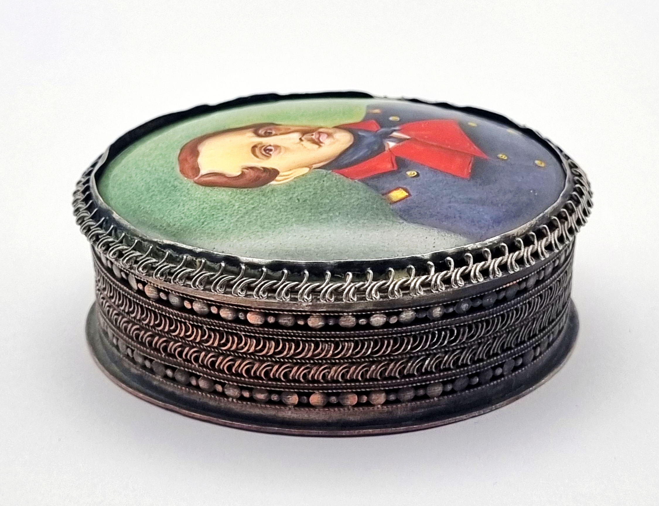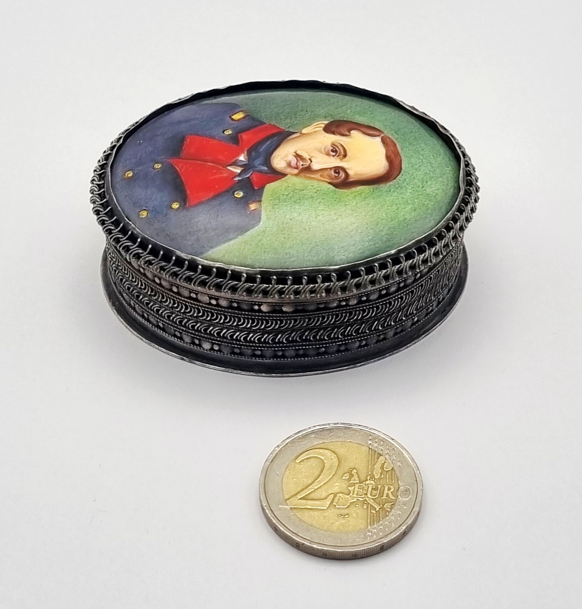 Ovaal metalen doosje met afneembaar deksel is vervaardigd uit een zilverlegering en gedecoreerd met een filigraan patroon aan de zijkant en het deksel. Het deksel bevat een handgeschilderd miniatuurportret van een man in militair uniform met opvallende rode halsdoek. Biedermeier periode circa 1840–1870. Klaar om te bieden? Registreer je nu en doe mee aan de veiling! |