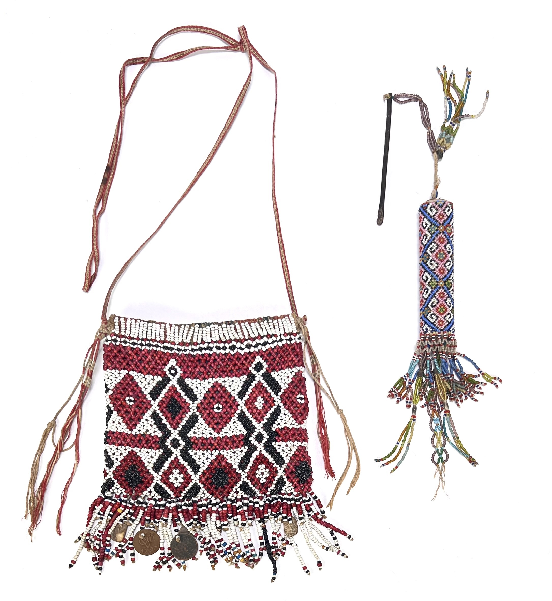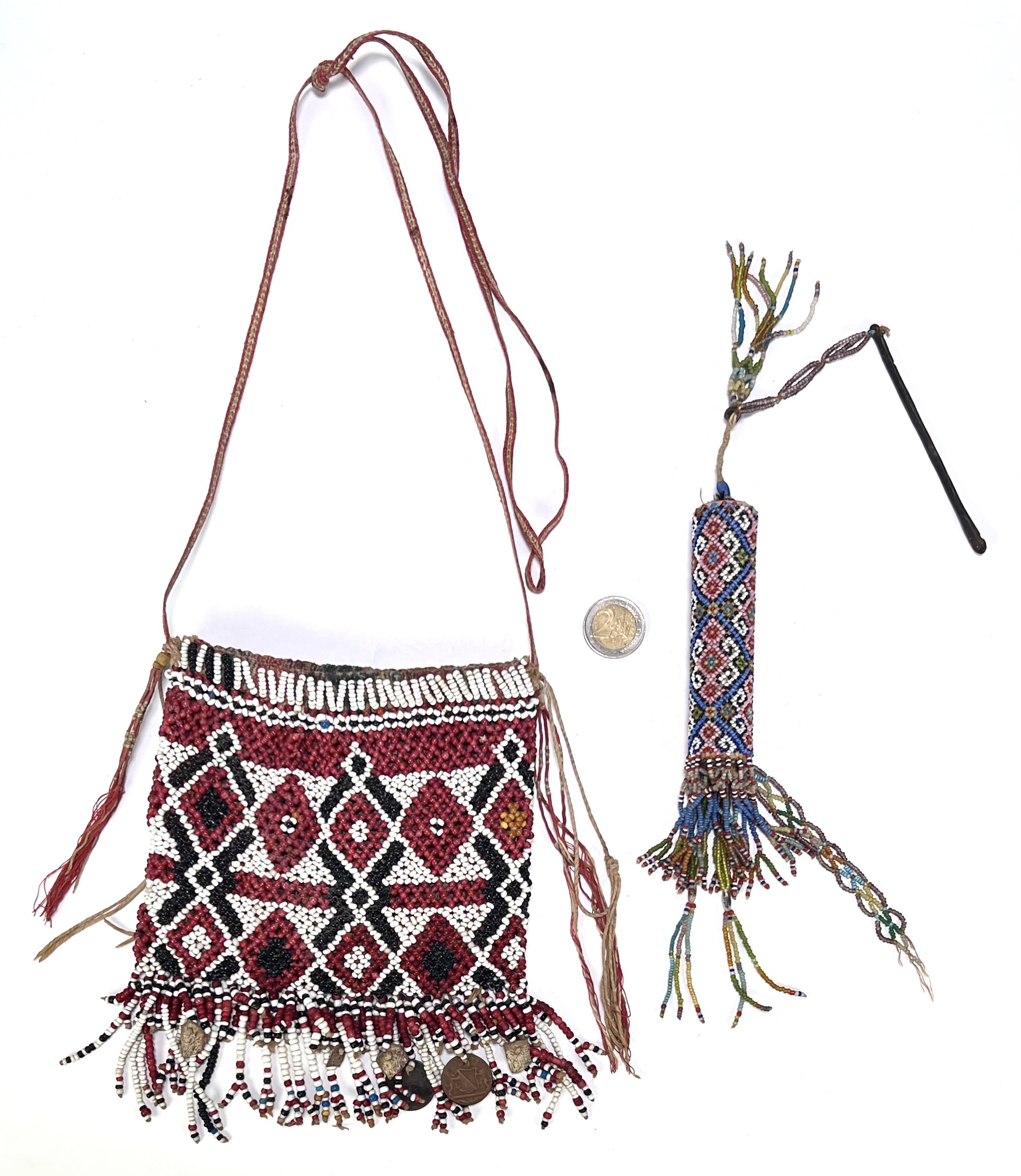 Masai gebruiksvoorwerpen uit Oost-Afrika, een schoudertas en een cilindrische koker, beide vervaardigd met handmatig kralenwerk op een basis van textiel. De tas heeft een veelkleurig dicht geometrisch ruitpatroon en lange kralen franjes aan de onderzijde. Tweede helft 20e eeuw en is typerend voor de traditionele Masai-cultuur. Je bent welkom op onze kijkdagen op 28, 29 en 30 november! |