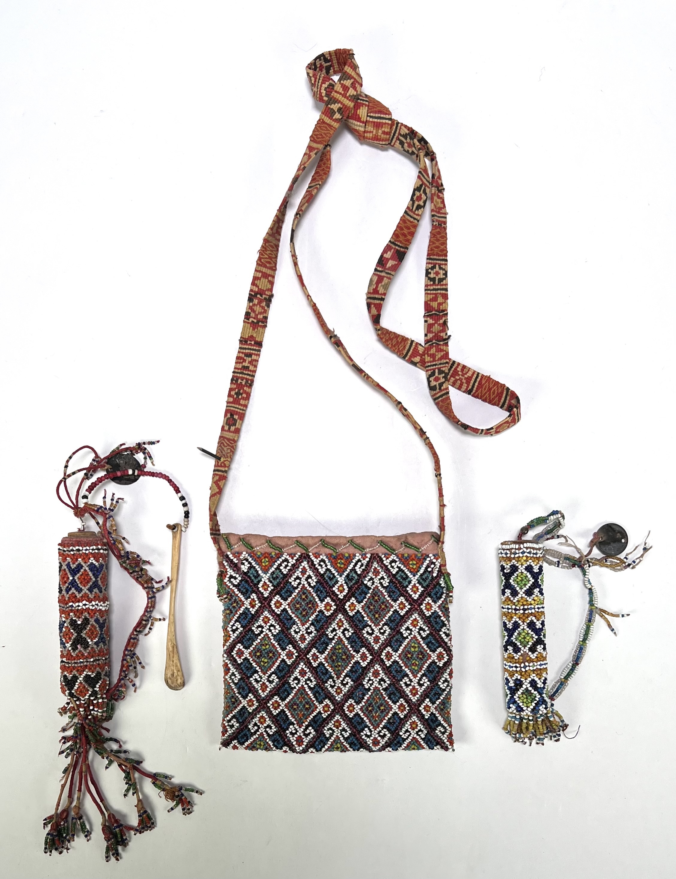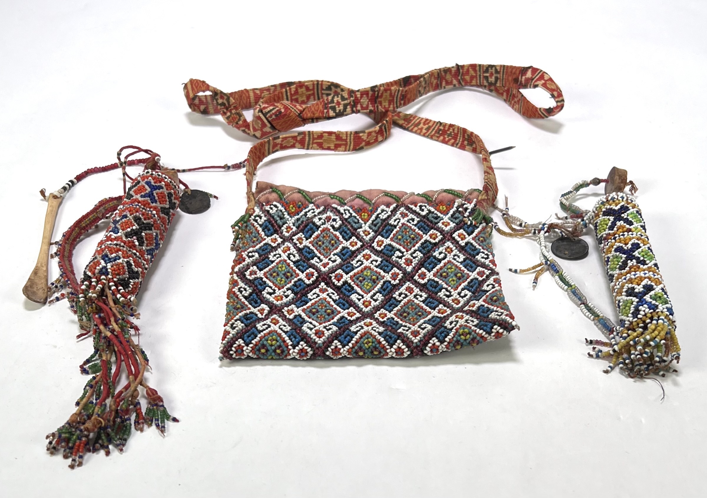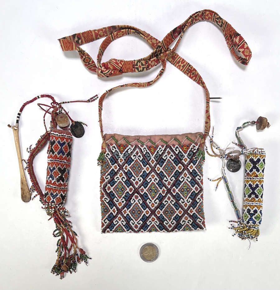 Masai gebruiksvoorwerpen uit Oost-Afrika, een schoudertas en een twee cilindrische kokers, beide vervaardigd met handmatig kralenwerk op een basis van textiel. De tas heeft een veelkleurig dicht geometrisch ruitpatroon en lange kralen franjes aan de onderzijde. Tweede helft 20e eeuw en is typerend voor de traditionele Masai-cultuur. Jouw kans op dit object begint met registreren – bied live of online mee! |