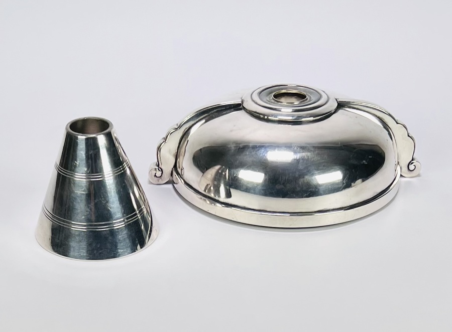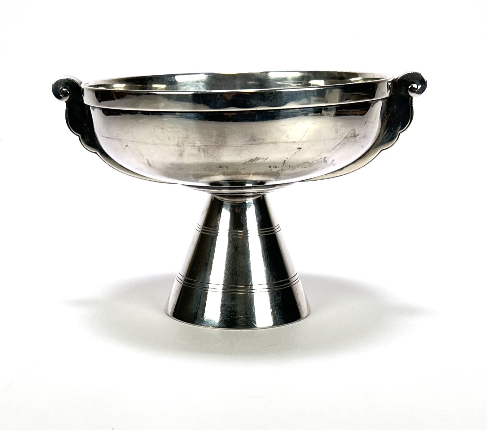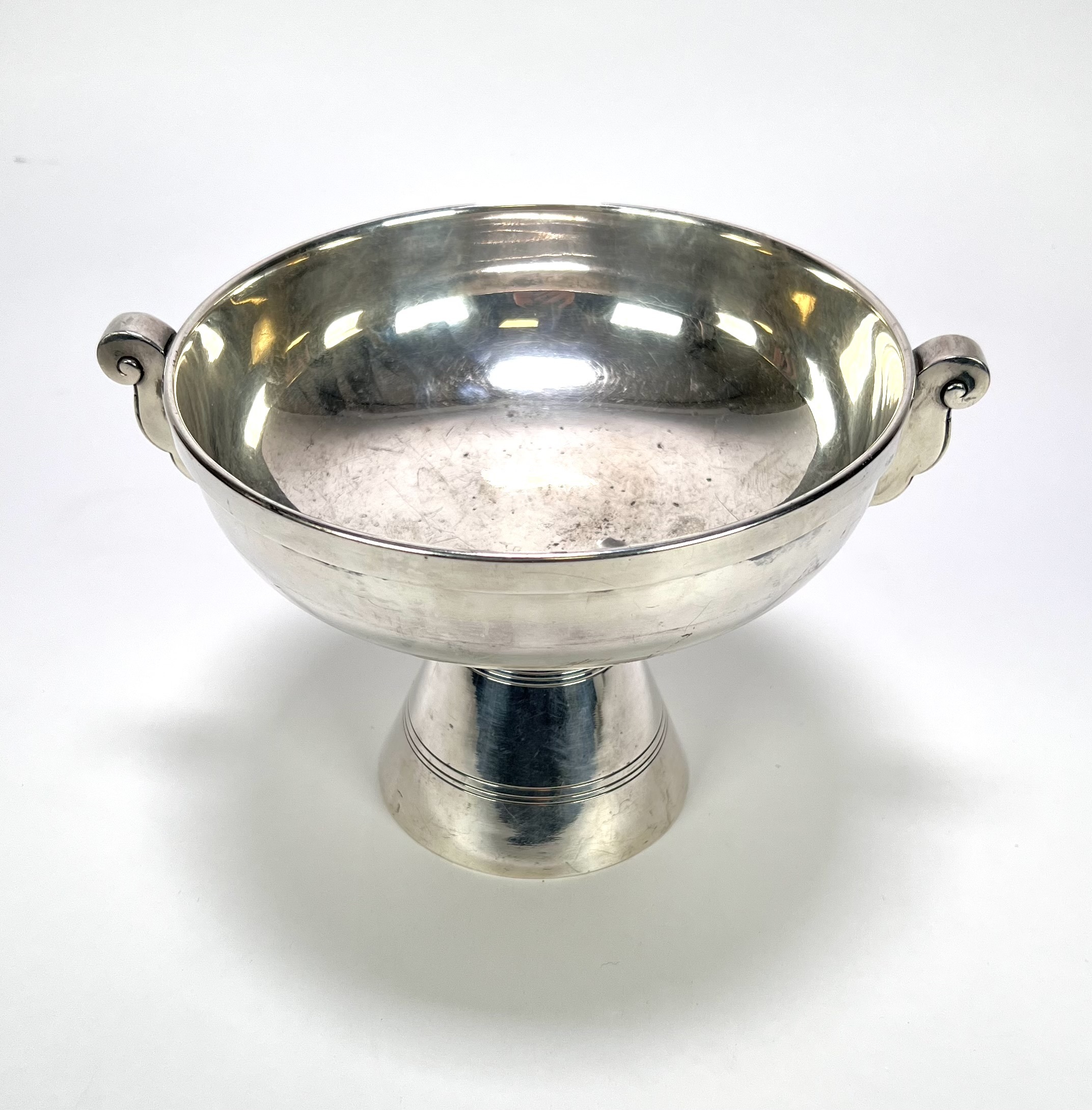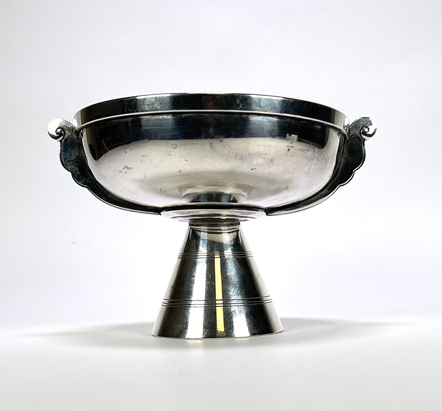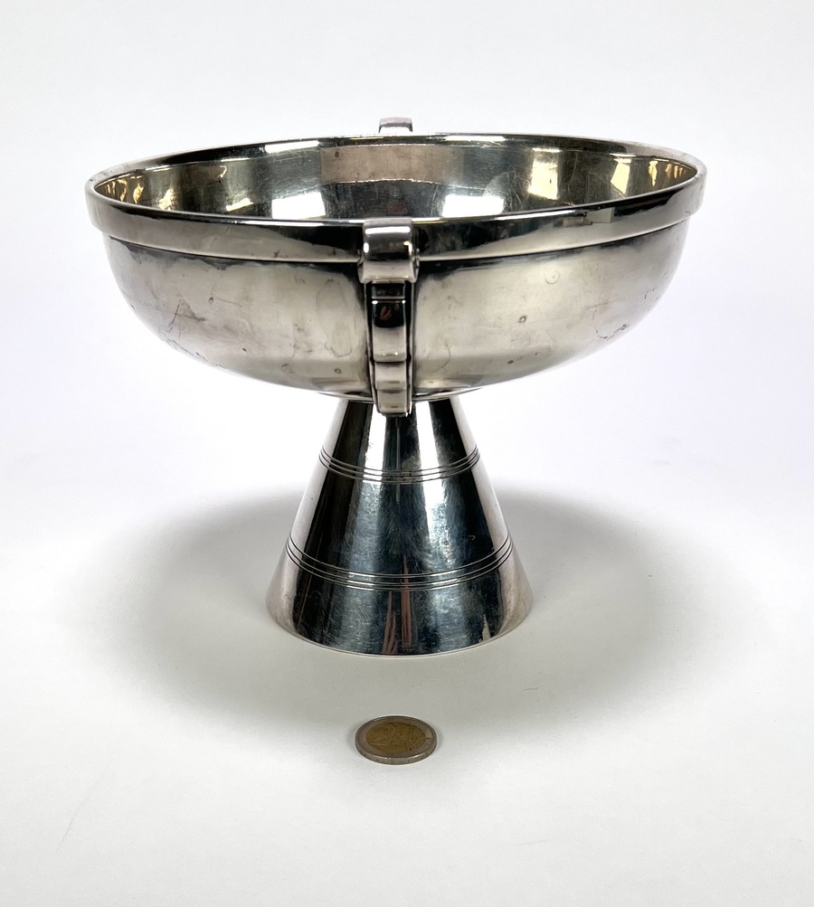 Fruitschaal uitgevoerd in verzilverd metaal uit de Art Deco periode, circa 1920–1935. De schaal heeft een brede kom met gestileerde opstaande handgrepen, rustend op een strakke conische stam en ronde voet. Kenmerkend is de geometrische vormgeving met meerdere strakke parallelle profielringen op de voet. Klaar om te bieden? Registreer je nu en doe mee aan de veiling! |