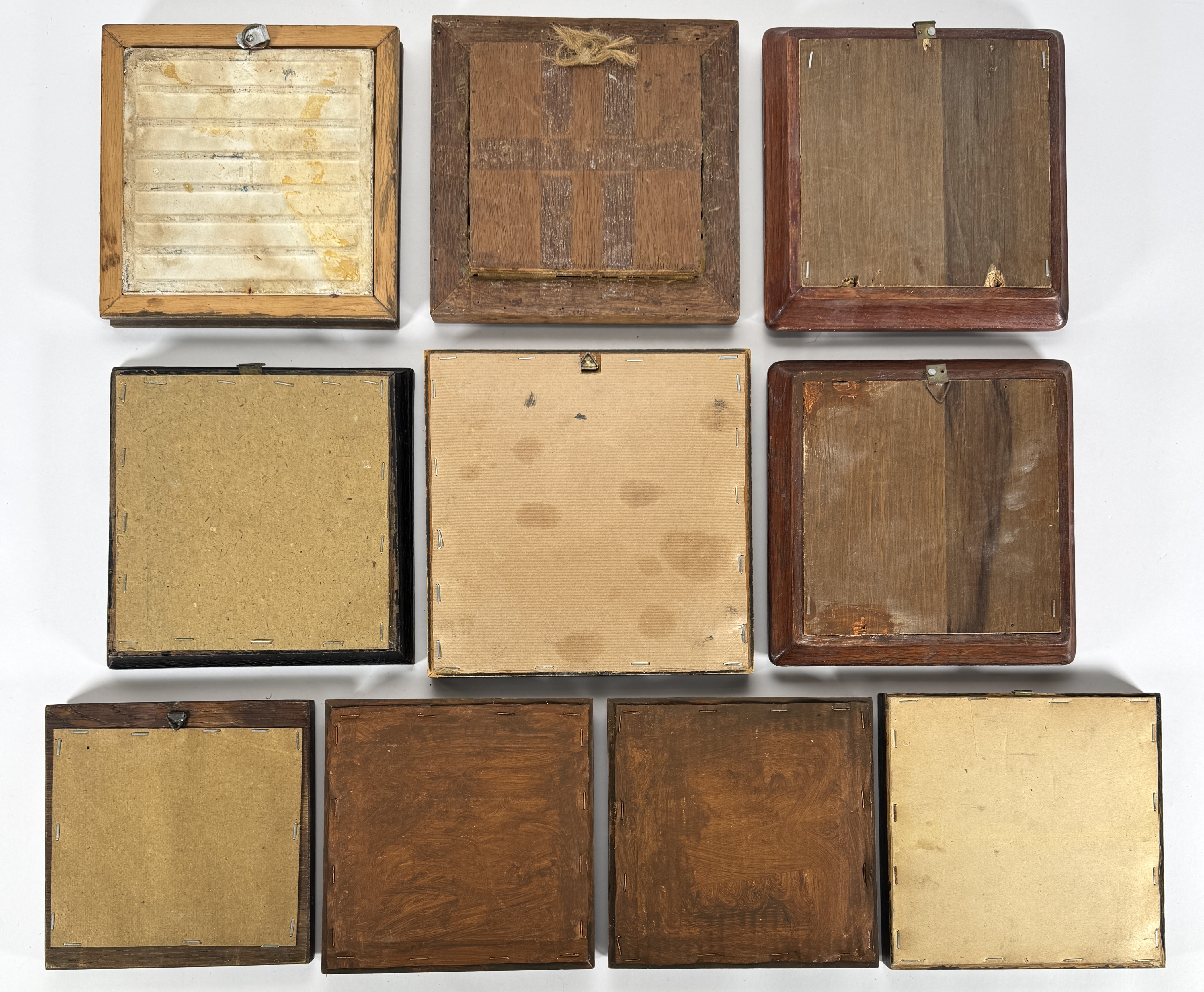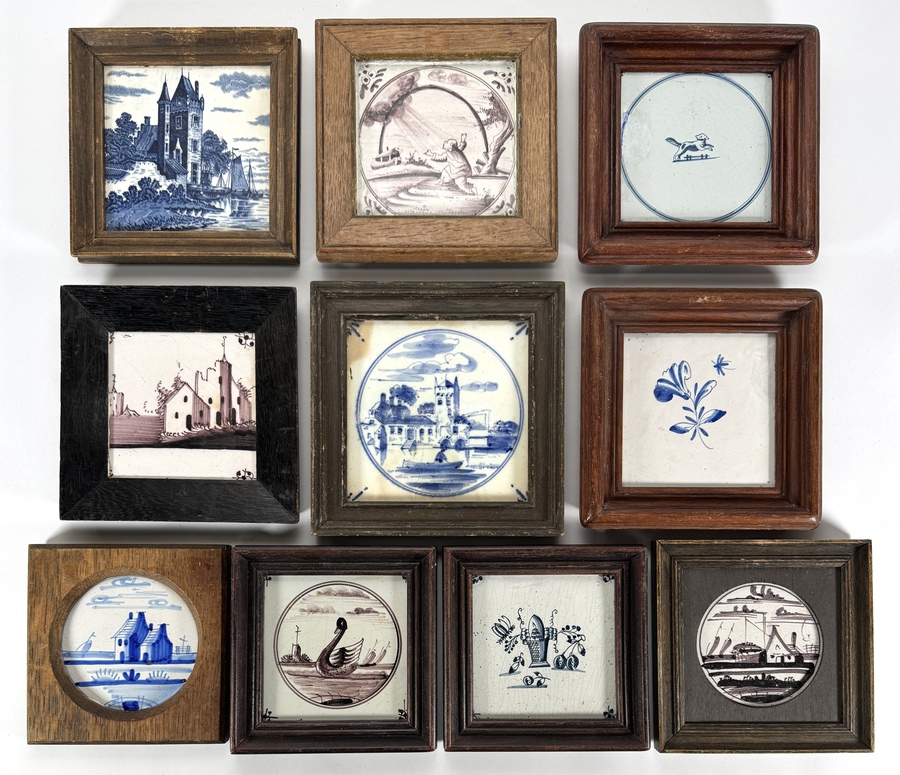 Lot Nederlandse aardewerken tegels bestaande uit tien ingelijste en 21 losse exemplaren uit de 18e, 19e en 20e eeuw. De tegels zijn handbeschilderd met blauwe en paarse metaaloxiden op tinglazuur, de voorstellingen omvatten traditionele motieven als landschappen, schepen, figuren en bloemen. De losse tegels hebben karakteristieke blauwe hoekornamenten. Klaar om te bieden? Registreer je nu en doe mee aan de veiling! |