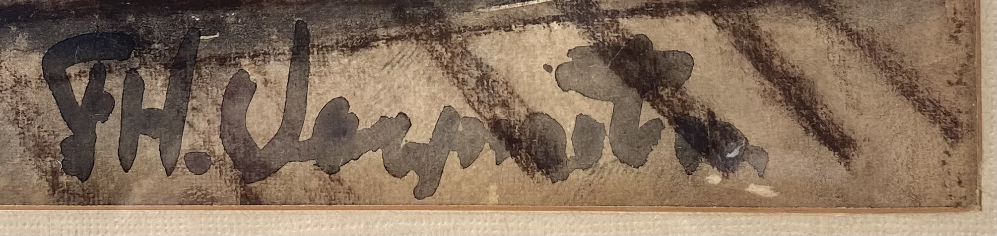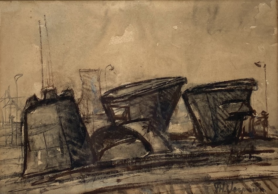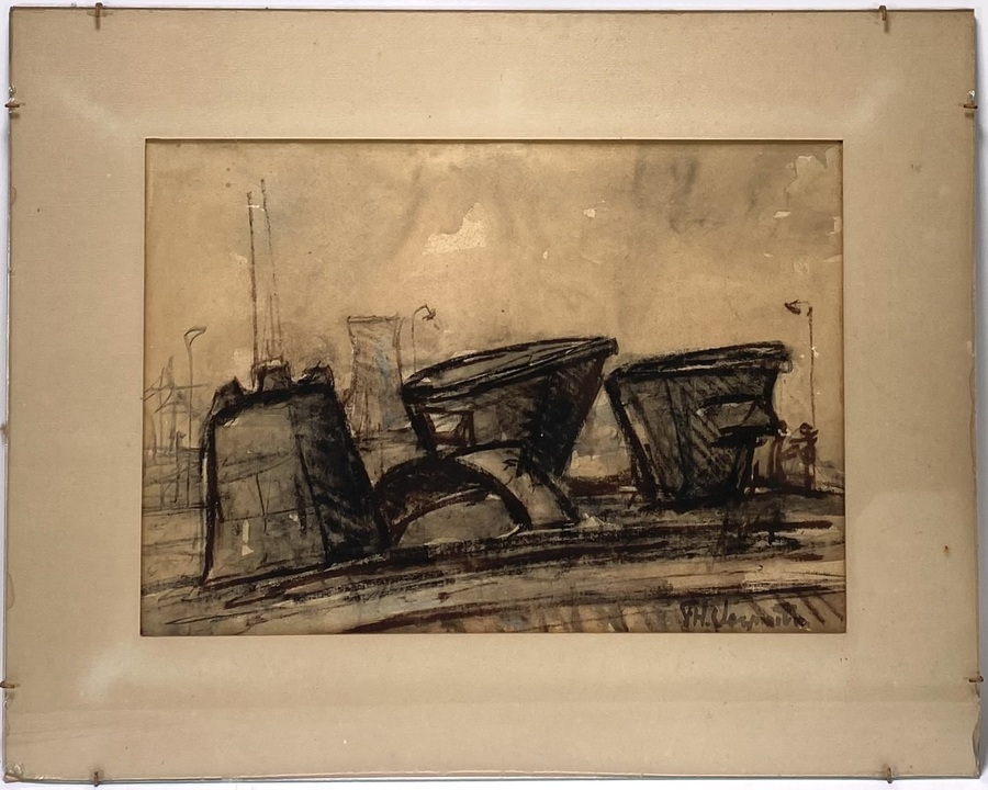 Tekening in houtskool en gewassen inkt op papier toont een abstract havengezicht, onduidelijk gesigneerd rechtsonder, uitgevoerd in expressionistische stijl. Gekenmerkt door krachtige, ongestructureerde lijnen, midden van de 20e eeuw. Kom langs tijdens de kijkdagen (28 t/m 30 november) en ontdek deze tekening zelf! |