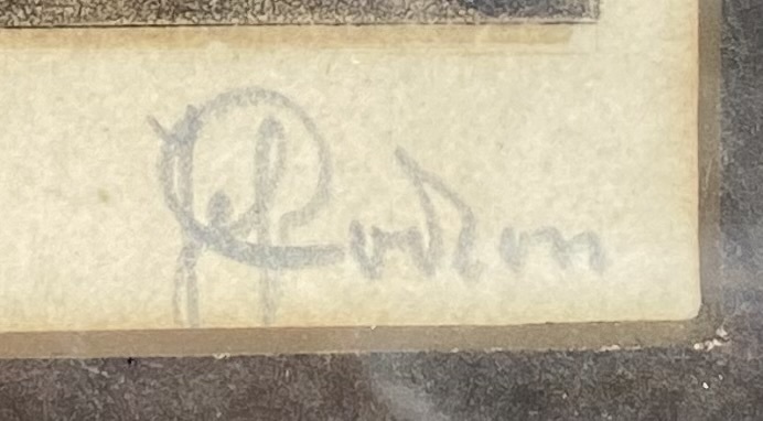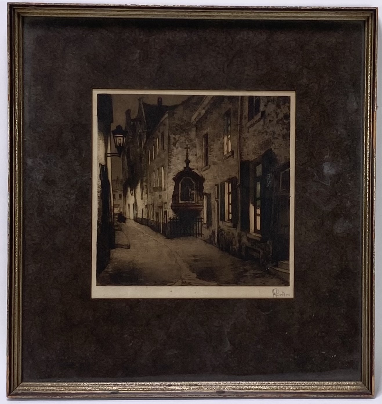 Ets op papier door Jef Codron (1882–1942), een Belgische graveur, uit circa 1910–1930. Het werk getiteld "Rue du Chien Marin", toont een smal Brussels steegje bij nacht in een realistische romantische stijl, in subtiele bruin-sepia tonen. Het is rechtsonder handgesigneerd in potlood en bevindt zich in een goudkleurige lijst met een donker passe-partout. Eerst deze ets zien voordat je biedt? Bezoek onze kijkdagen op 28, 29 en 30 november van 11:00 tot 17:00 uur! |