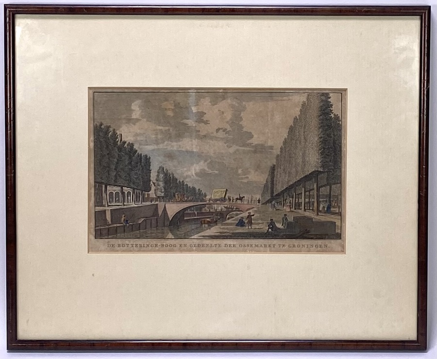 Deze handgekleurde kopergravure op papier uit 1794 is een vroeg topografisch werk uit de Nederlandse school. Het toont een realistisch gezicht op "De Botteringe-boog en Gedeelte der Ossemarkt te Groningen". De prent, uitgegeven door J. de Groot in Amsterdam, met figuren en voertuigen, kenmerkt zich door een gedetailleerde weergave van de stadsarchitectuur en de levendigheid langs het water. Het werk is voorzien van een donkerbruine lijst en passe-partout. Niet geïnspecteerd buiten de lijst. Eerst deze gravure zien voordat je biedt? Bezoek onze kijkdagen op 28, 29 en 30 november van 11:00 tot 17:00 uur! |