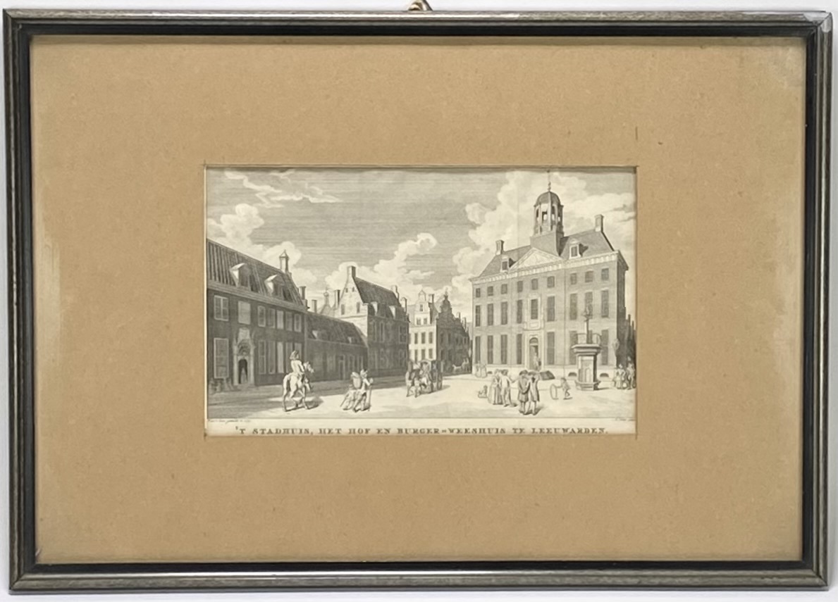 Kopergravure op vergé-papier door Abraham Hulk (1756–1815) met voorstelling van het Stadhuis, ’t Hof en het Burgerweeshuis te Leeuwarden, linksonder "naar 't leven getekend in 1785", rechtsonder A Hulk sculps. De prent toont classicistische 18e-eeuwse architectuur met stadsfiguren, ruiter en koets op de voorgrond. Fijn gegraveerd met helder licht-donkercontrast. In zilverkleurige lijst met beige passe-partout. Niet buiten de lijst geïnspecteerd. Deze kopergravure zelf beoordelen? Je bent welkom op onze kijkdagen op 28, 29 en 30 november! |