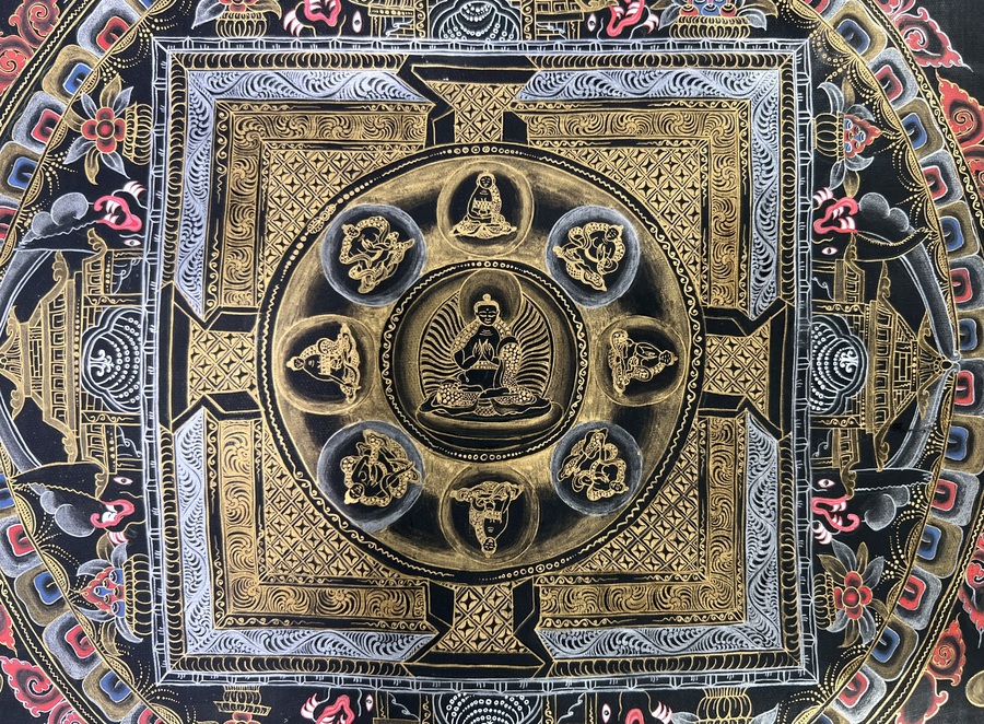 Traditionele Tibetaans boeddhistische Thangka (rolschildering) uit de tweede helft 20e eeuw, toont een complexe centrale mandala met een Boeddha en bijfiguren, geschilderd met pigmenten en goudverf op een papier. De Thangka is compleet met de traditionele textielmontage van zijdebrokaat, inclusief de gele boorden, rode linten en de gouden zijden sluier en komt uit de Himalaya-regio. Geïnteresseerd? Bezoek onze kijkdagen op 28, 29 of 30 november van 11:00 tot 17:00 uur! |