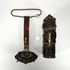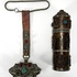 Tibetaanse rituele objecten bestaande uit een metalen amuletbuidel (ga'u) met leren draagband en een cilindrische houder. Beide objecten zijn vervaardigd uit koperlegering door middel van drijven en inlegwerk, gedateerd circa 1900–1940. Ze zijn gedecoreerd met reliëfvoorstellingen van Boeddhistische godheden en mantra-tekens, ingelegd met turquoise en koraal. Dit voorwerpen zelf beoordelen? Je bent welkom op onze kijkdagen op 28, 29 en 30 november! |