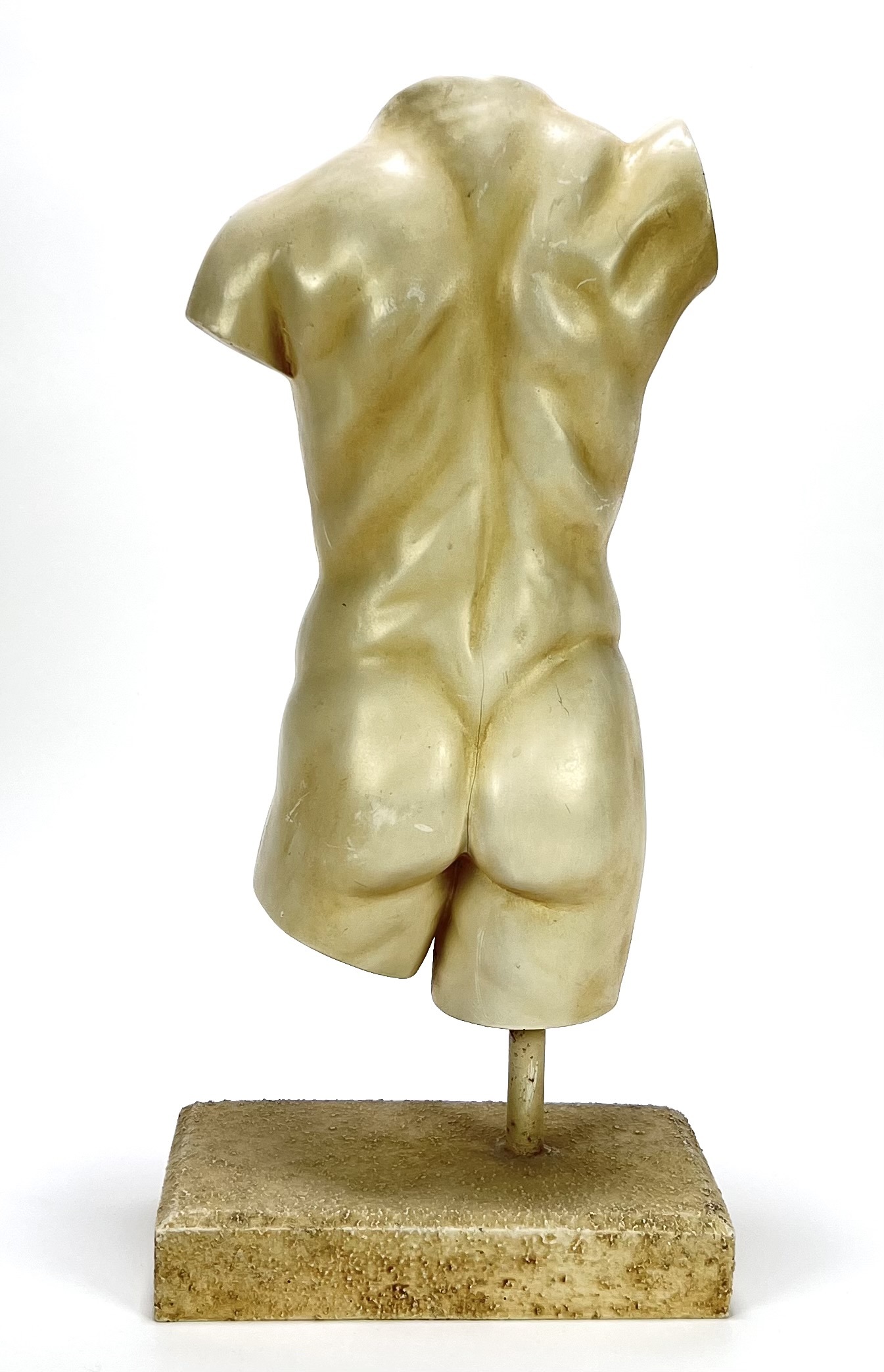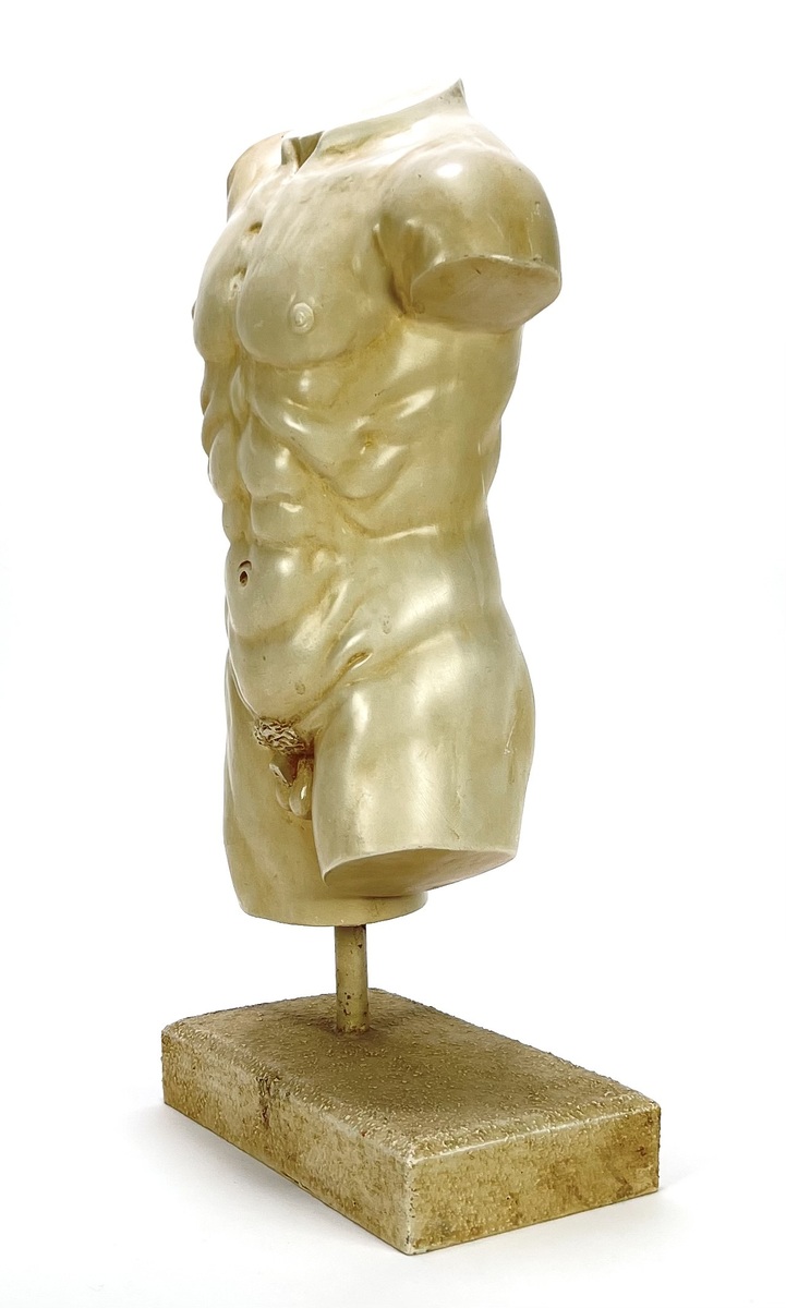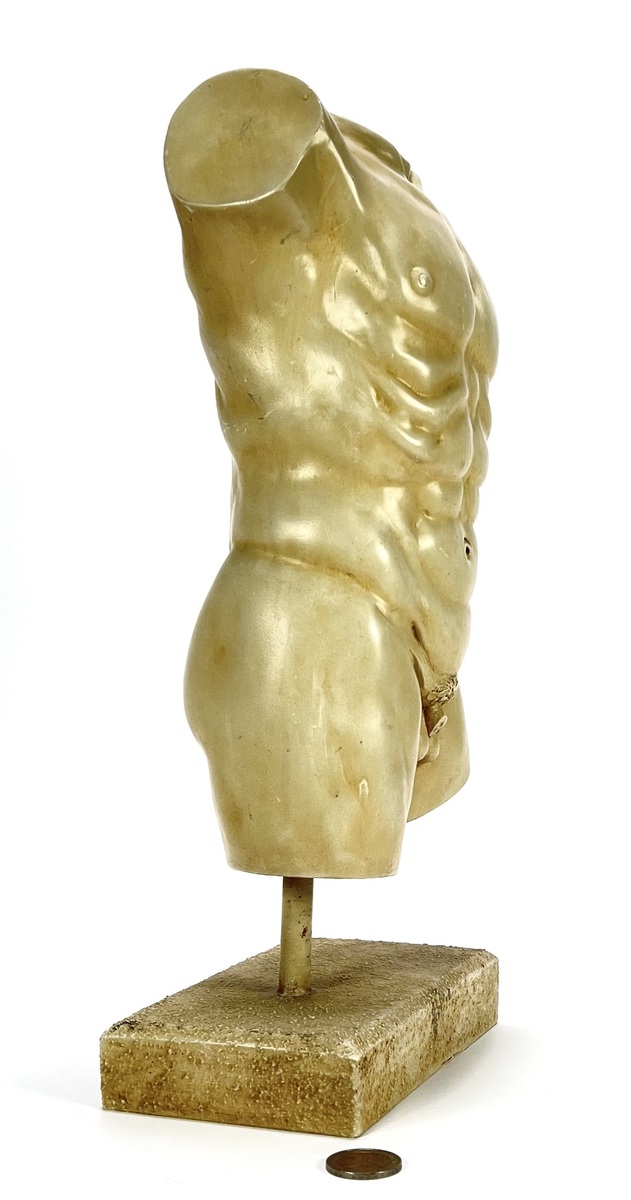Mannelijk torso, moderne fragmentarische beeld in neoklassieke stijl, vervaardigd in de tweede helft van de 20e eeuw. Uitgevoerd in gegoten epoxyhars, afgewerkt met een lichte marmerachtige patina. De atletische anatomie is gedetailleerd weergegeven en het torso is gemonteerd op een metalen staaf met een grof afgewerkte sokkel. Klaar om te bieden? Registreer je nu en doe mee aan de veiling! |