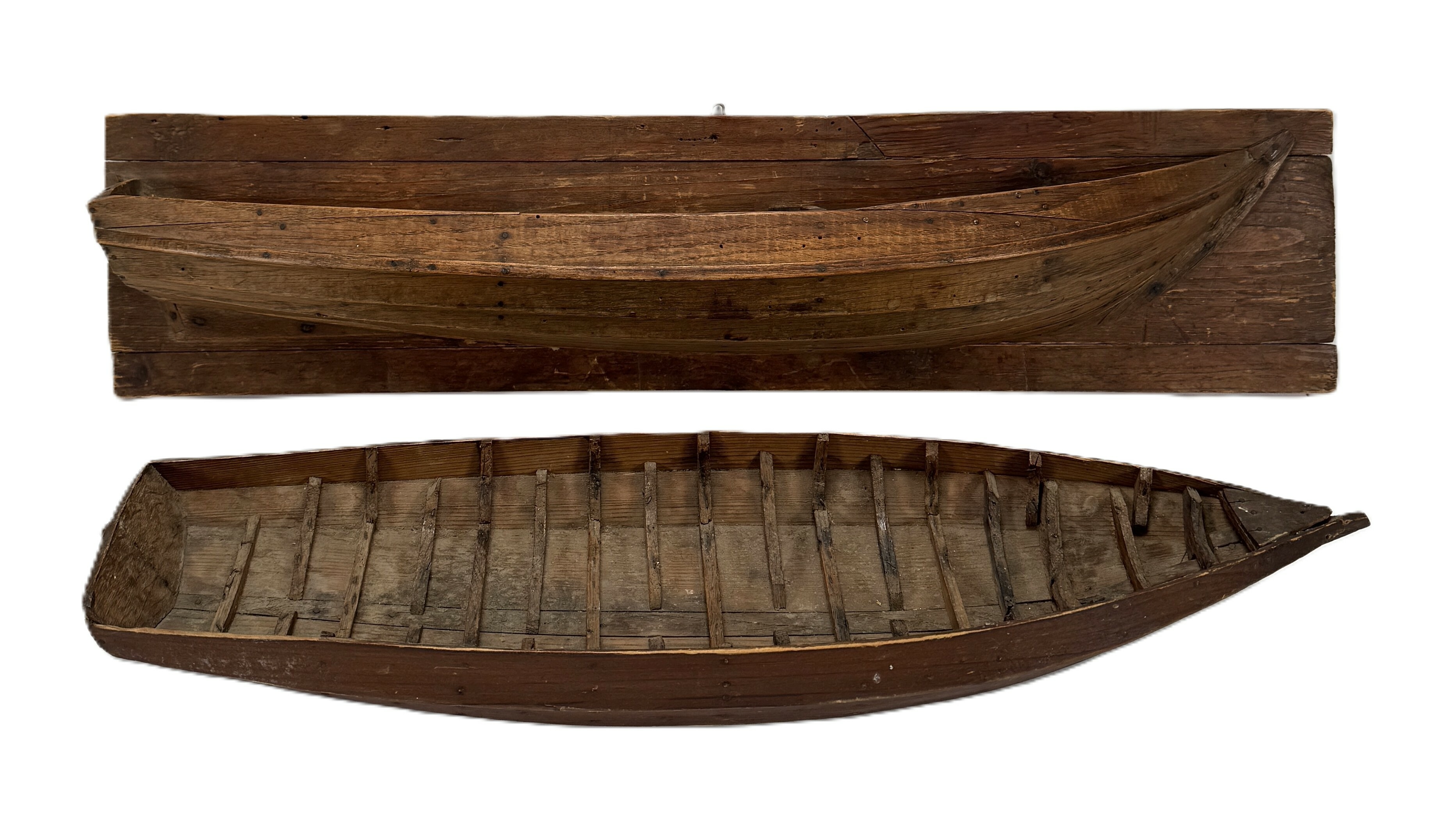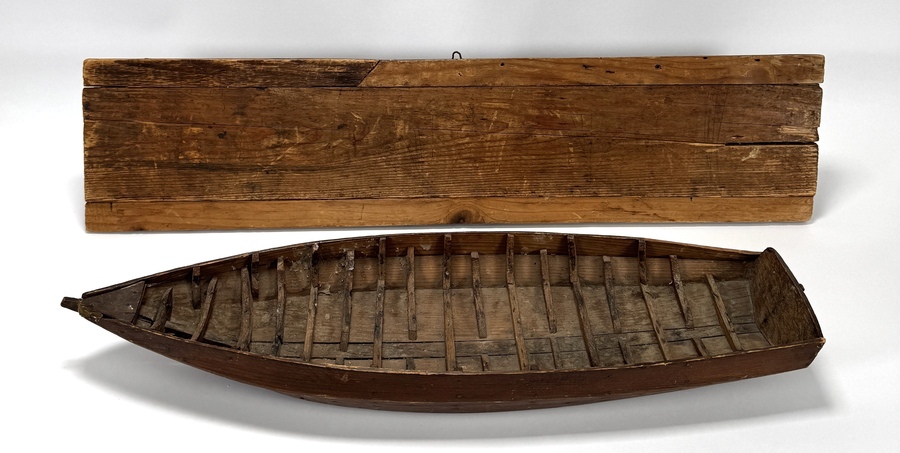 Een houten scheepsbouw halfmodel op een plank en een model van een ondiepe romp met spanten, vervaardigd uit gebeitst hout door middel van overnaadse beplanking. De maritieme voorwerpen dateren uit de eerste helft 20e eeuw (circa 1900-1940.) Registreren nu en bied eenvoudig online mee op de scheepsmodellen! |