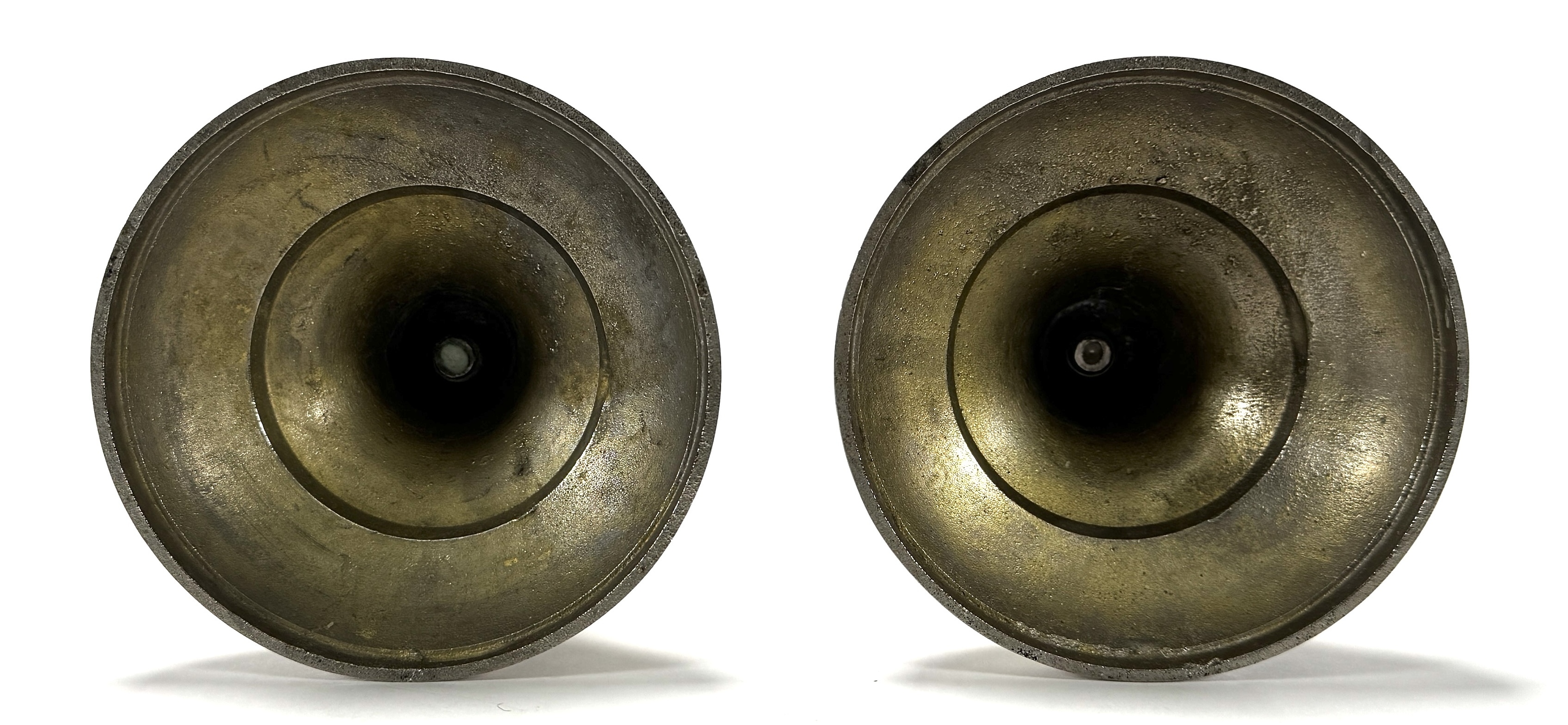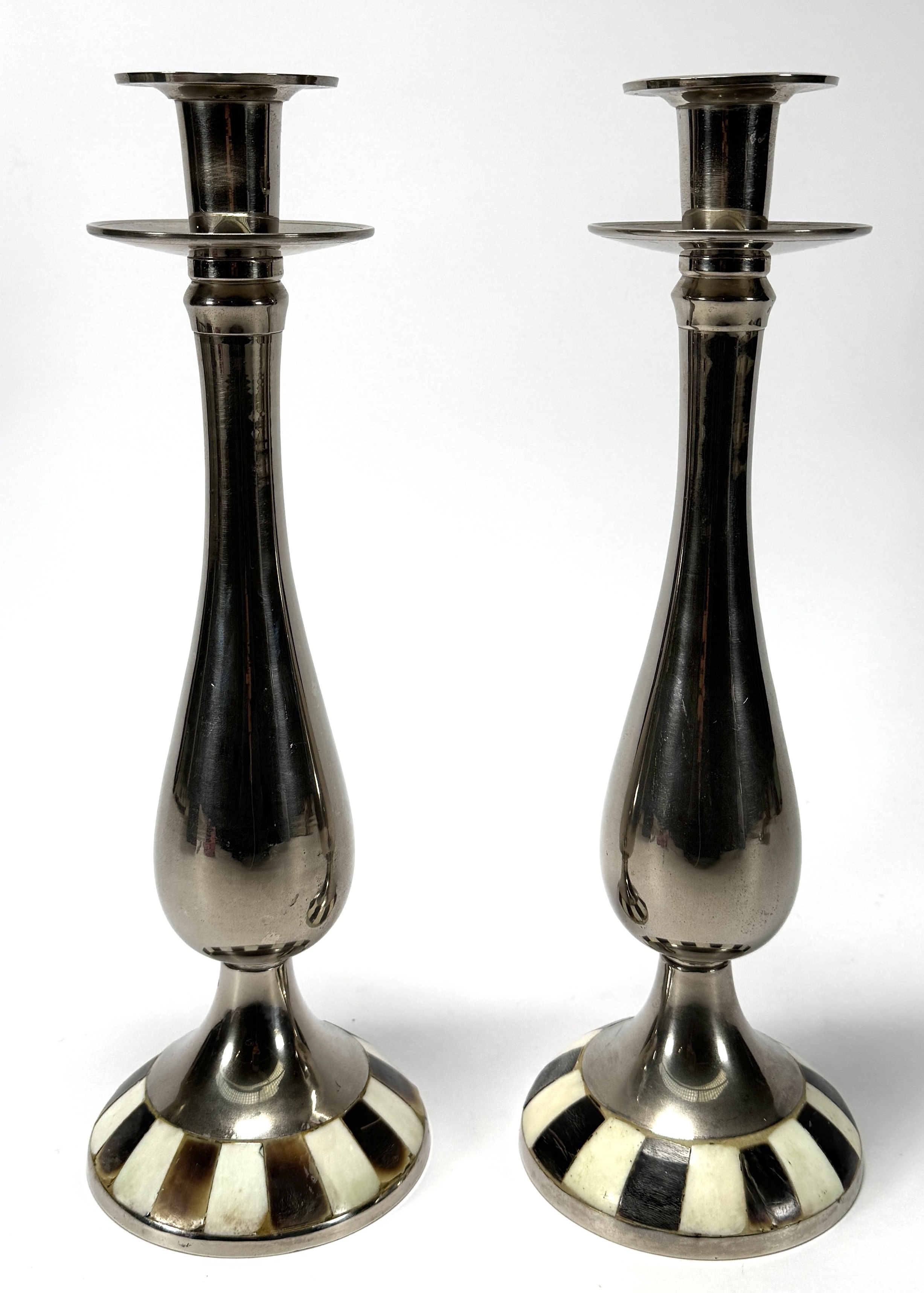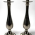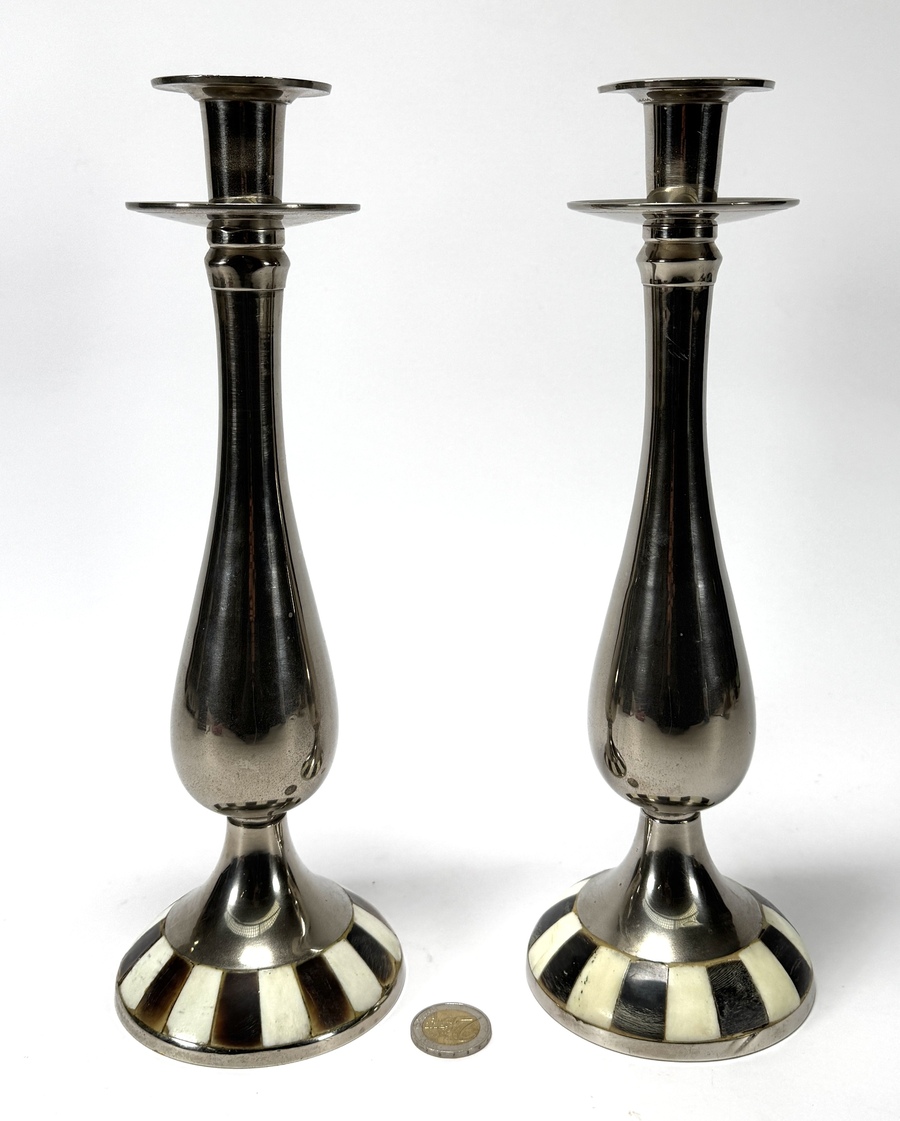 Kandelaren van verzilverd metaal, vervaardigd in de tweede helft van de twintigste eeuw. De slanke, balustervormige stammen rusten op een ronde voet met geometrisch inlegwerk van been en hoorn. Deze kandelaars zelf beoordelen? Je bent welkom op onze kijkdagen op 28, 29 en 30 november! |